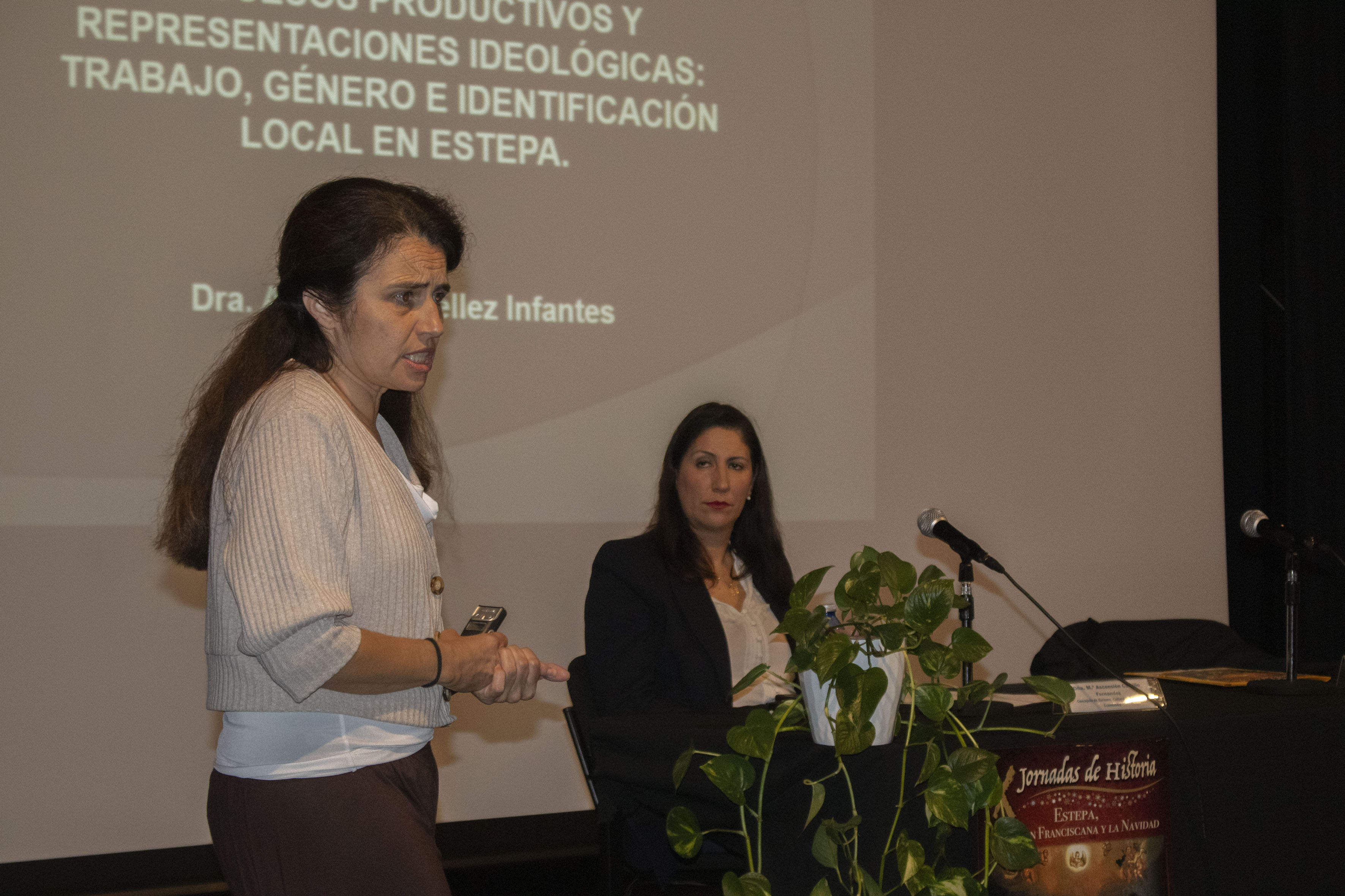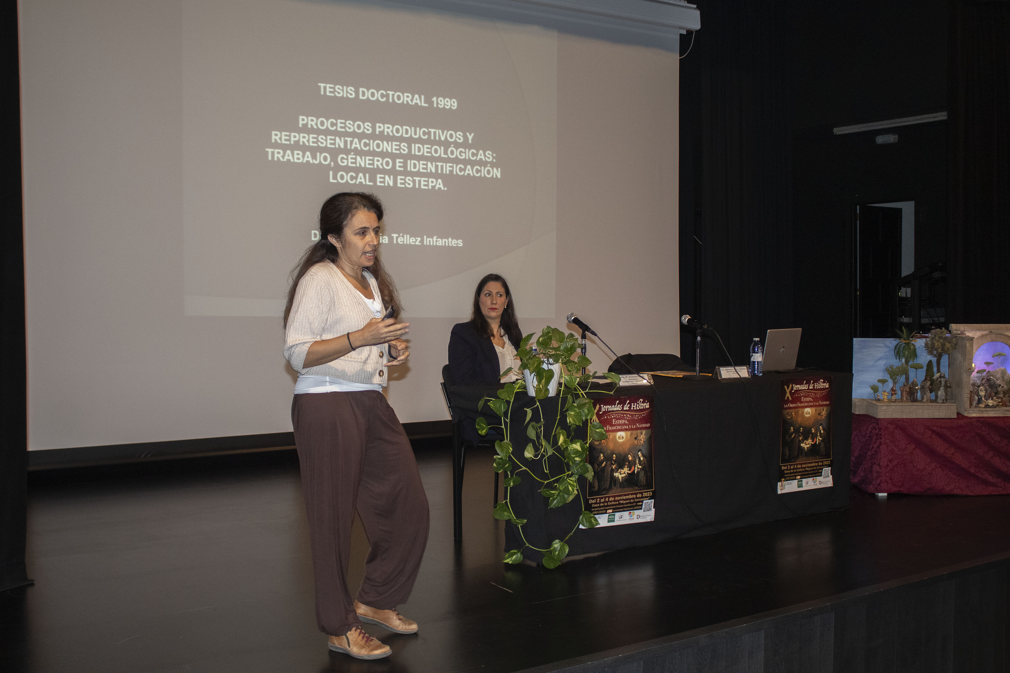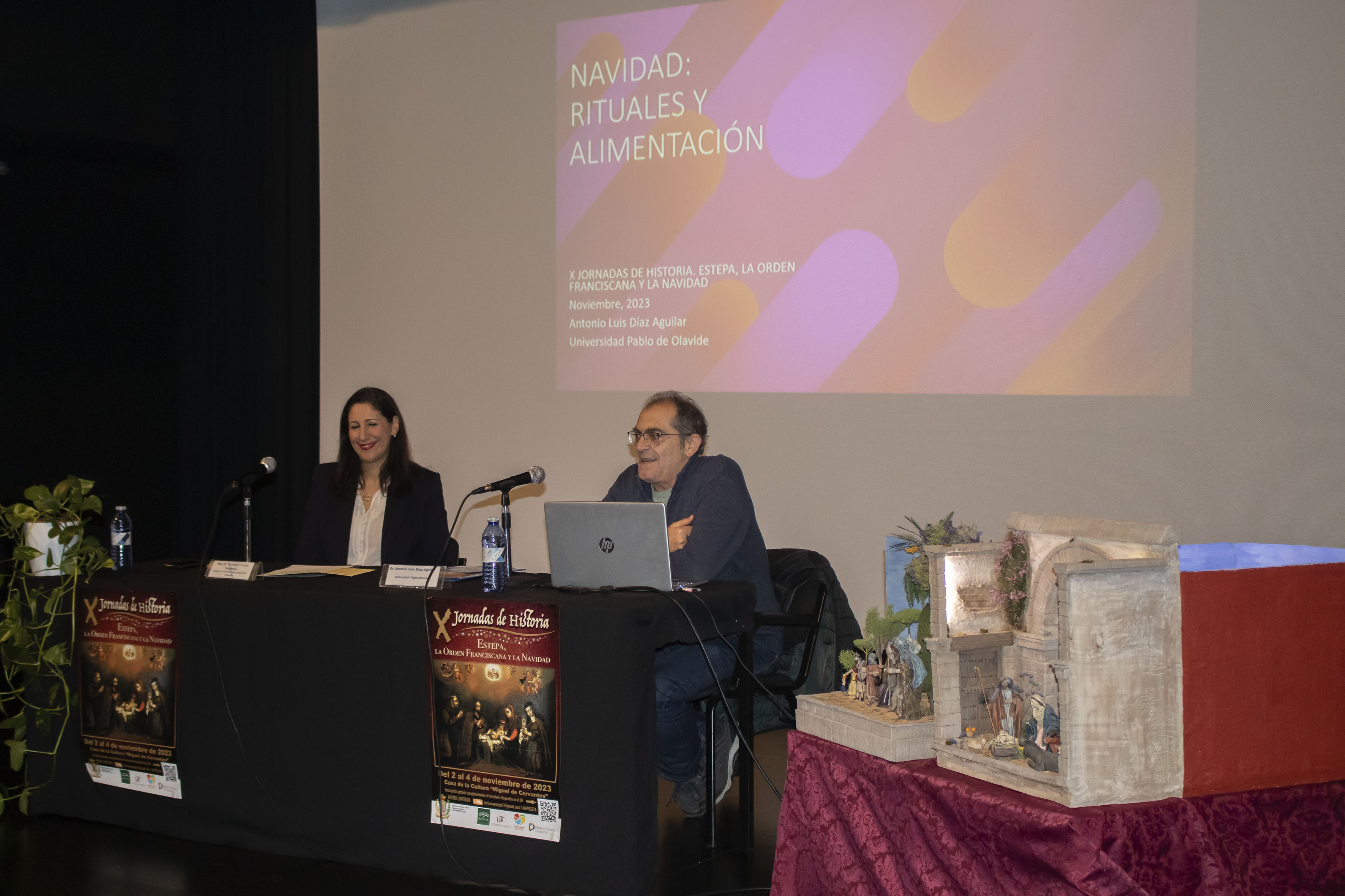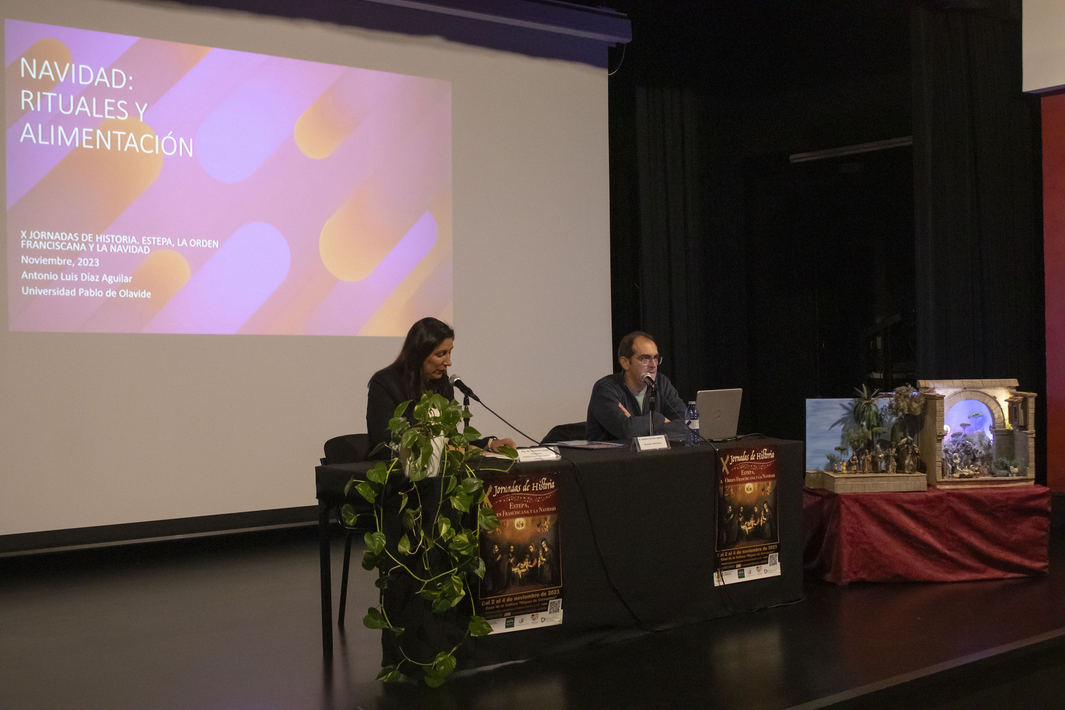 La sesión de esta mañana ha estado compuesta por la conferencia "Navidad: Rituales y alimentación" de Antonio Luis Díaz Aguilar, profesor de la Universidad Pablo de Olavide de Sevilla. El cierre a las conferencias lo ha puesto la doctora Anastasia Téllez Infantes, de la Universidad Miguel Hernández de Elche. Se da la grata coincidencia que ambos profesores, Anastasia y Antonio Luis, han sido los redactores del proyecto "El proceso de elaboración del Mantecado de Estepa", y su solicitud a la UNESCO como Patrimonio Inmaterial de la Humanidad. La carrera de Antonio y sobre todo de Anastasia, están muy ligadas a nuestro pueblo, desde que en 1994, la profesora publicara su libro, "Las Matecaderas de Estepa".