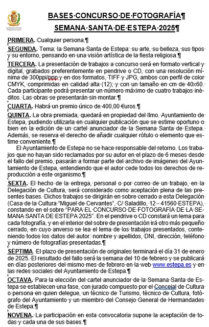 OCTAVA. Para la elección del cartel anunciador de la Semana Santa de Estepa se establecen una fase, con jurado compuesto por el Concejal de Cultura o persona en quien delegue, un técnico de Turismo, técnico de Cultura, fotógrafo del Ayuntamiento y un miembro del Consejo General de Hermandades de Estepa.