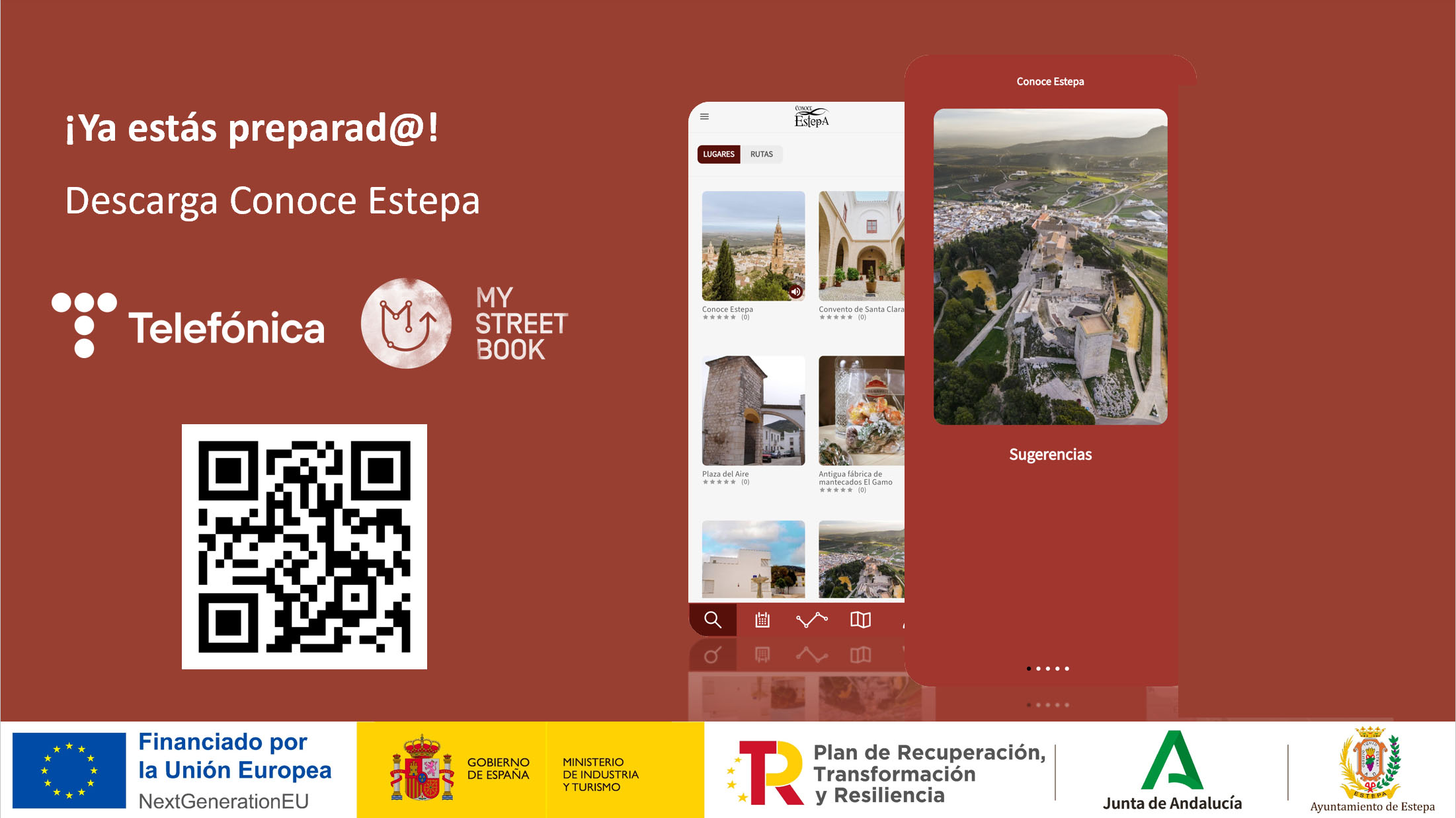 Estas actuaciones están incluidas en el Plan de Sostenibilidad Turística en Destino “Estepa Turística Inteligente”. Plan de recuperación, Transformación y Resiliencia - Financiado por la Unión Europea Next Generation EU». Mecanismo de Recuperación y Resiliencia, establecido por el Reglamento (UE) 2021/241 del Parlamento Europeo y del Consejo, de 12 de febrero de 2021, así como la referencia al Componente 14, Inversión 1, del PRTR, gestionado por el Ministerio de Industria y Turismo.