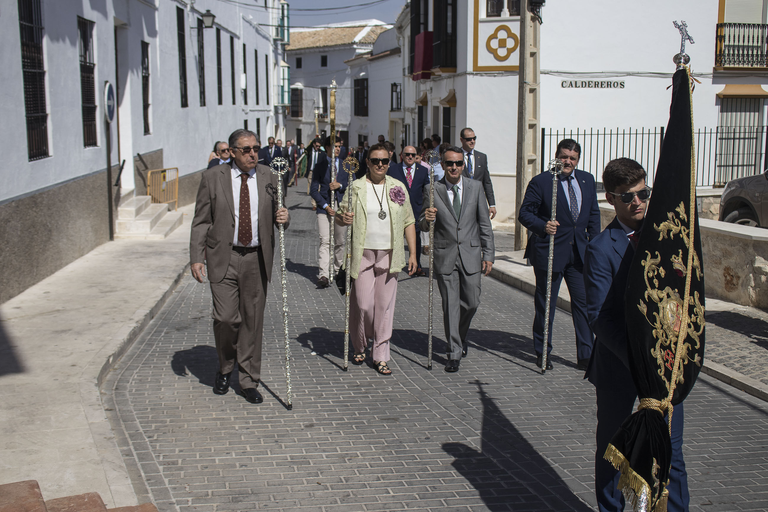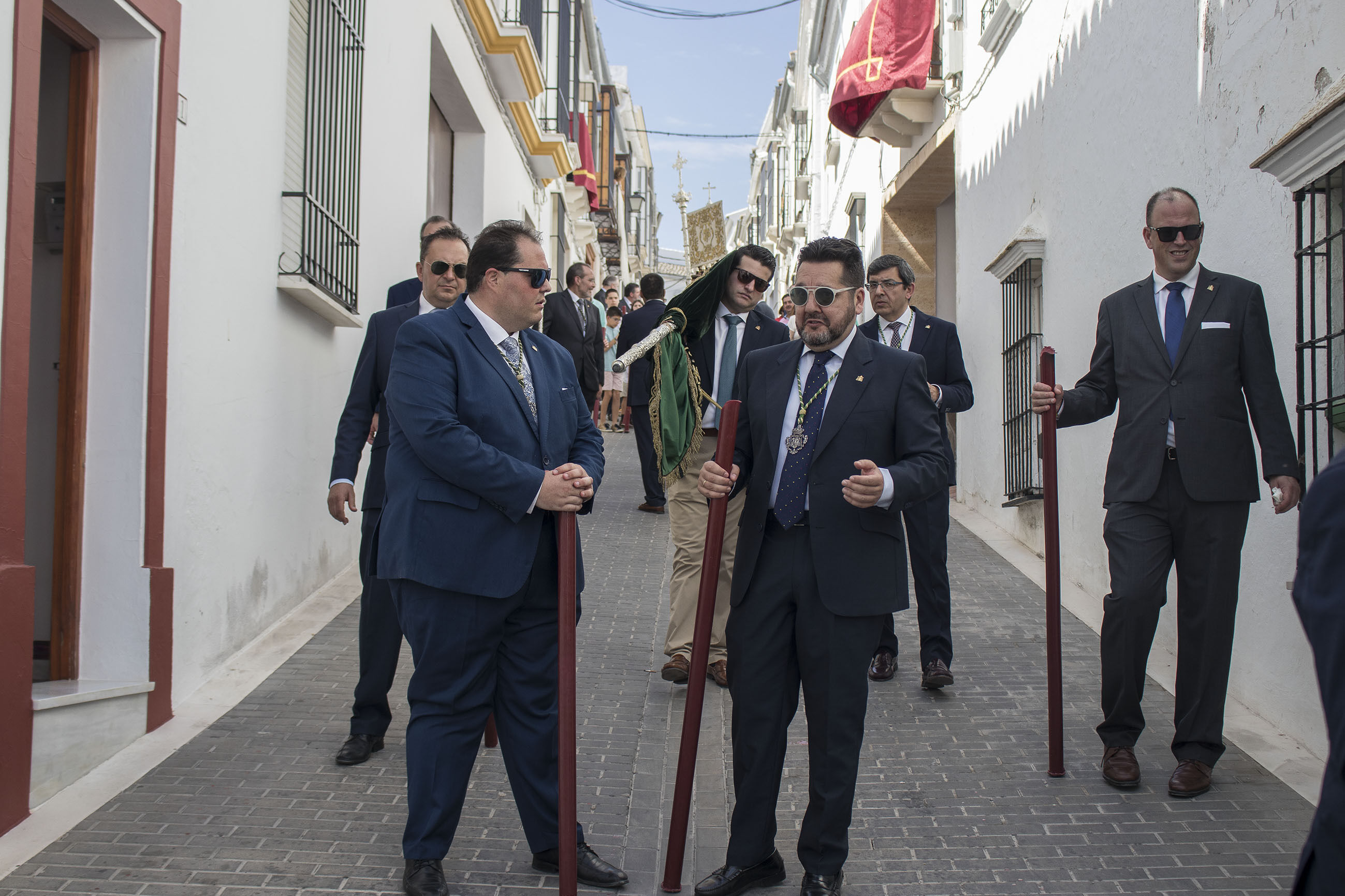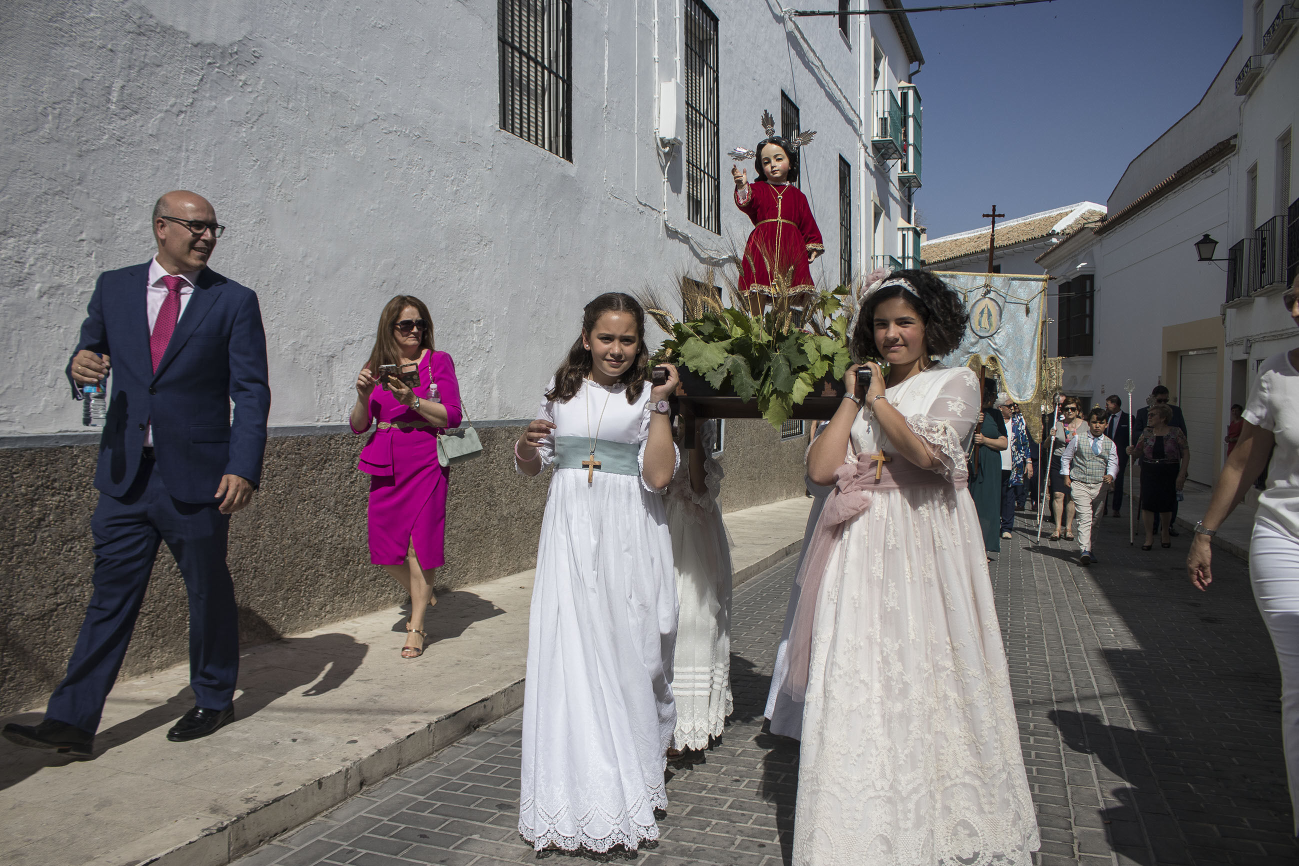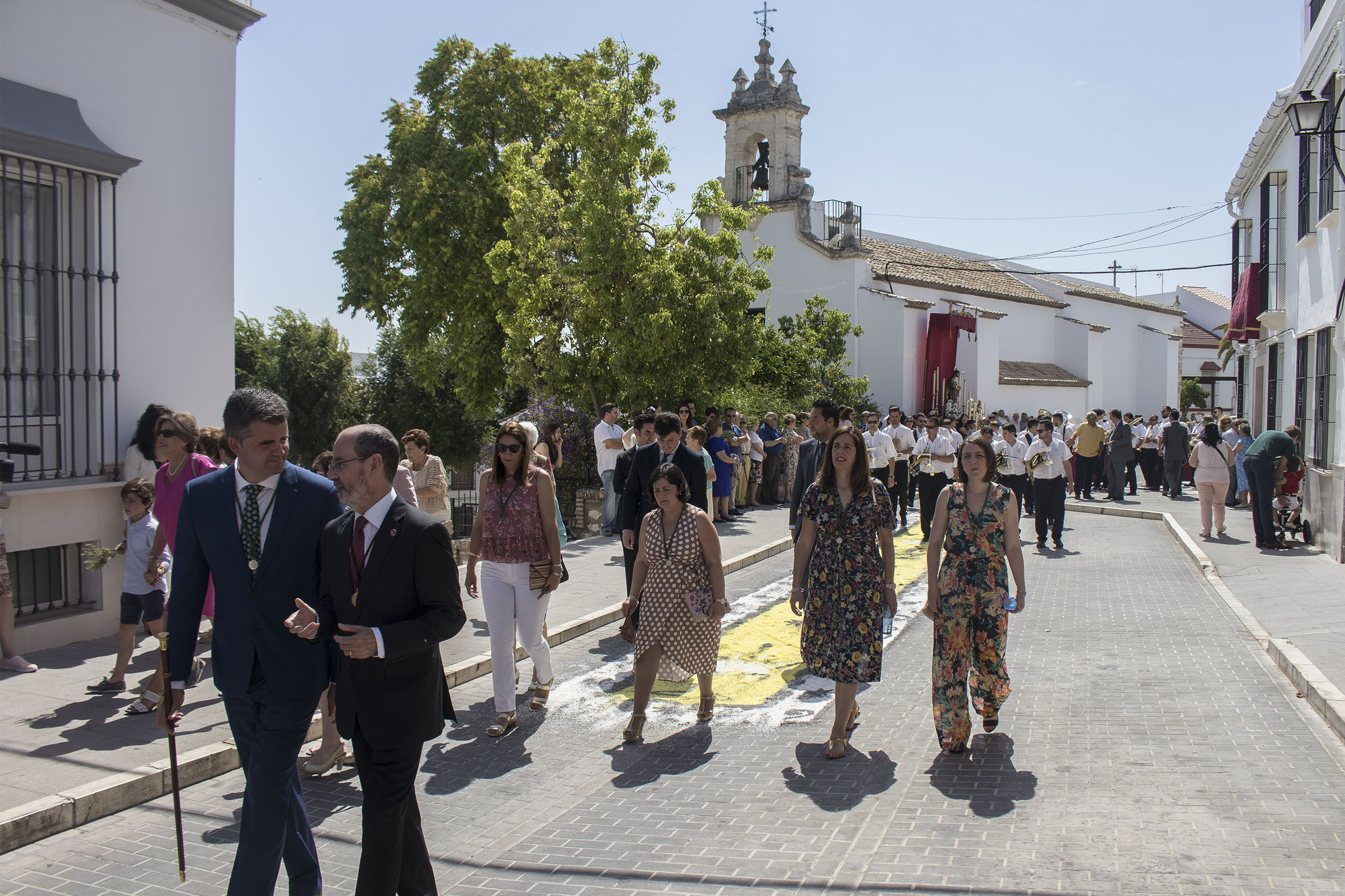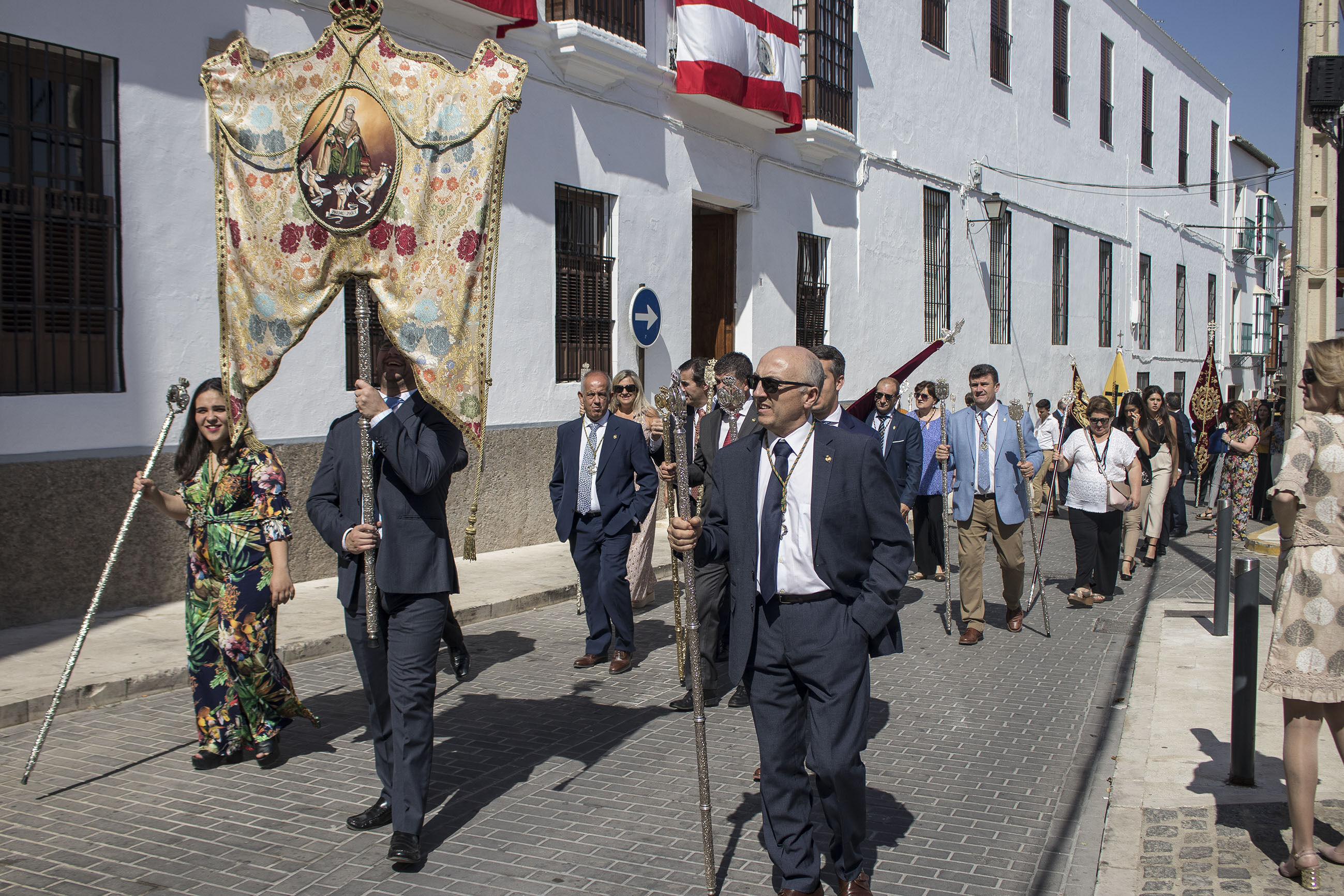 La comitiva iba encabezada por las niñas y niños de Primera Comunión, seguidas de las Hermandades de Gloria y de Pasión de nuestra ciudad. El alcalde, portando la vara de mando de la ciudad, ha acompañado, junto a otros miembros de la Corporación y presidente del Consejo General de Hermandades, a esta procesión en un caluroso día de este principio de verano.