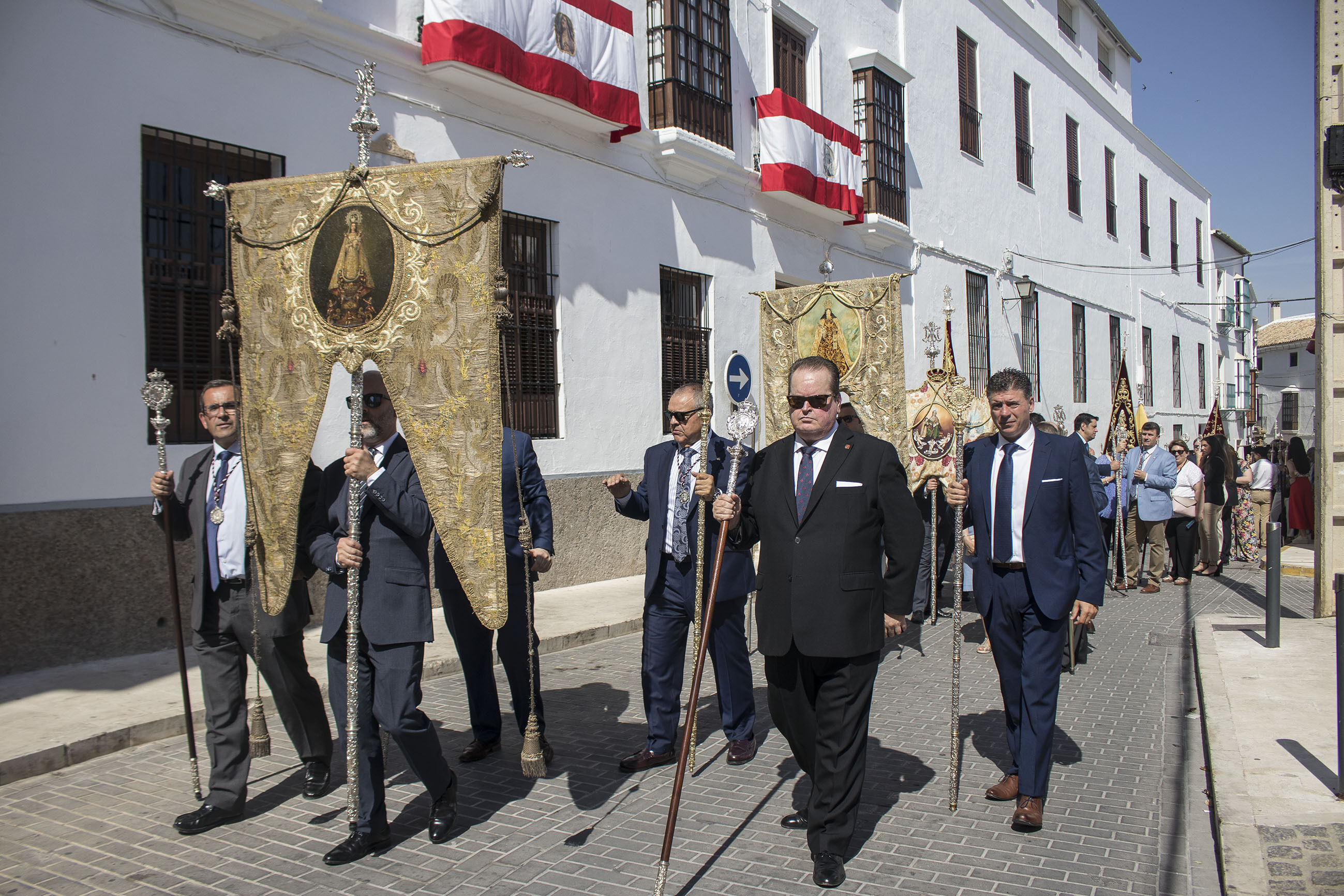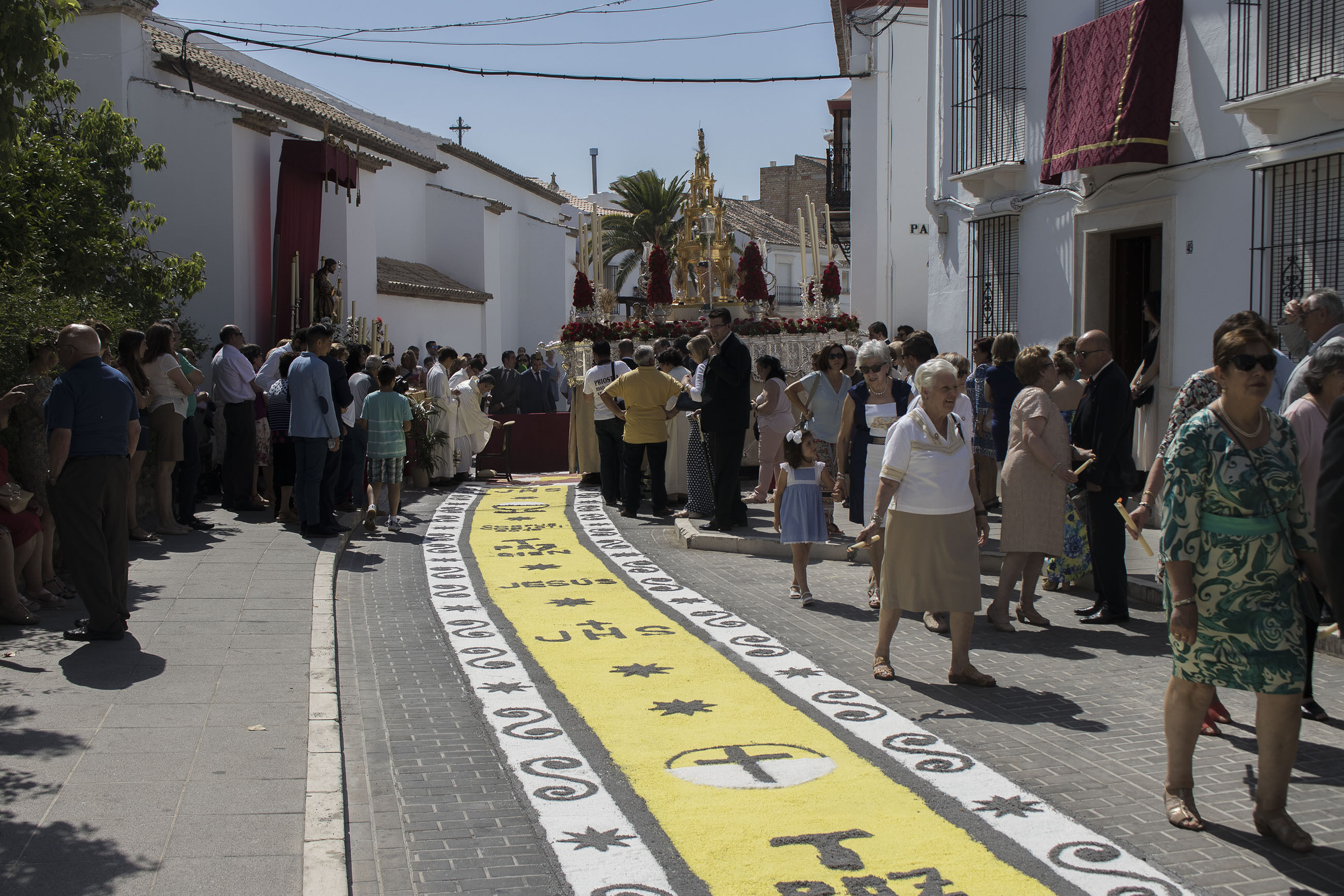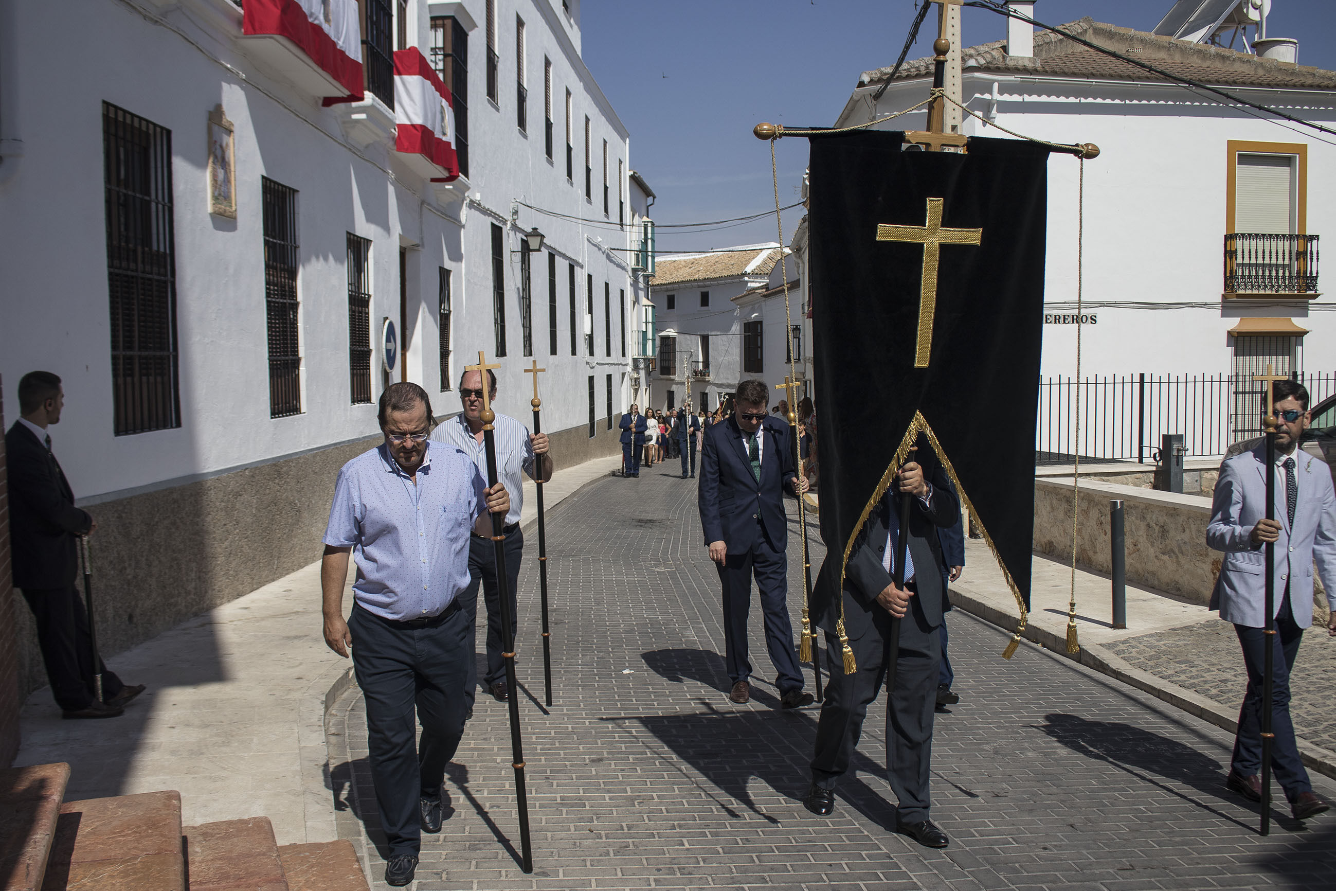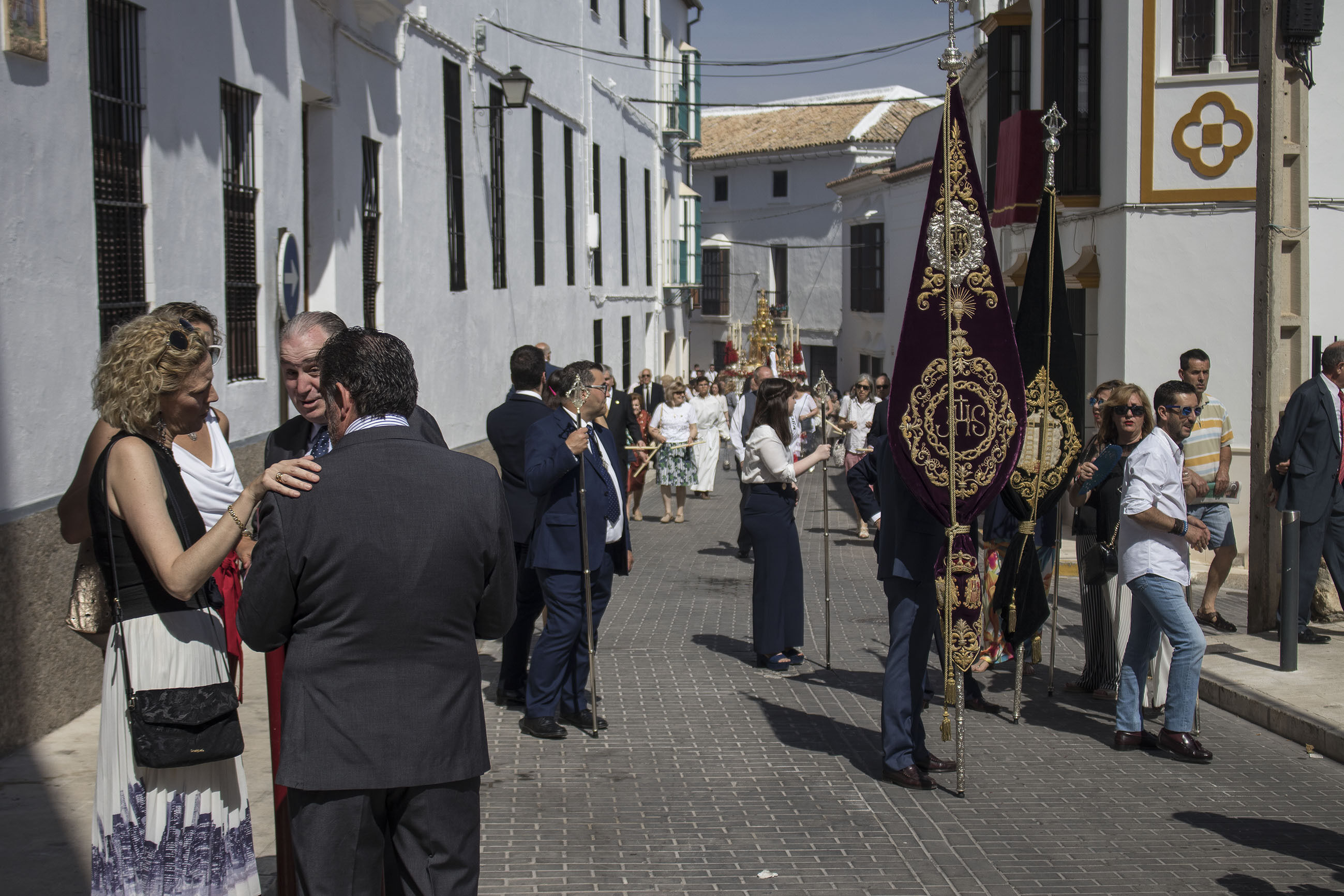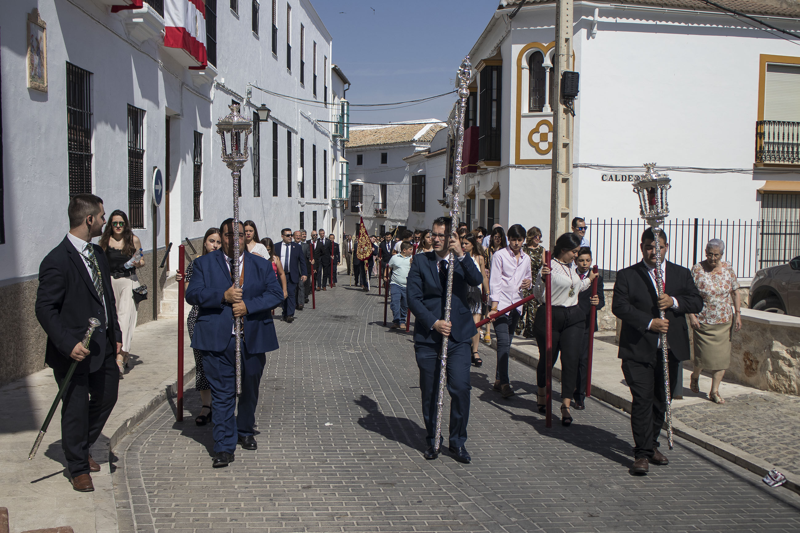 La comitiva iba encabezada por las niñas y niños de Primera Comunión, seguidas de las Hermandades de Gloria y de Pasión de nuestra ciudad. El alcalde, portando la vara de mando de la ciudad, ha acompañado, junto a otros miembros de la Corporación y presidente del Consejo General de Hermandades, a esta procesión en un caluroso día de este principio de verano.