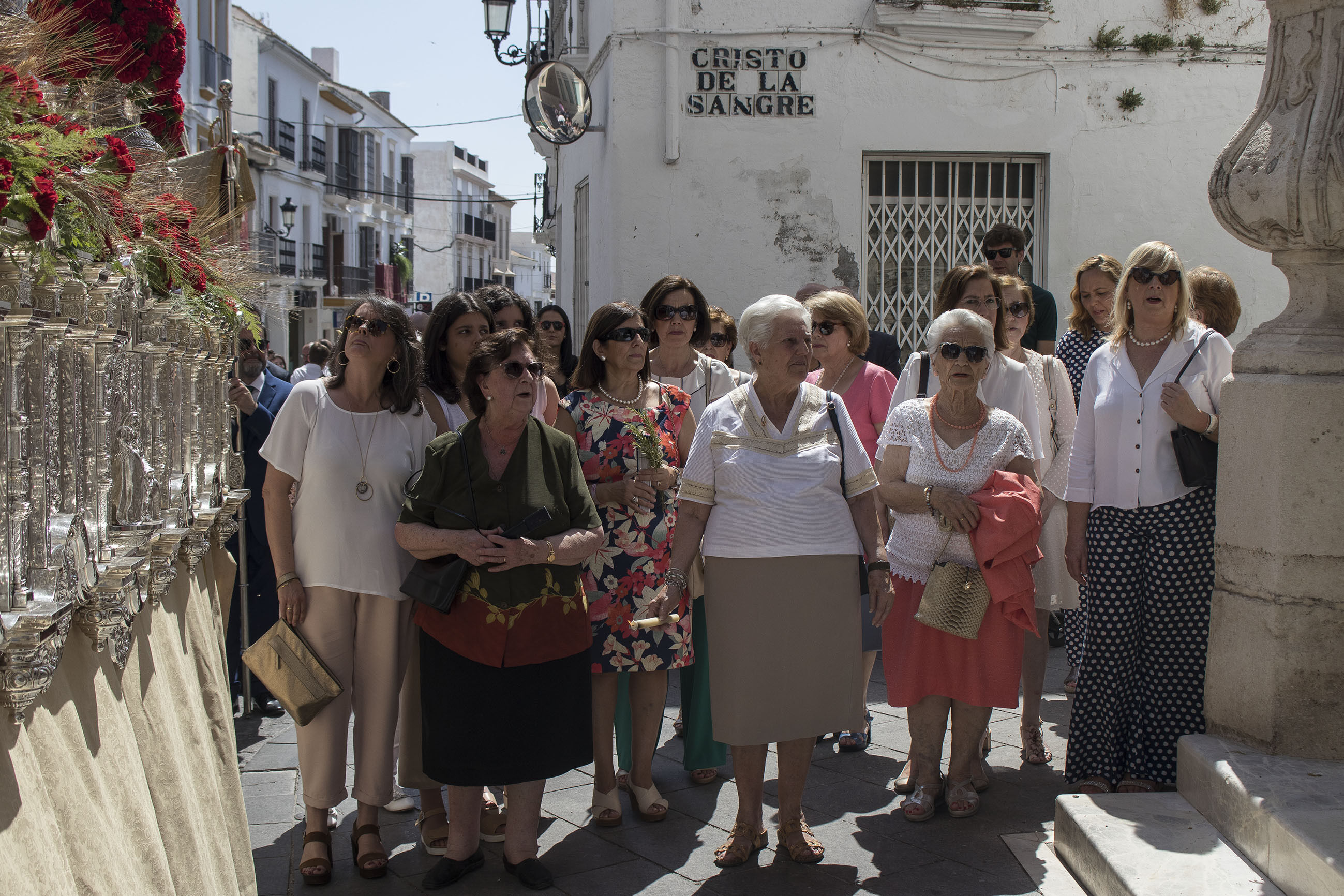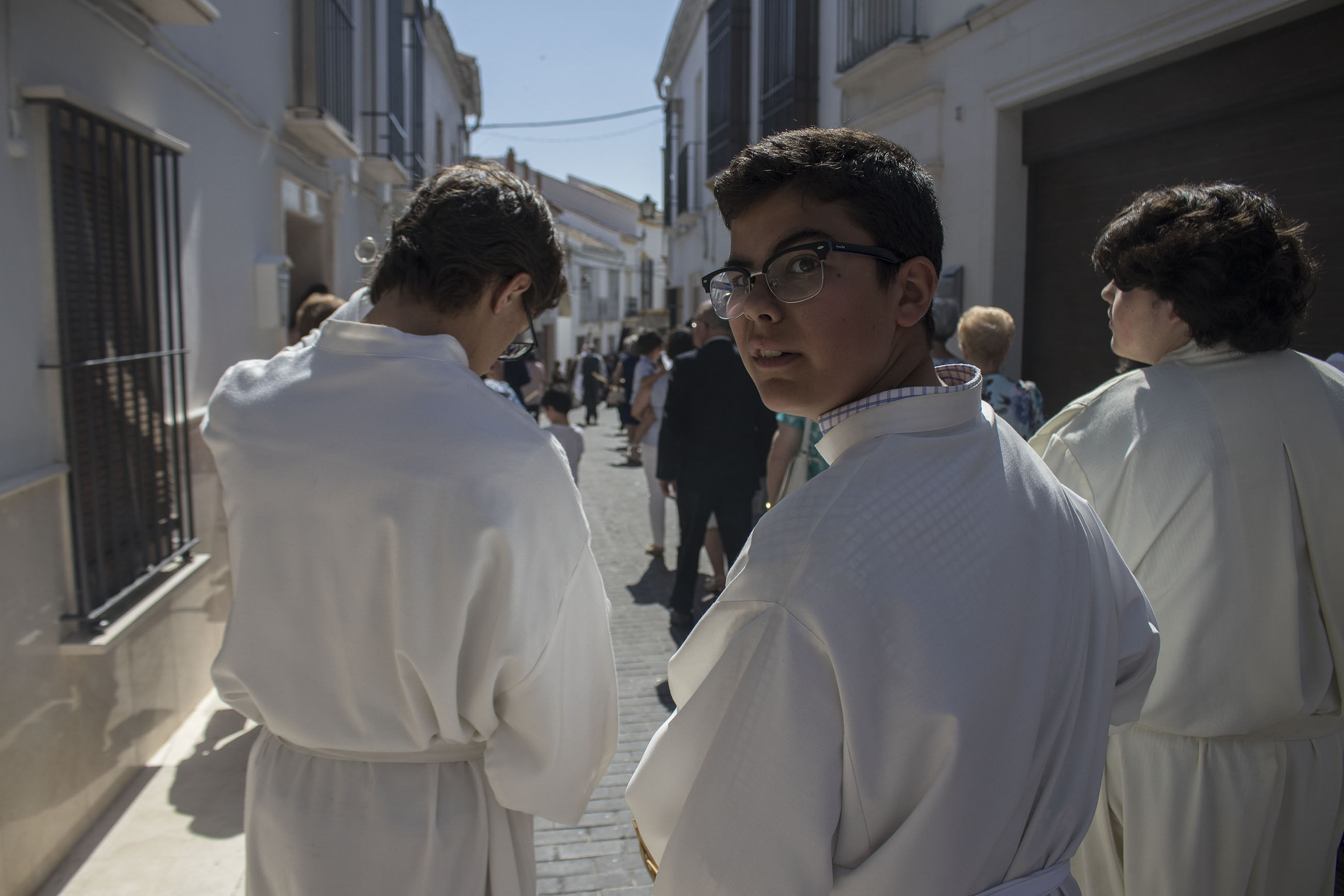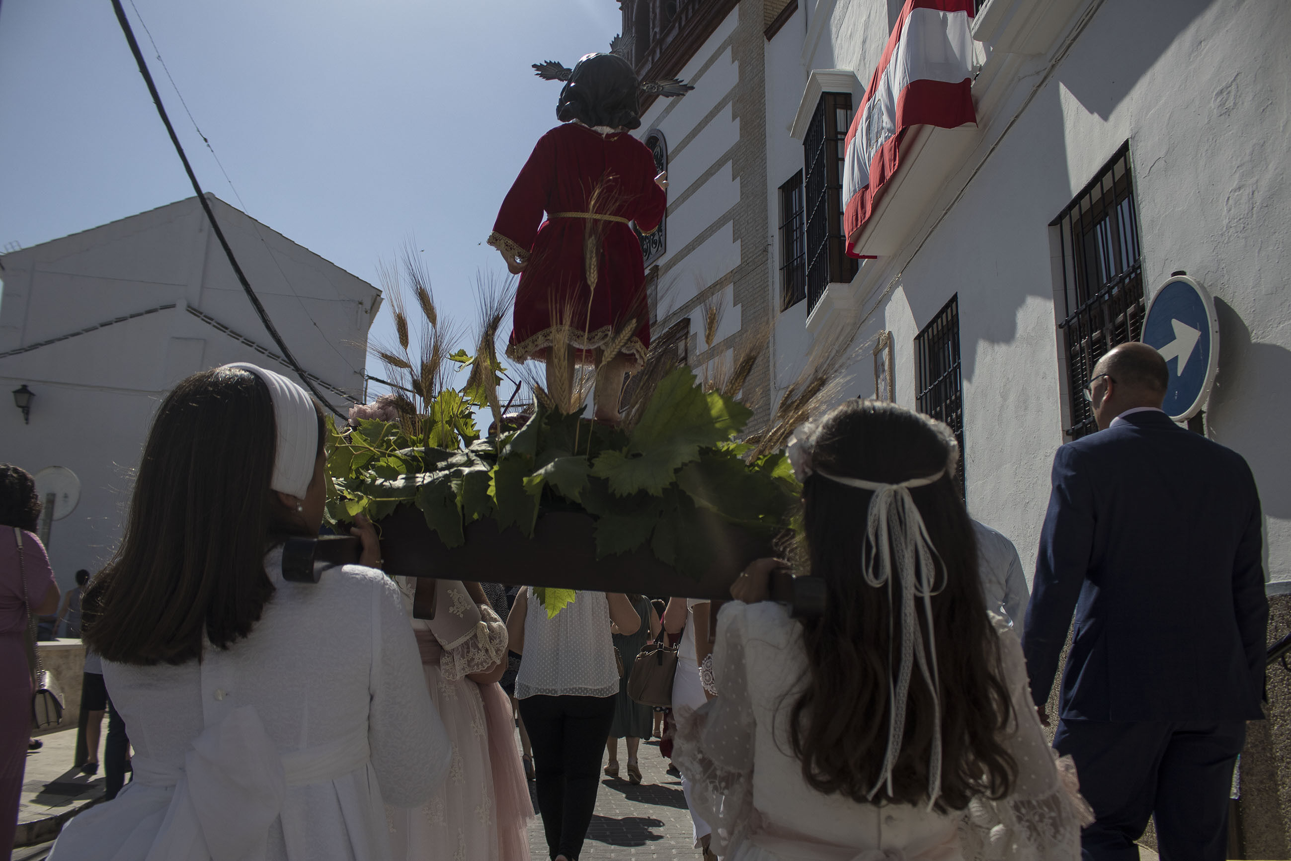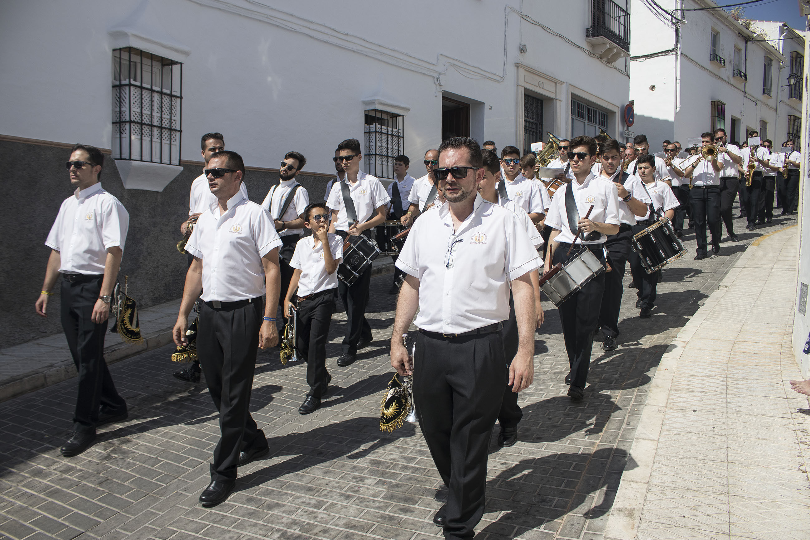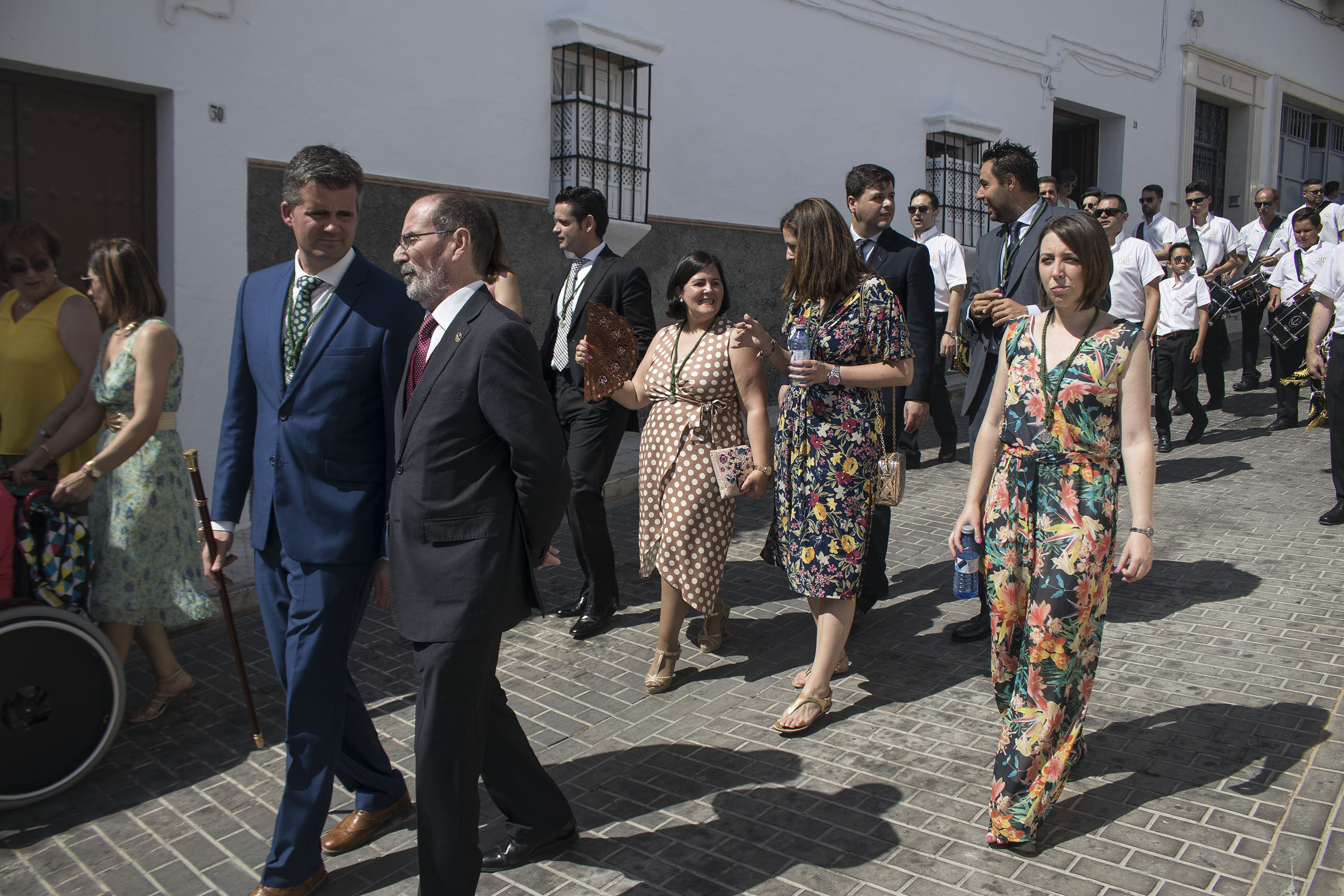 La comitiva iba encabezada por las niñas y niños de Primera Comunión, seguidas de las Hermandades de Gloria y de Pasión de nuestra ciudad. El alcalde, portando la vara de mando de la ciudad, ha acompañado, junto a otros miembros de la Corporación y presidente del Consejo General de Hermandades, a esta procesión en un caluroso día de este principio de verano.