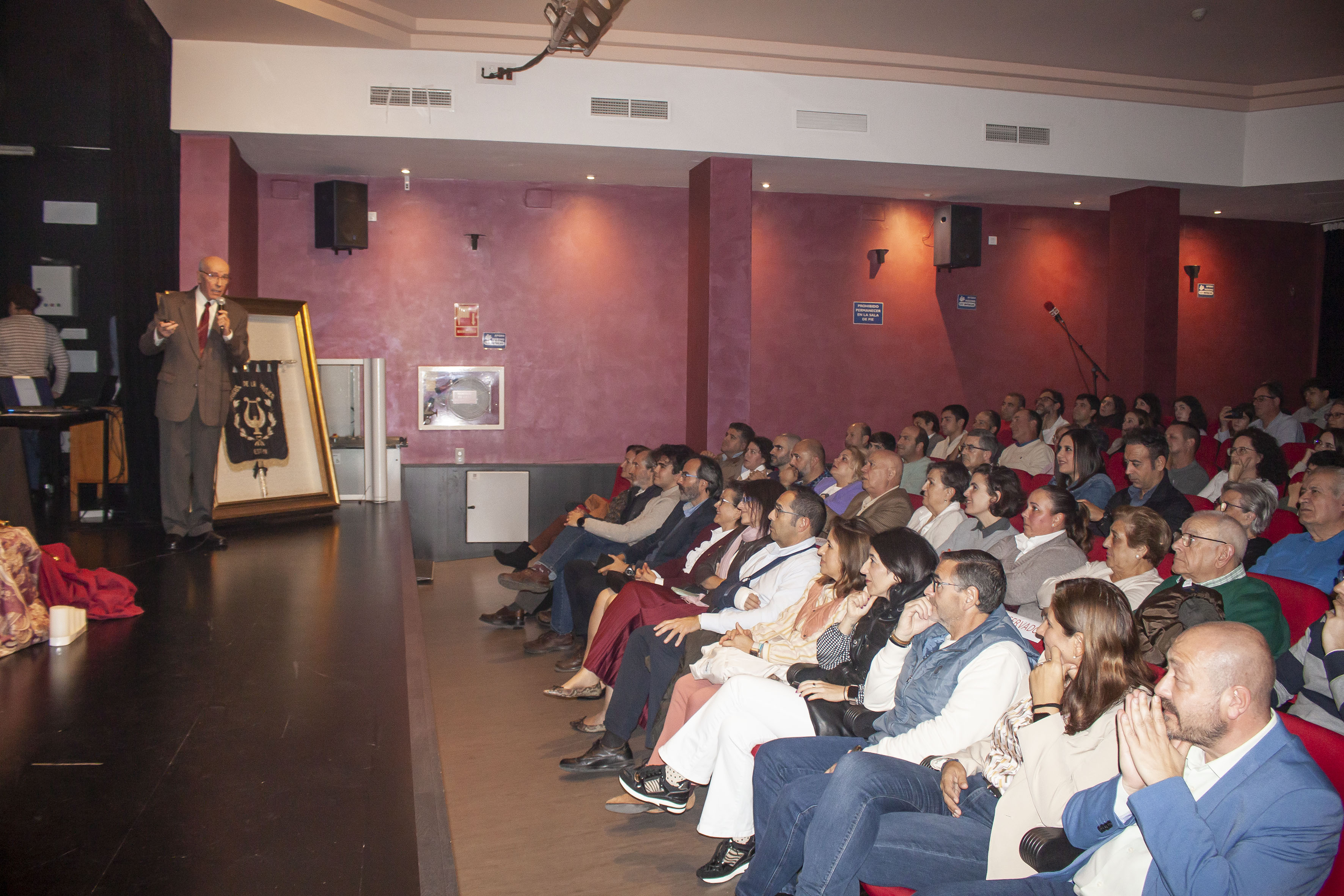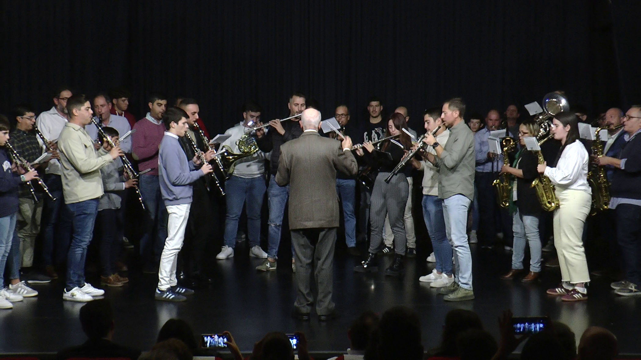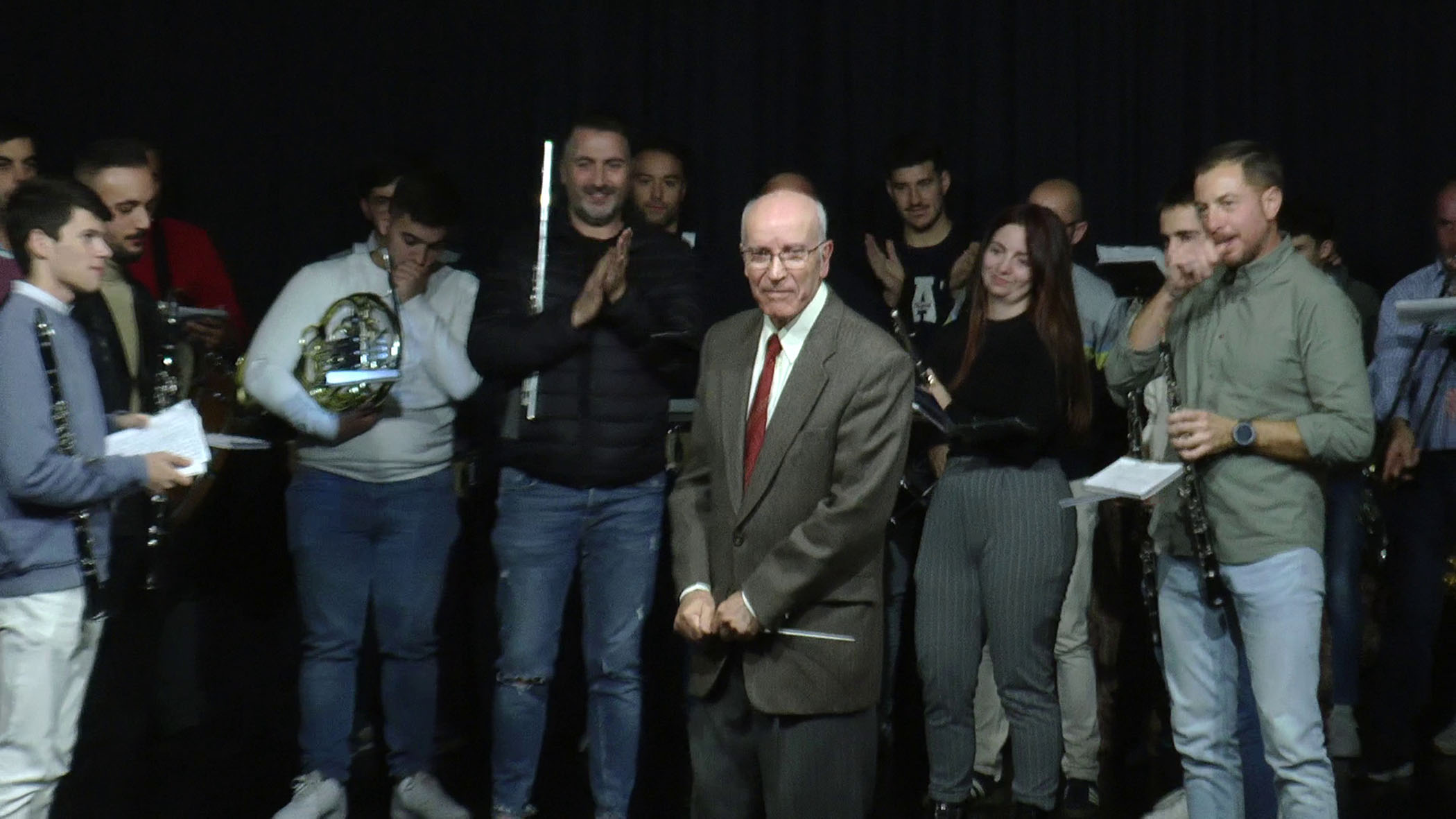 El maestro fue gratamente sorprendido por sus viejos alumnos y componentes de la banda a los que pudo dirigir por última vez al compás de la música que interpretaron sobre el escenario del salón de actos de la casa de la cultura Miguel de Cervantes.