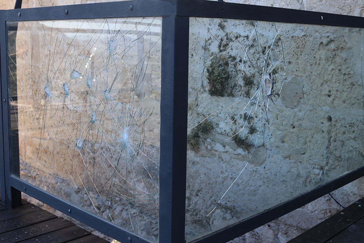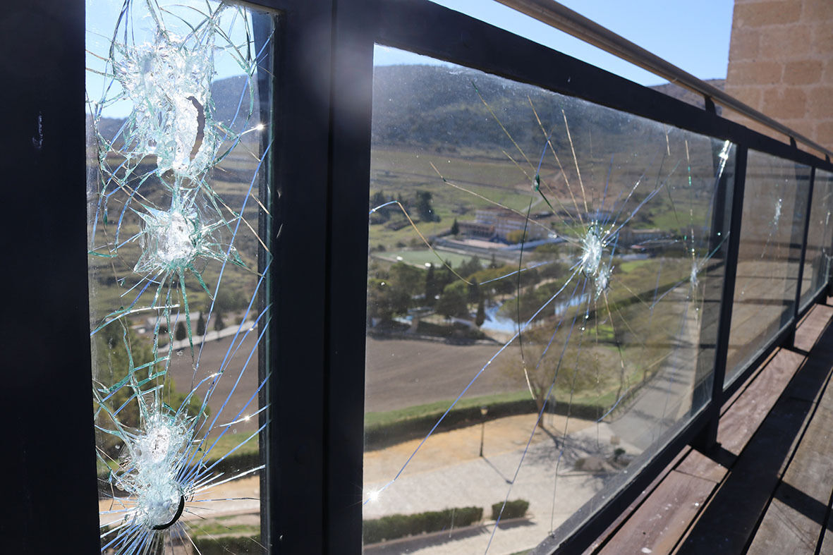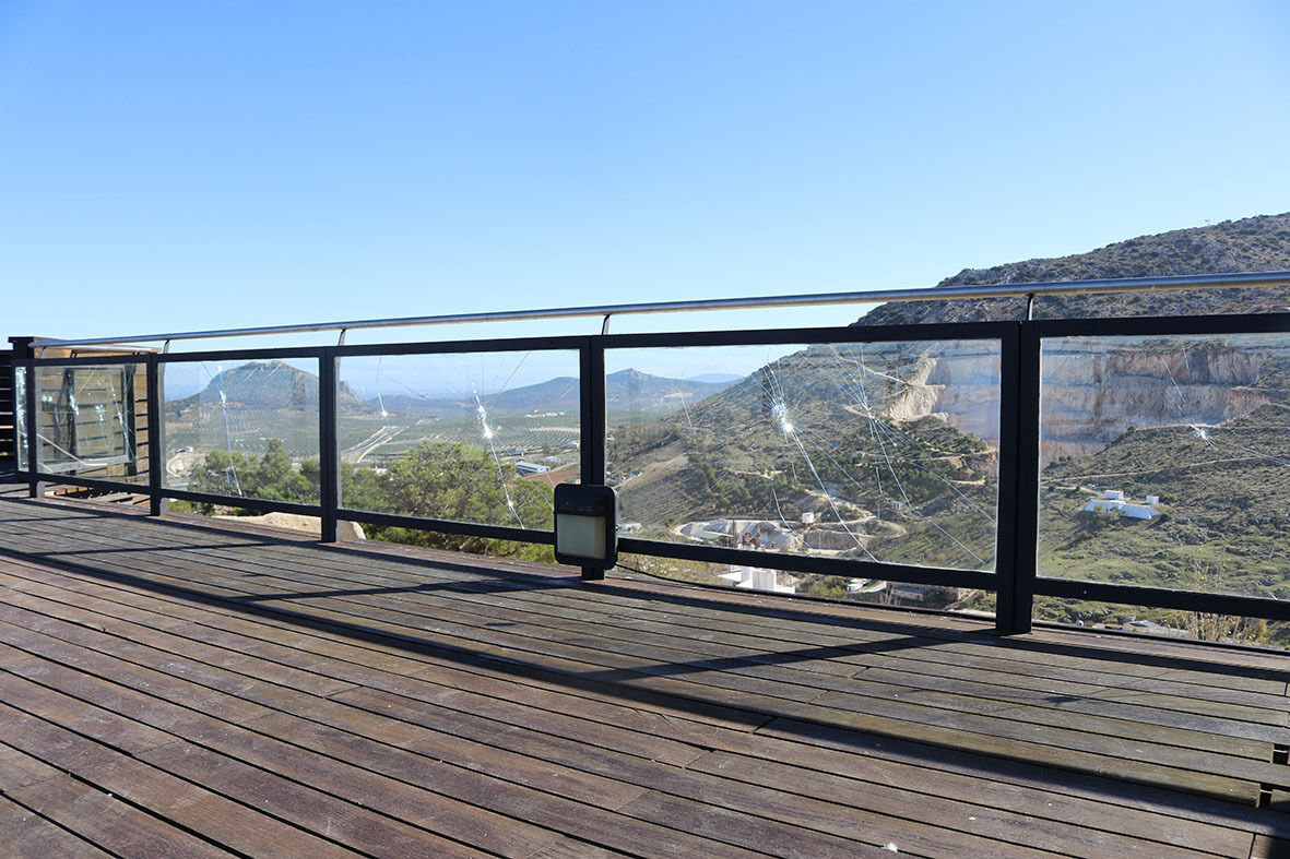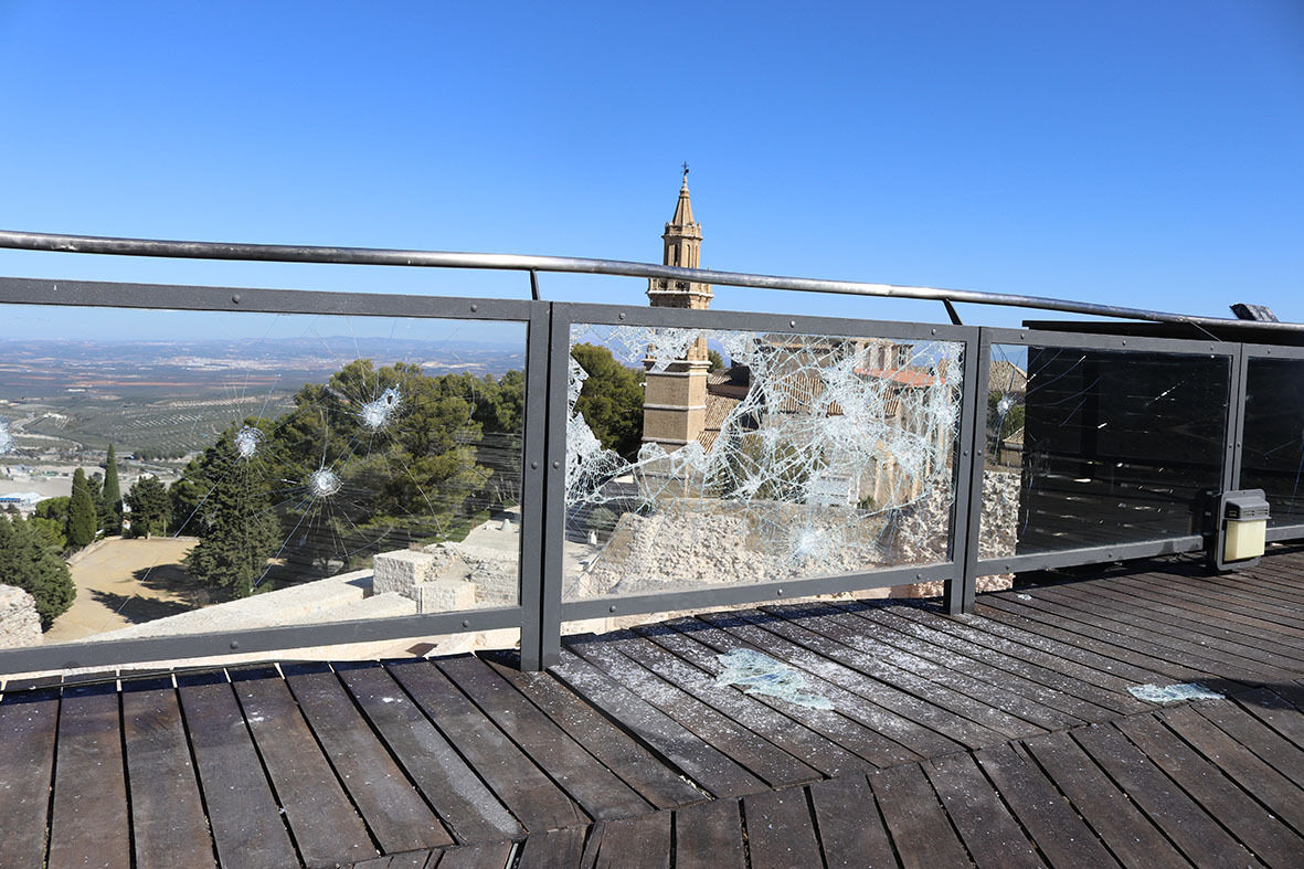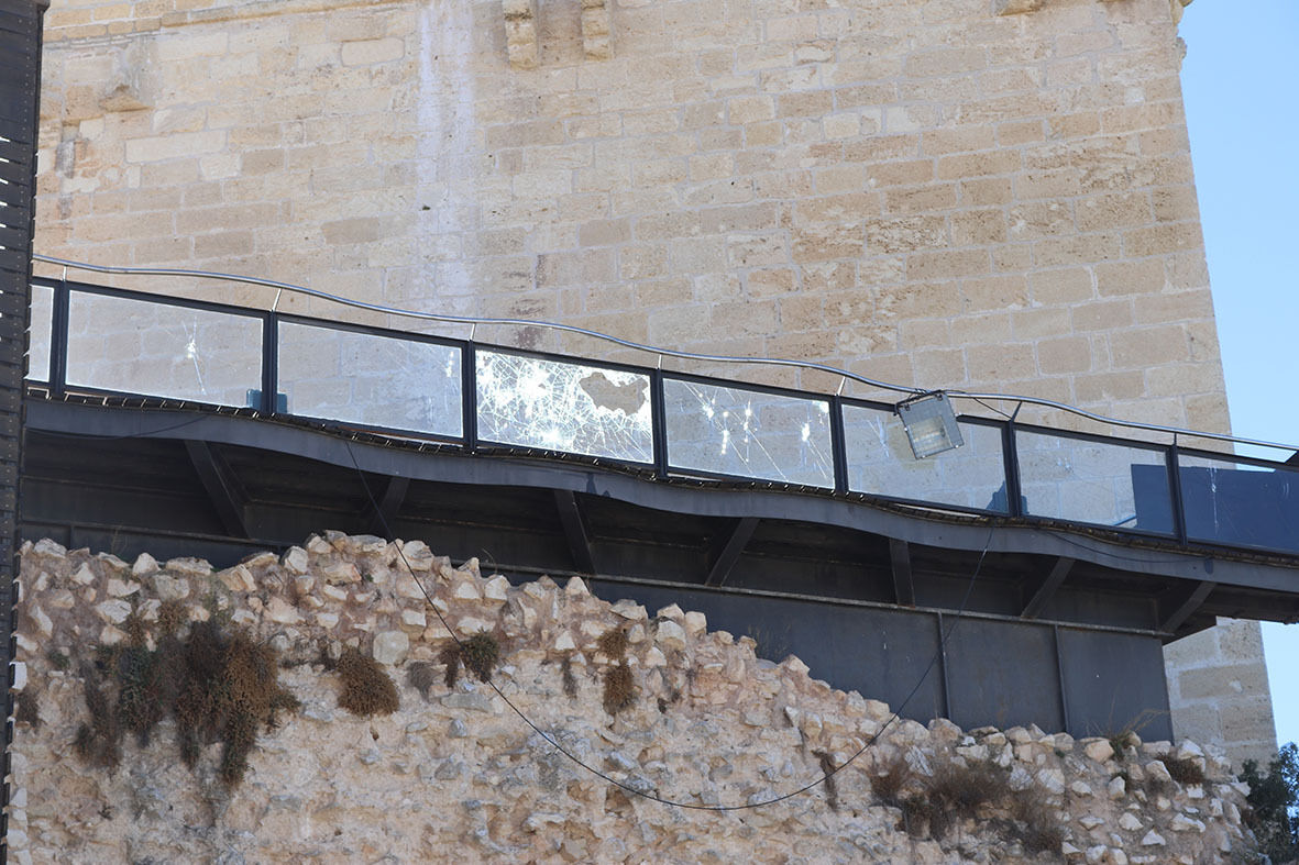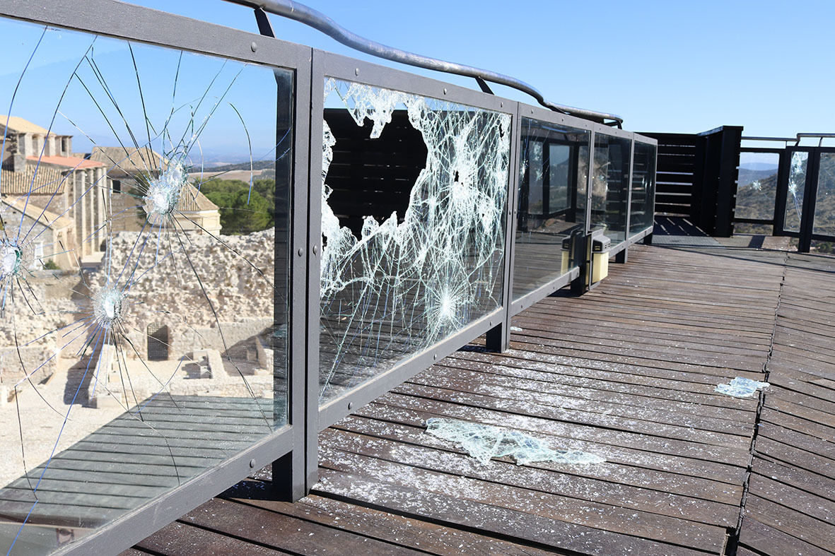 De nuevo un grupo de individuos ha actuado contra nuestro Patrimonio. Esta vez ha sido en el mirador de la Torre del Homenaje. En la pasada noche del domingo han subido escalando por las maderas del mirador y con una herramienta que han abandonado junto a la torre se han entretenido en romper todos y cada uno de los cristales de seguridad que protejen la baranda del mirador.