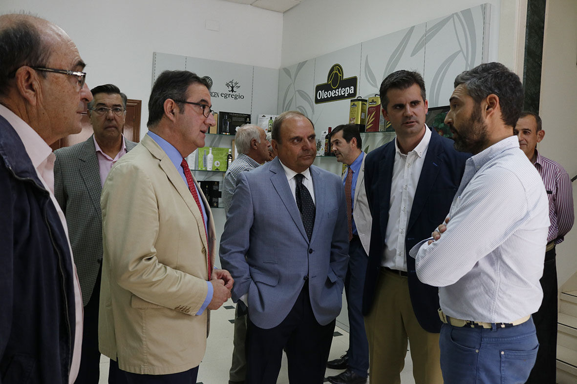 Rodrigo Sánchez Haro, Consejero de Agricultura y Pesca de la Junta de Andalucía ha visitado esta mañana la sede de Oleoestepa para mantener un encuentro con el sector del Aceite de Oliva Virgen Extra de nuestra comarca. El alcalde de Estepa, Antonio Jesús Muñoz ha dado la bienvenida al consejero junto a Alfredo Raya, Presidente de Oleoestepa y el gerente Alvaro Olavarría. Al acto han asitido igualmente la concejala de Agricultura, Asunción Llamas y el concejal de Infraestructuras, Javier Fernández.
