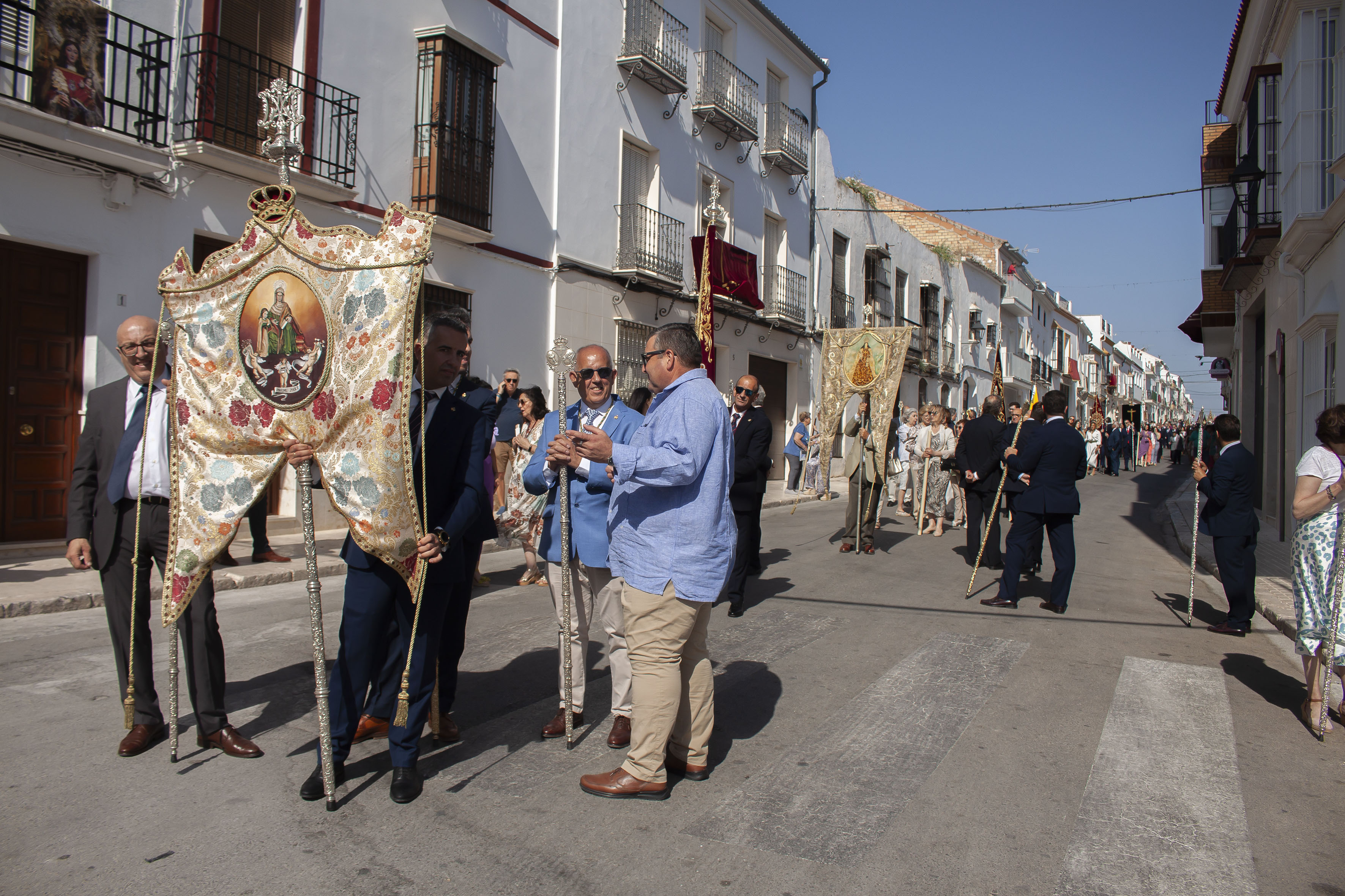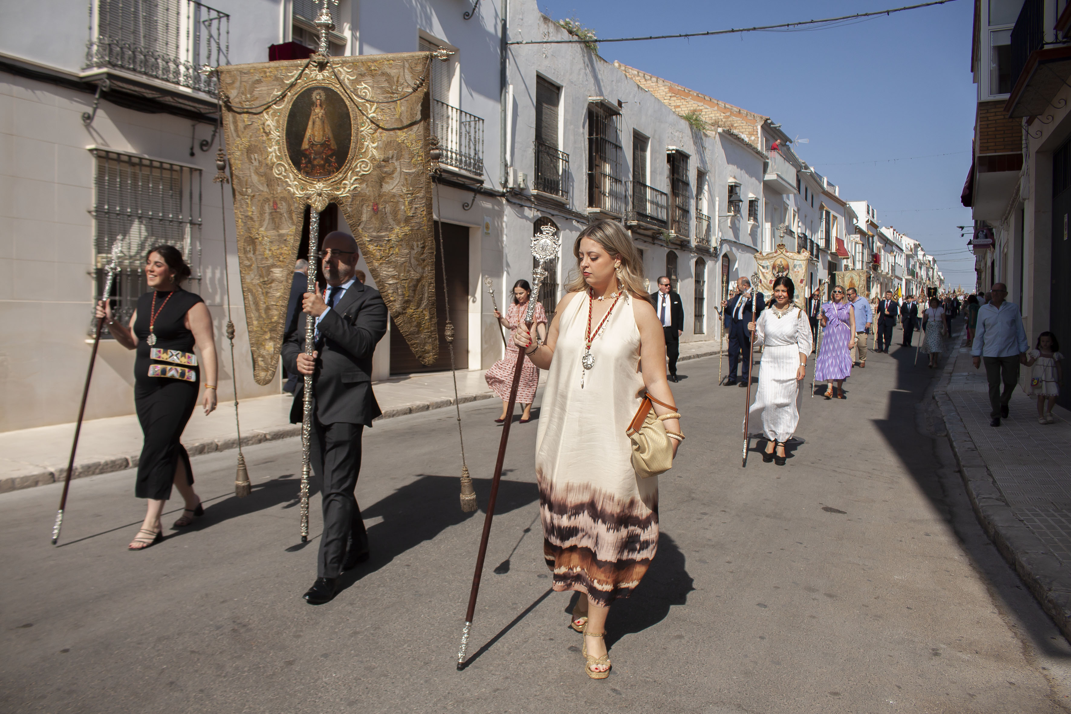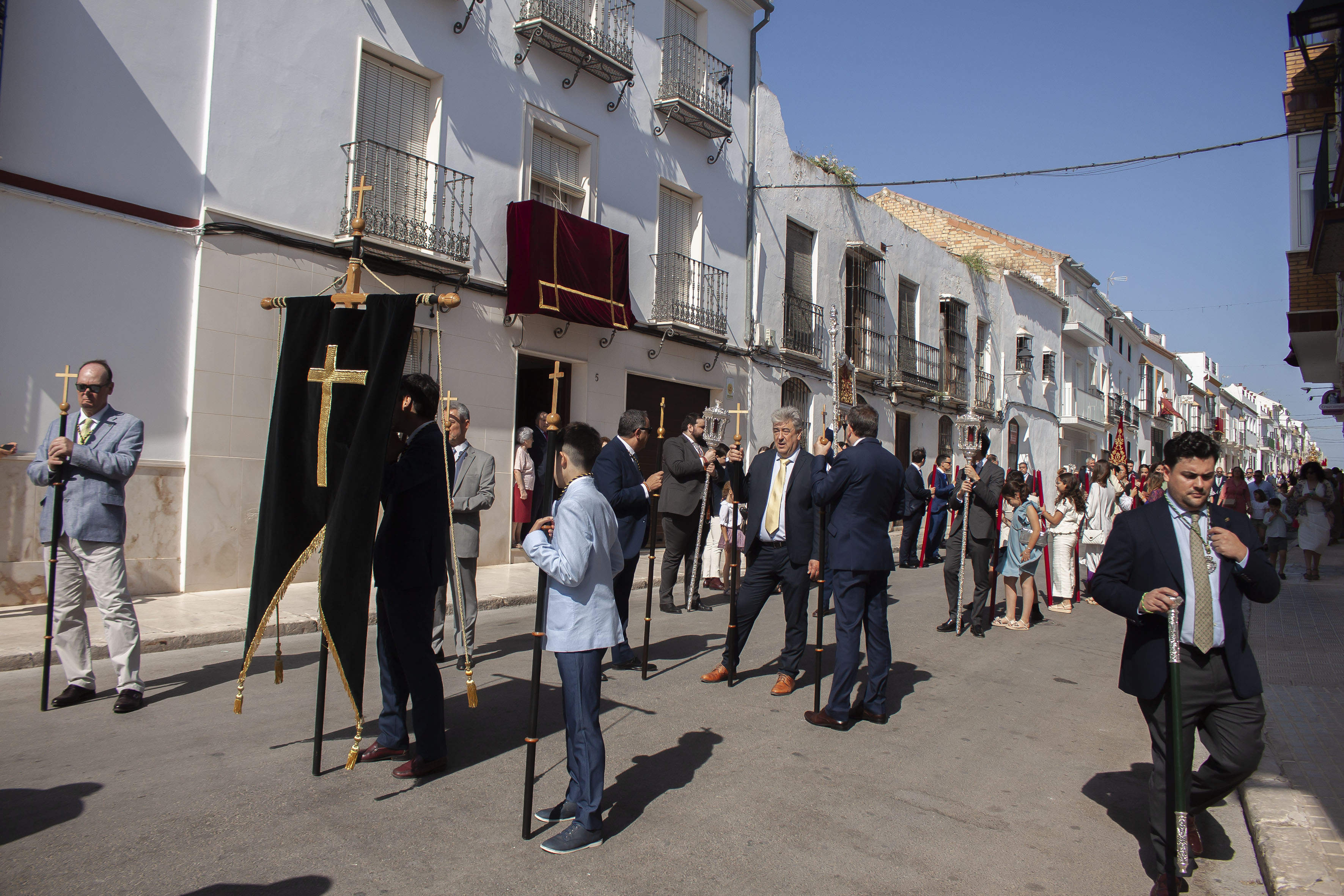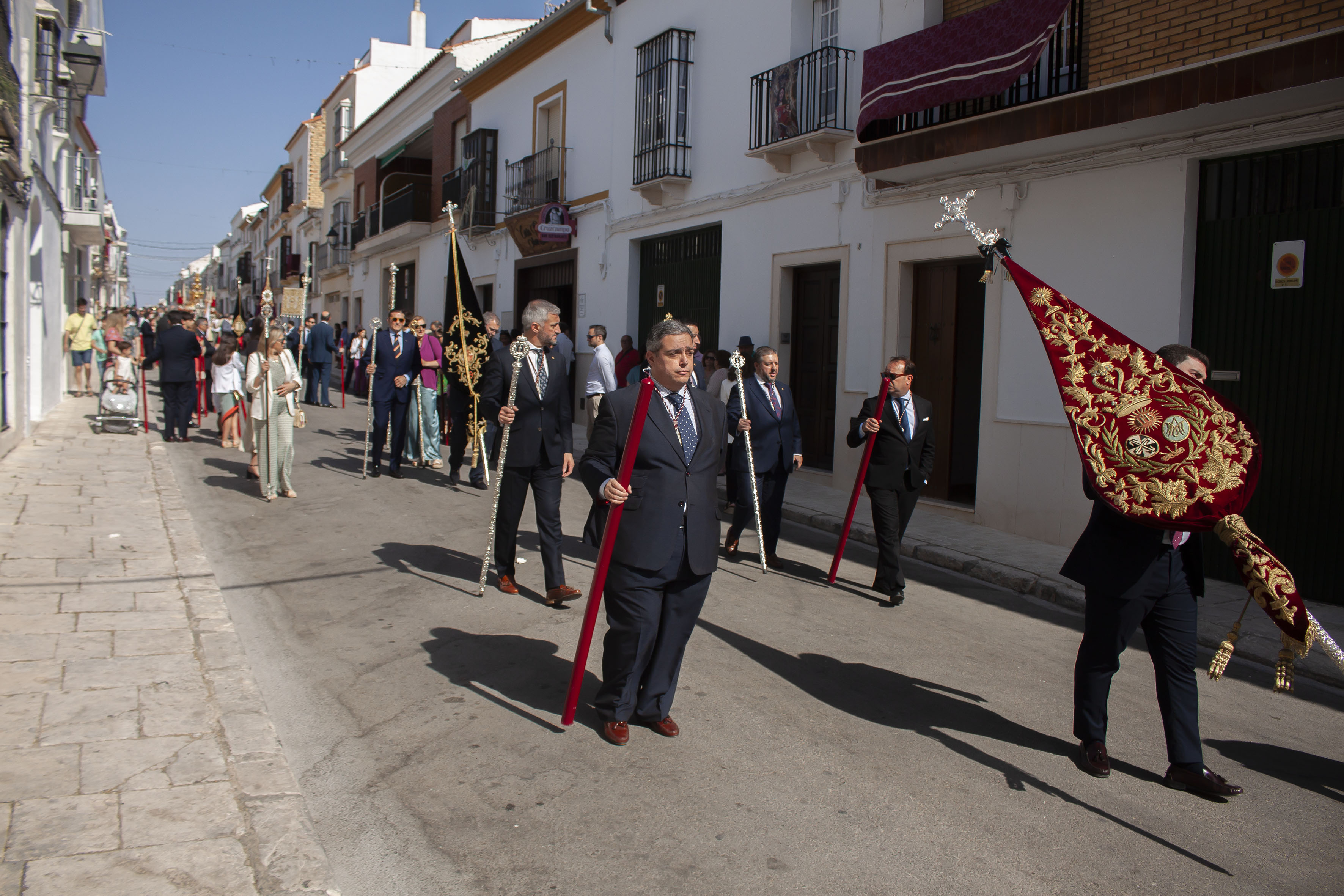 El presidente del Consejo General de Hermandades, Antonio Bustos Cabello y la Corporación Municipal, encabezada por el alcalde, Antonio Jesús Muñoz Quirós, han acompañado a la precesión, tras el paso de la Custodia.