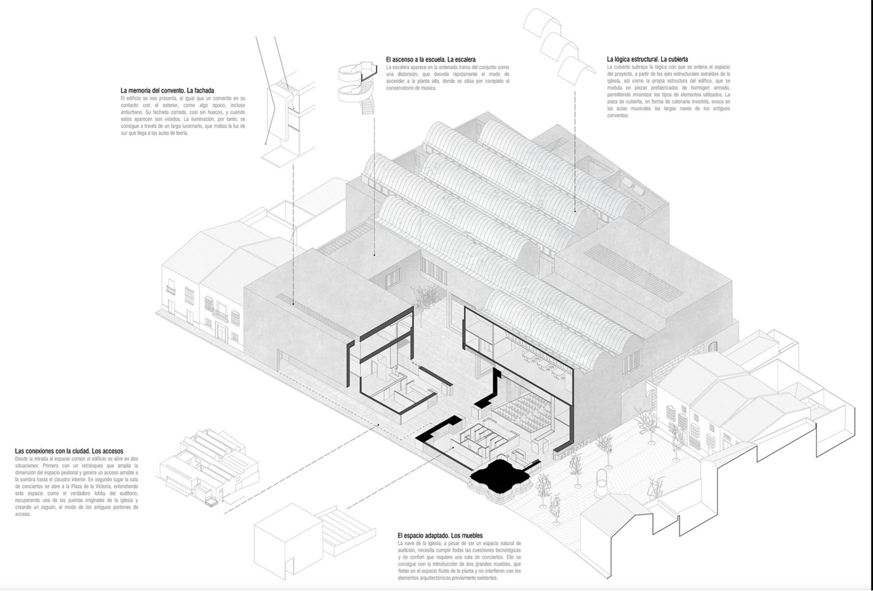 La intervención se realiza en términos de recuperación de vínculos espaciales y lógicas de construcción conventual. No se busca una relación de nostalgia, ni de yuxtaposición entre distintas arquitecturas, si no de escuchar al pasado y establecer relación con sus estructuras. Se genera así una sucesión de espacios (acceso, claustro, patios, aulas, naves…) de carácter eminentemente introvertido, ordenados por las trazas de la iglesia, que se aprovechan para adoptar una estructura prefabricada y modulada de hormigón.