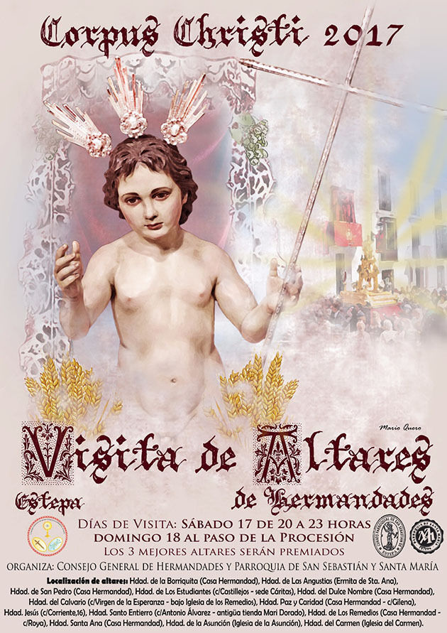 Estepa celebra este fin de semana la festividad del Corpus Christi. Este año además se podrán visitar los altares montados para la ocasión, desde mañana sábado por la tarde de 20:00 h a 23:00 h. El domingo tras la misa en la parroquia de Los Remedios, tendrá lugar la procesión de la Custodia a partir de las 10:00 h de la mañana. Además se premiarán los tres mejores altares, que podrán verse al paso de la procesión del Corpus.