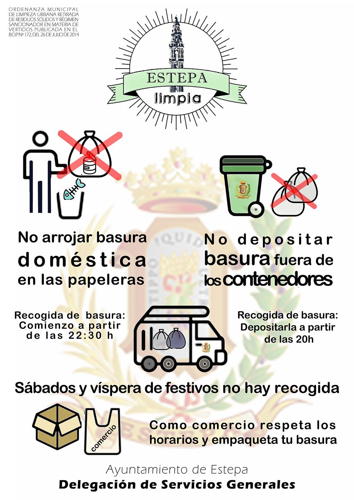 El Ayuntamiento de Estepa acepta y hace frente a su responsabilidad y obligación de mantener un servicio de limpieza y recogida de basura efectivo y suficiente, pero también quiere recordar a toda la población su obligación de ser respetuoso con la ciudad y con el cumplimiento de unas normas básicas establecidas.