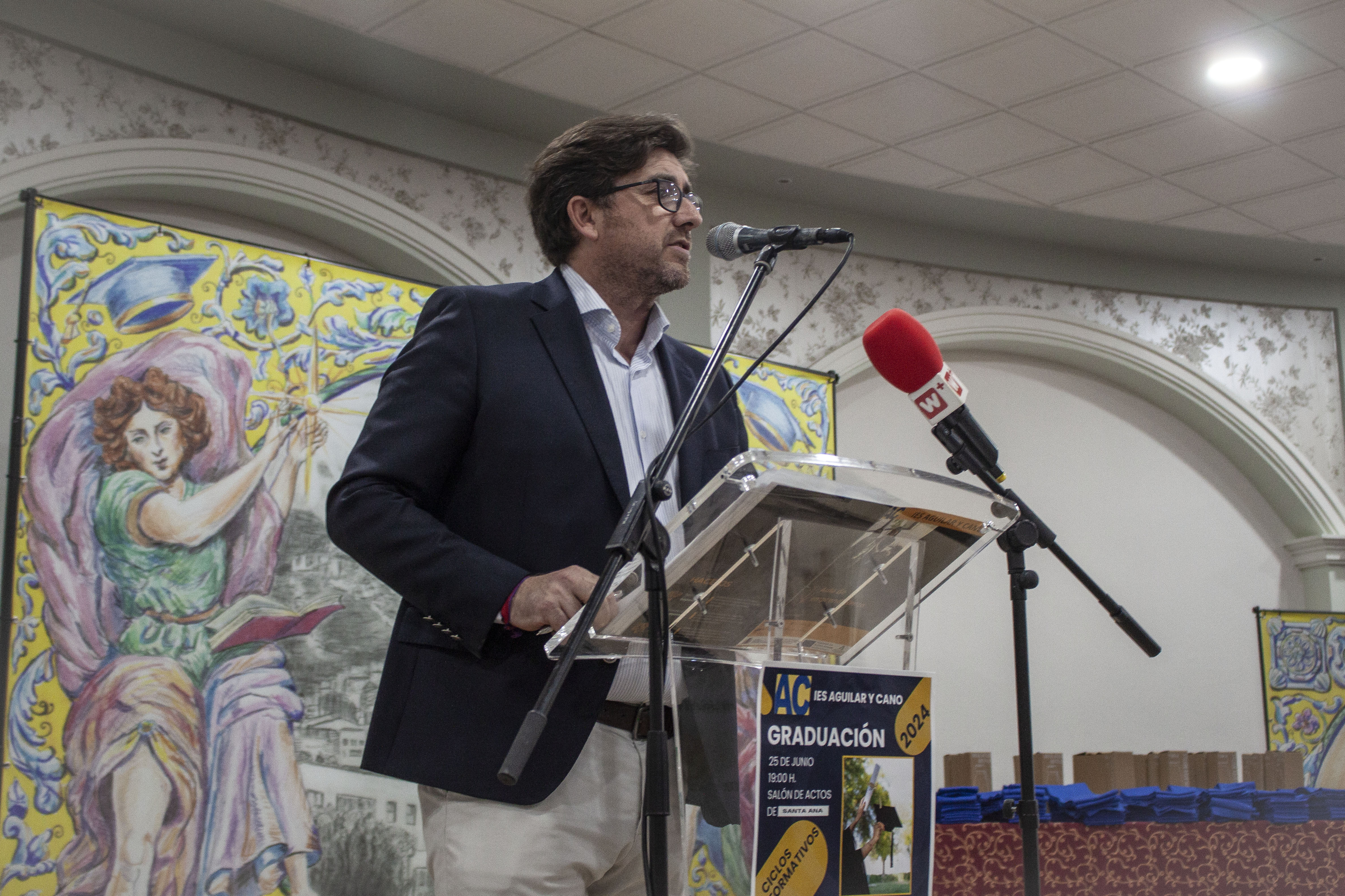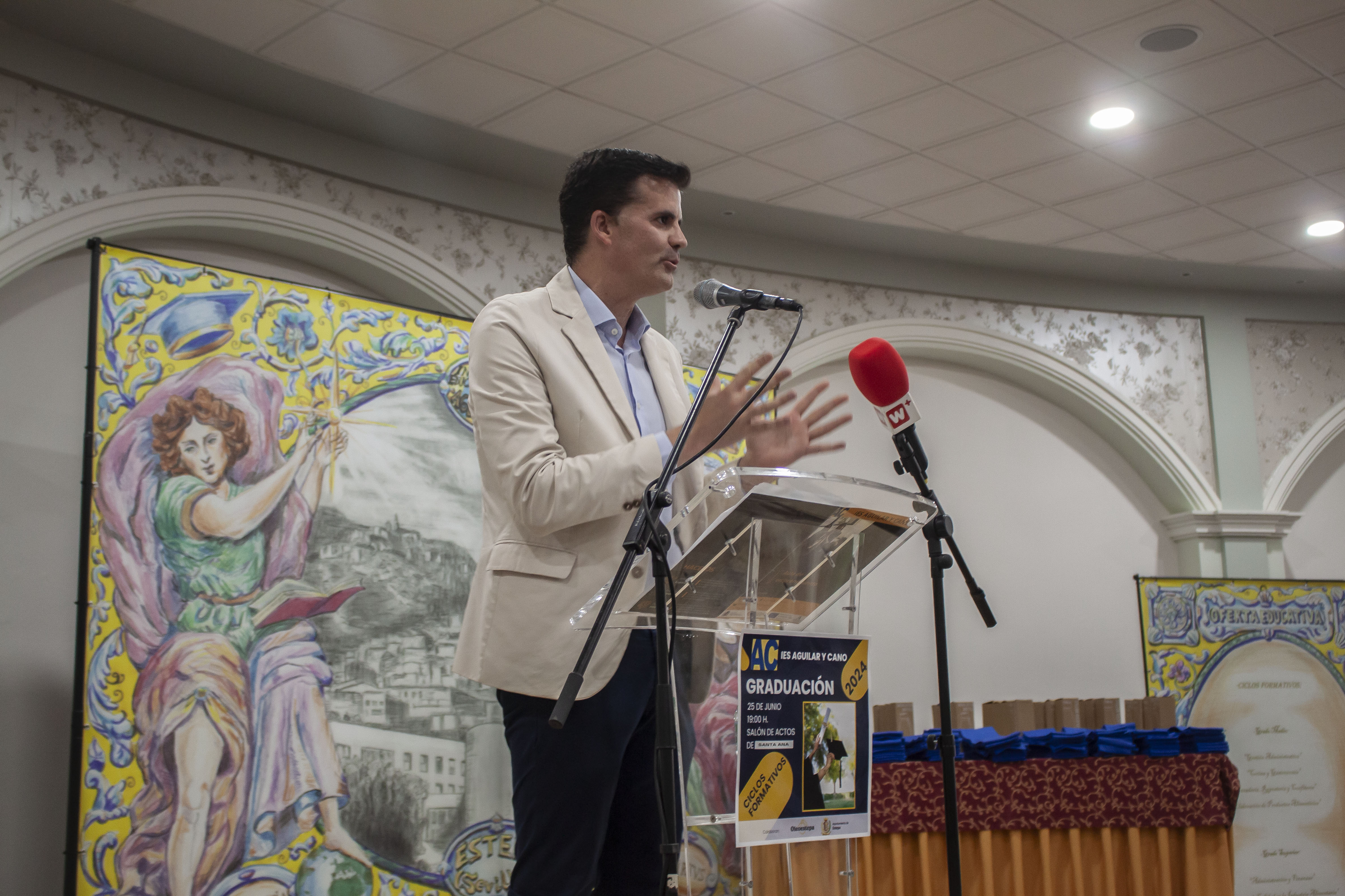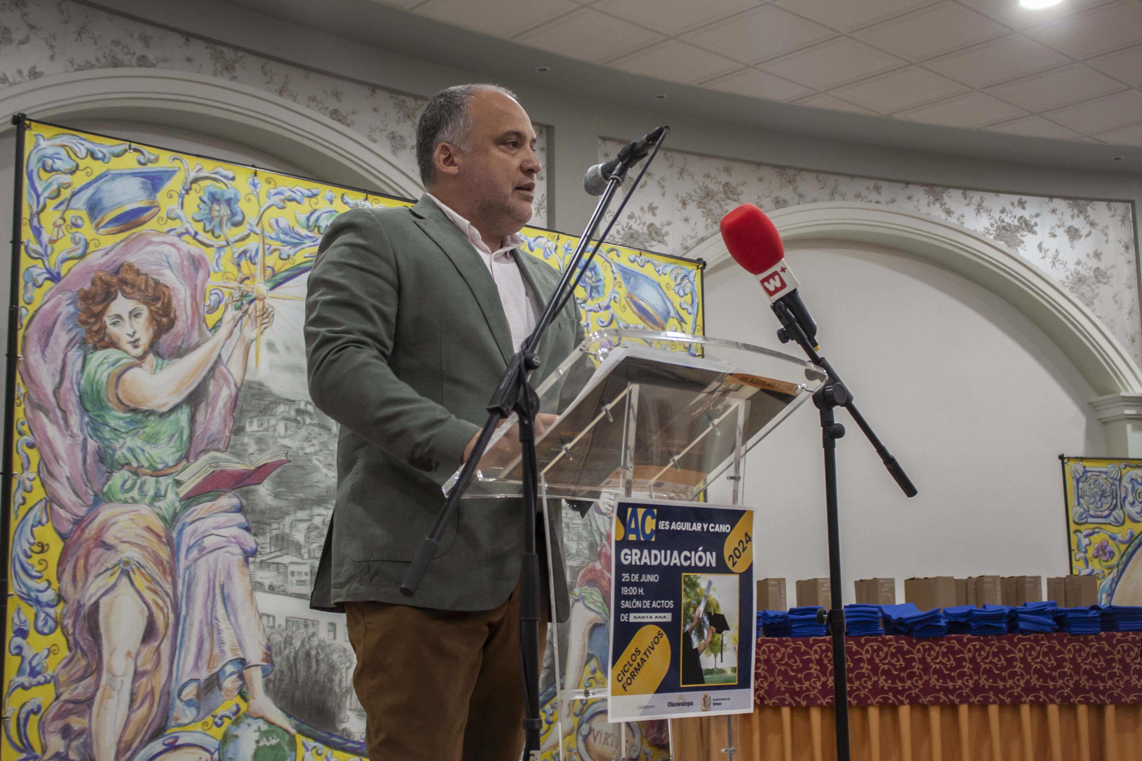 Tras las palabras del director, David Caro, ha tomado la palabra el alcalde de la ciudad, Antonio Jesús Muñoz que ha comenzado su locución pidiendo un aplauso en reconocimiento al plantel de profesores y profesoras del centro.