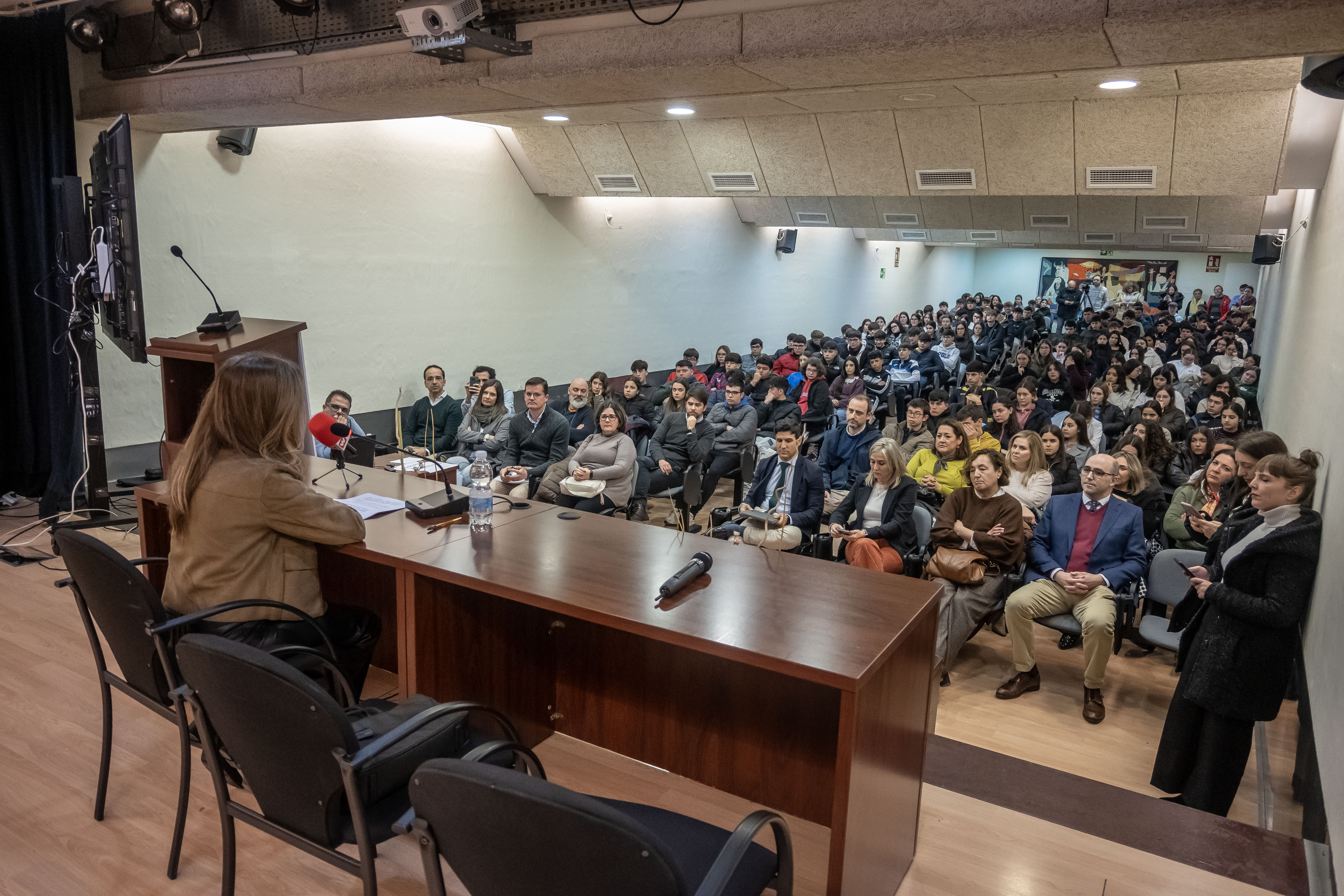 La primera de las conferencias ha sido impartida por María Teresa Jiménez Becerril, hermana del que fuera concejal del Ayuntamiento de Sevilla, Alberto Jiménez Becerril, asesinado por la banda terrorista ETA en 1998. Su testimonio ha servido para concienciar al alumnado sobre una etapa de la historia reciente de España que muchos jóvenes no han vivido ni conocido de primera mano.