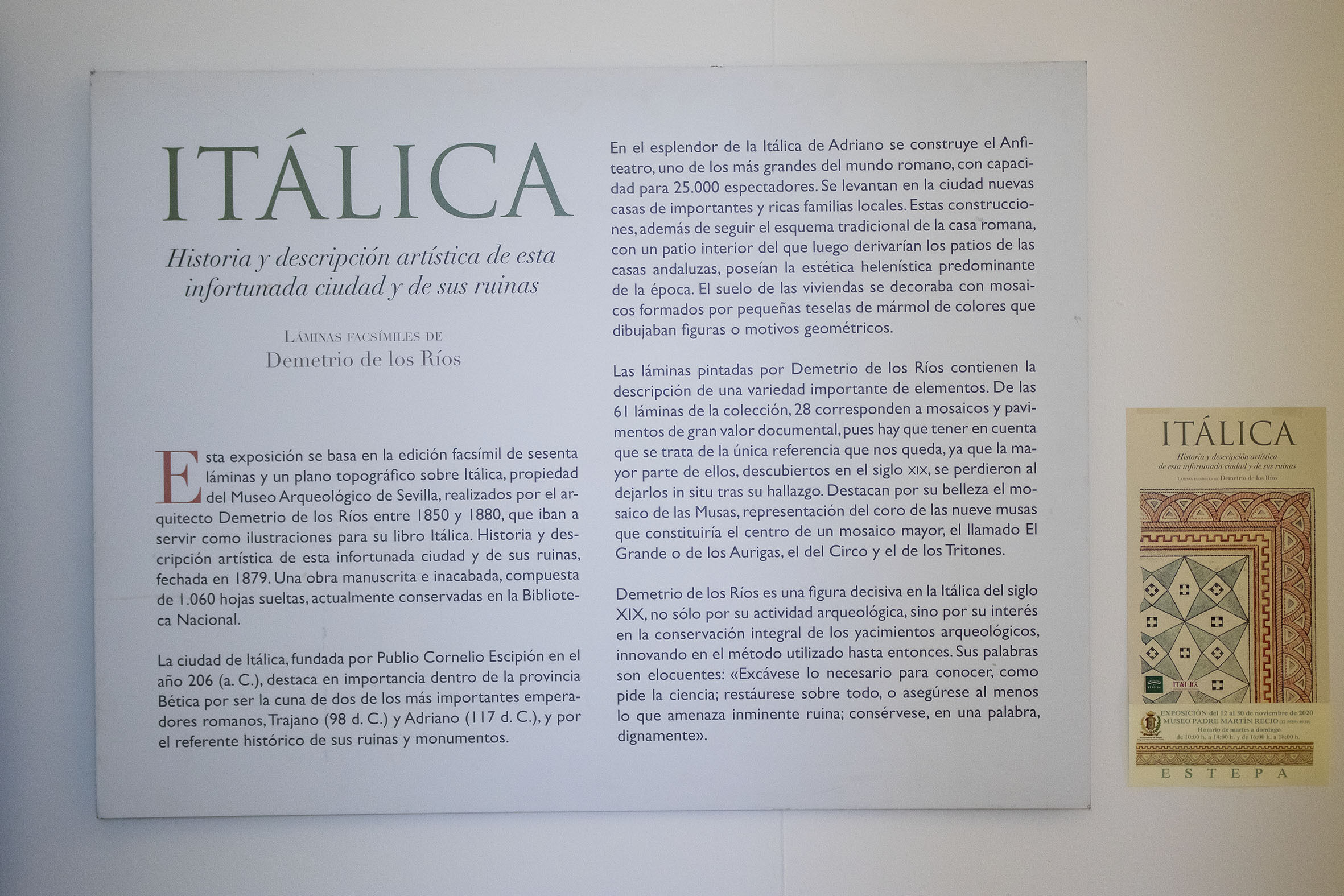 Esta exposición muestra la edición facsímil de sesenta láminas y un plano topográfico sobre Itálica, propiedad del Museo Arqueológico de Sevilla, firmados por el arquitecto Demetrio de los Ríos entre 1850 y 1880, que iban a servir como ilustraciones para su libro Itálica. Historia y descripción artística de esta infortunada ciudad y de sus ruinas, fechada en 1879. Una obra manuscrita e inacabada, compuesta de 1.060 hojas sueltas, actualmente conservadas en la Biblioteca Nacional.