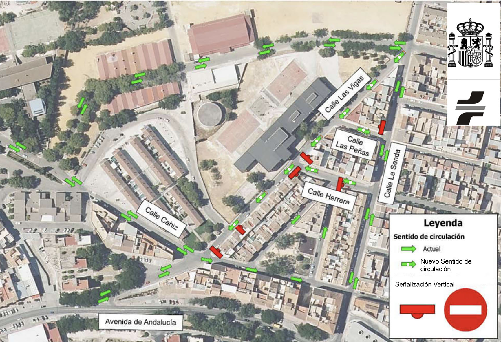 La calle Camino de las Vigas pasa a ser de sentido único dirección sur (Avenida de Andalucía). El tramo de calle Herrera, coincidente con Plaza Blas Infante, será de sentido obligatorio hacia la izquierda, lo que prohibirá la incorporación a calle Senda, como hasta ahora venía siendo habitual. Este mismo tramo de calle Herrera, al final, justo frente al colegio, será también de sentido obligatorio hacia la izquierda, a diferencia de anteriormente que permitía ambos sentidos.