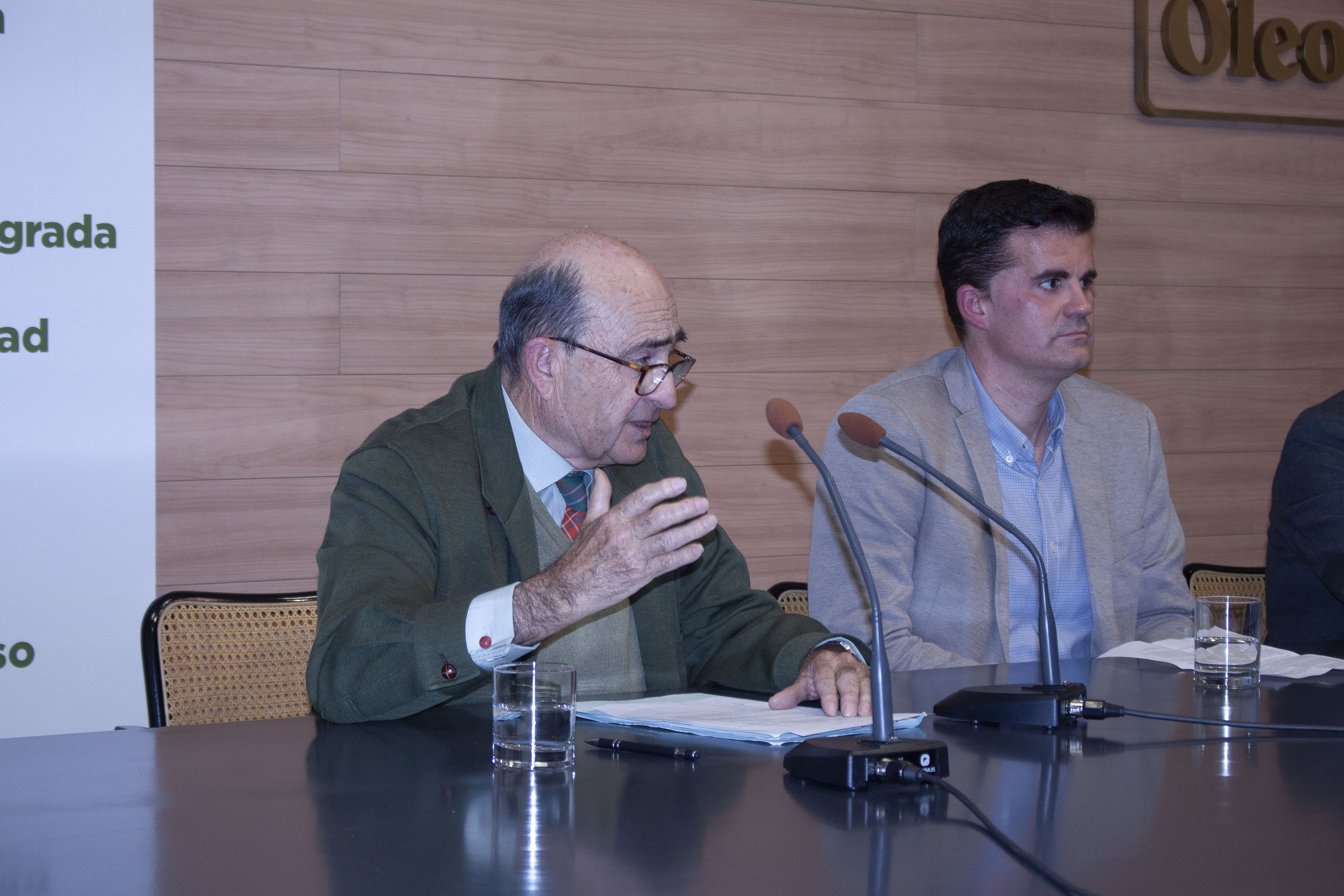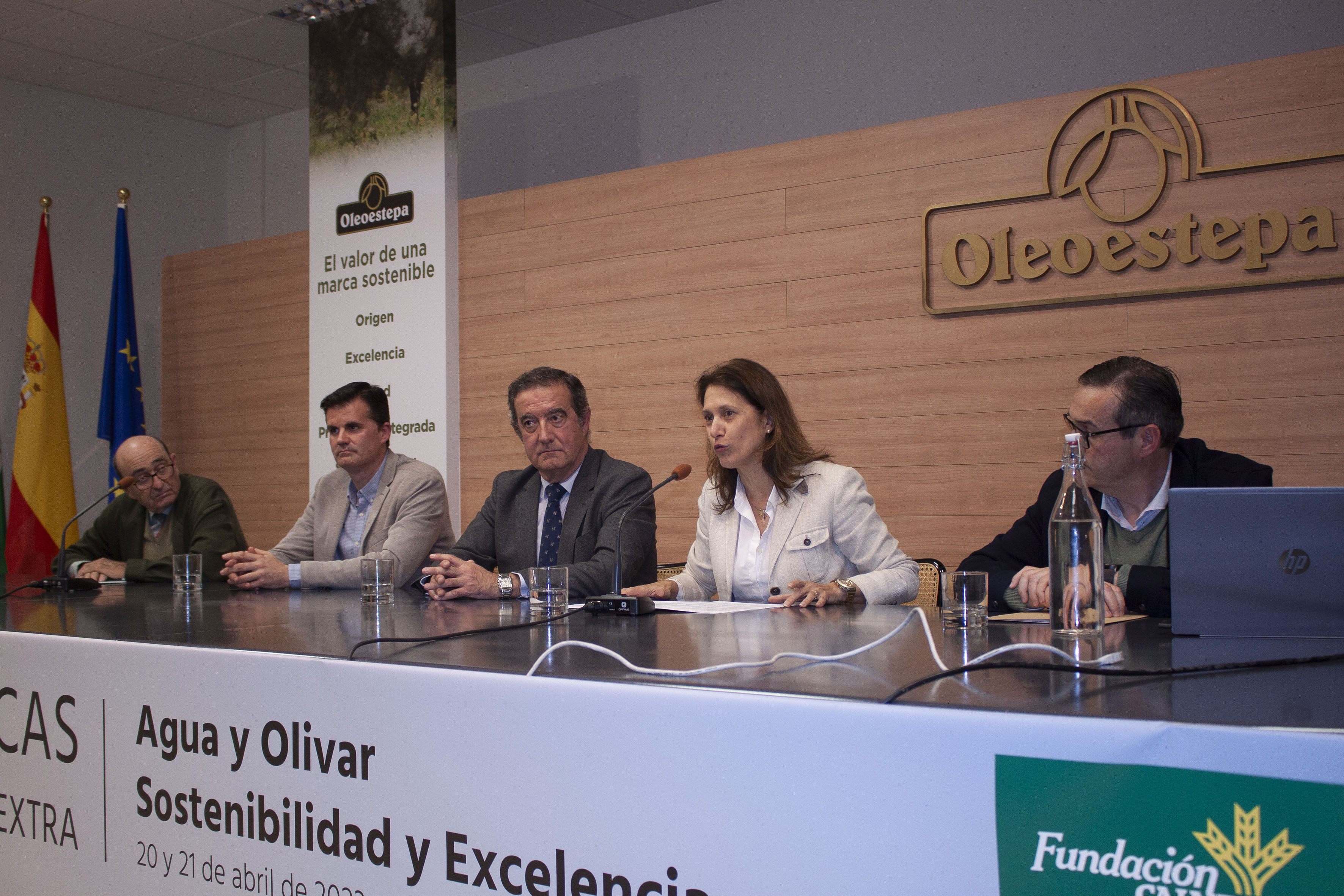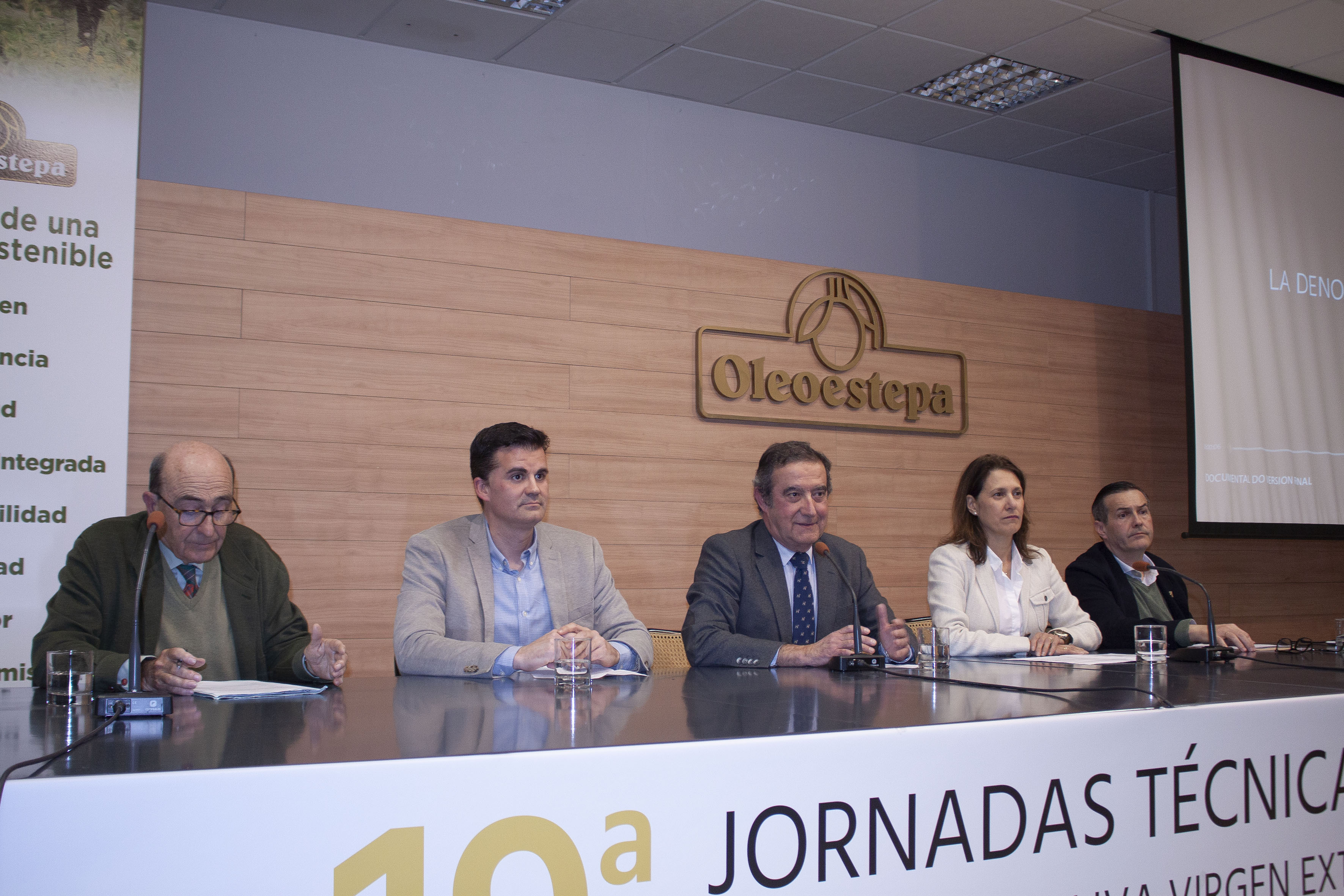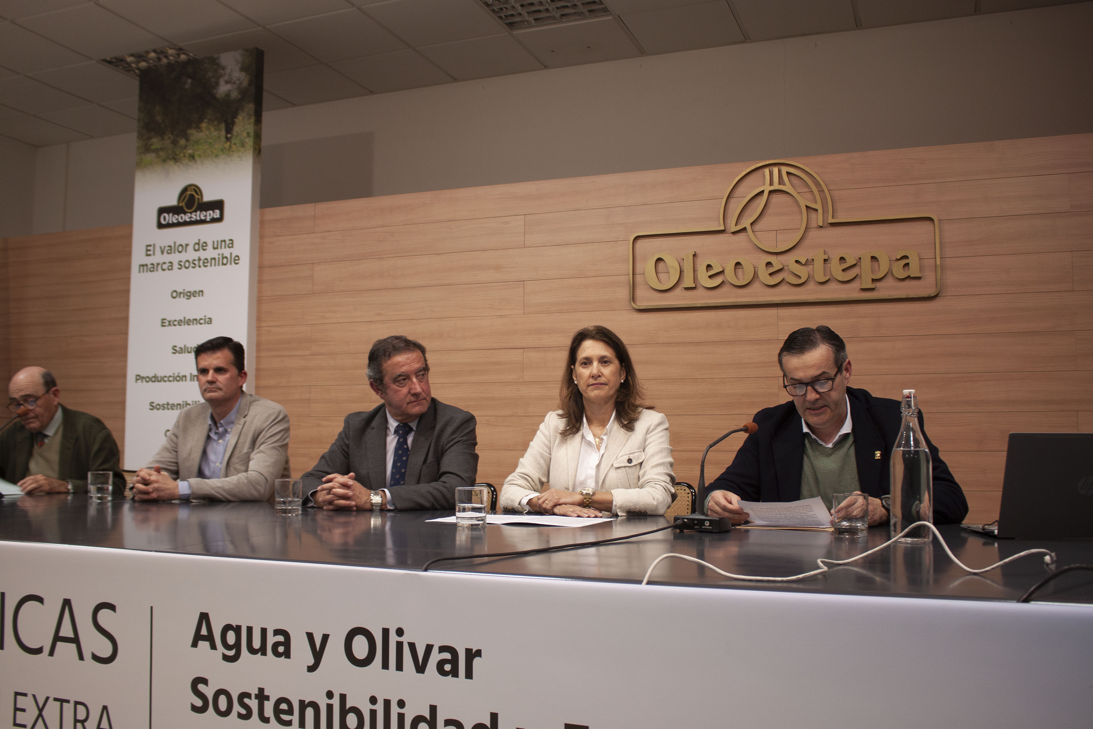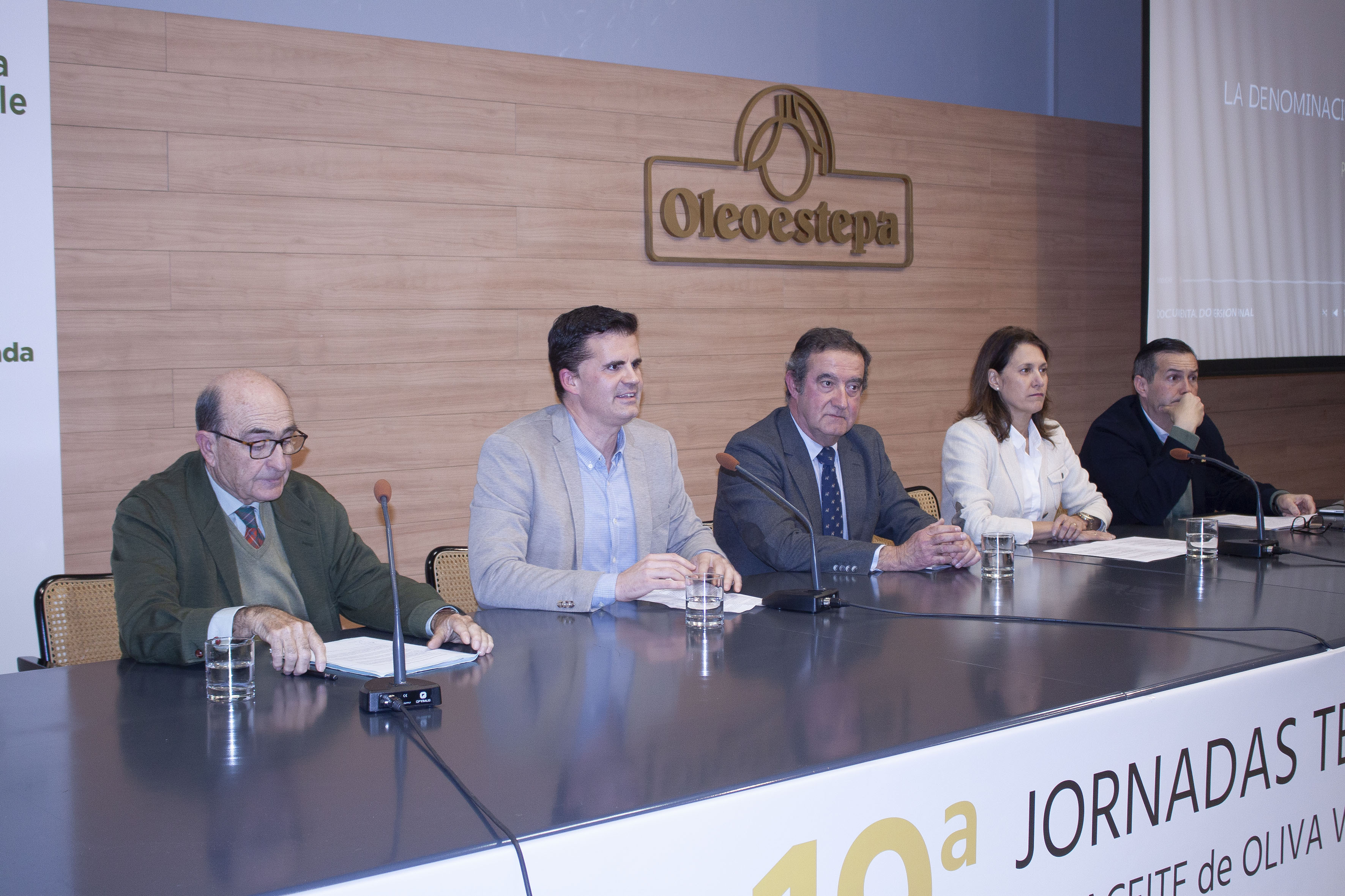 La delegada de Agricultura de la Junta de Andalucía, Isabel Solís, junto al alcalde de Estepa, Antonio Jesús Muñoz, fueron invitados a la mesa de presentación del acto, en la que se encontraban también, José María Loríng, presidente del Consejo Regulador de la DOE, Moisés Caballero, secretario del consejo y Álvaro Olavarría, gerente de Oleoestepa.