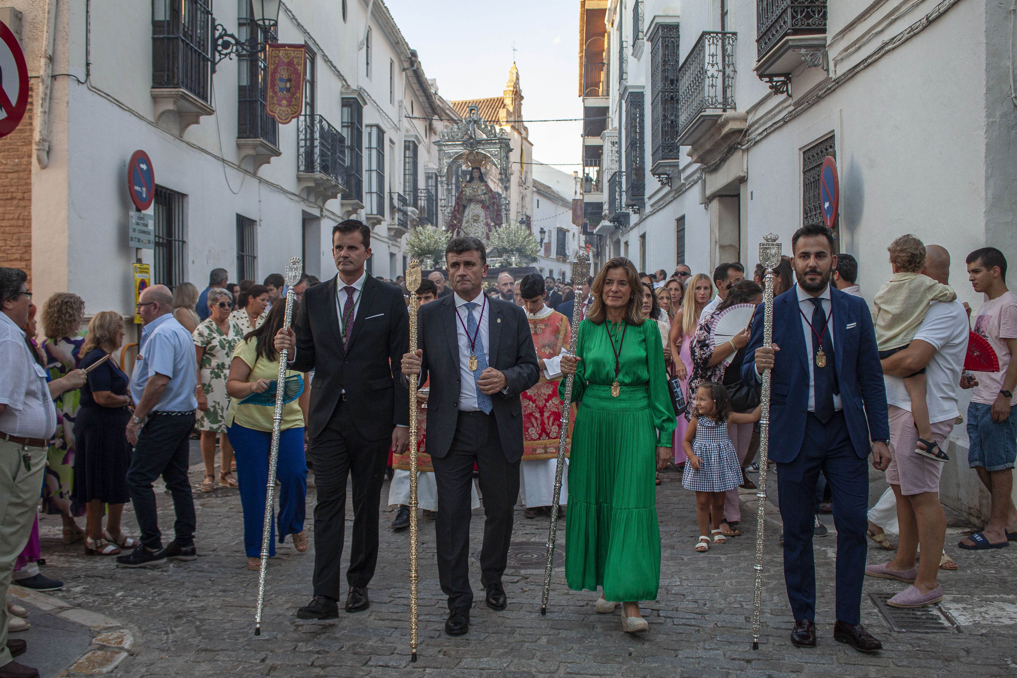 La procesión iba presidida por el hermano mayor, Joaquín Amador, el alcalde de Estepa, Antonio Jesús Muñoz Quirós y la representante de la casa palacio del Marquesado de Cerverales, Natalia Alcaraz Velázquez- Duro y el secretario de la hermandad Antonio Fernández.