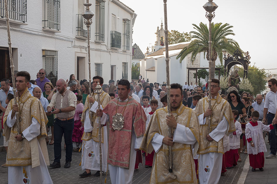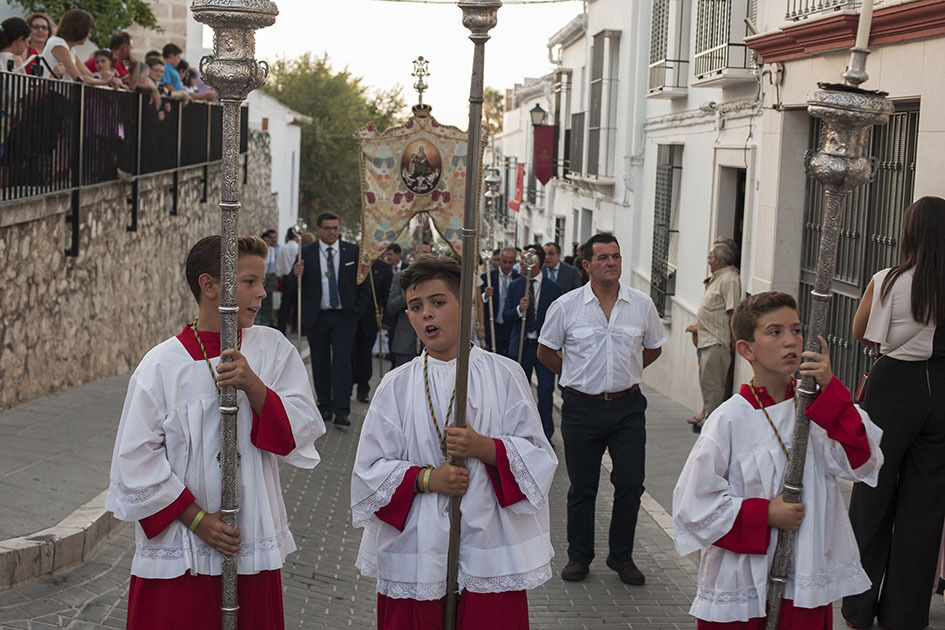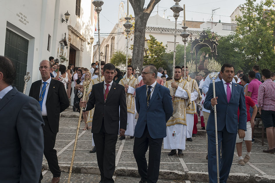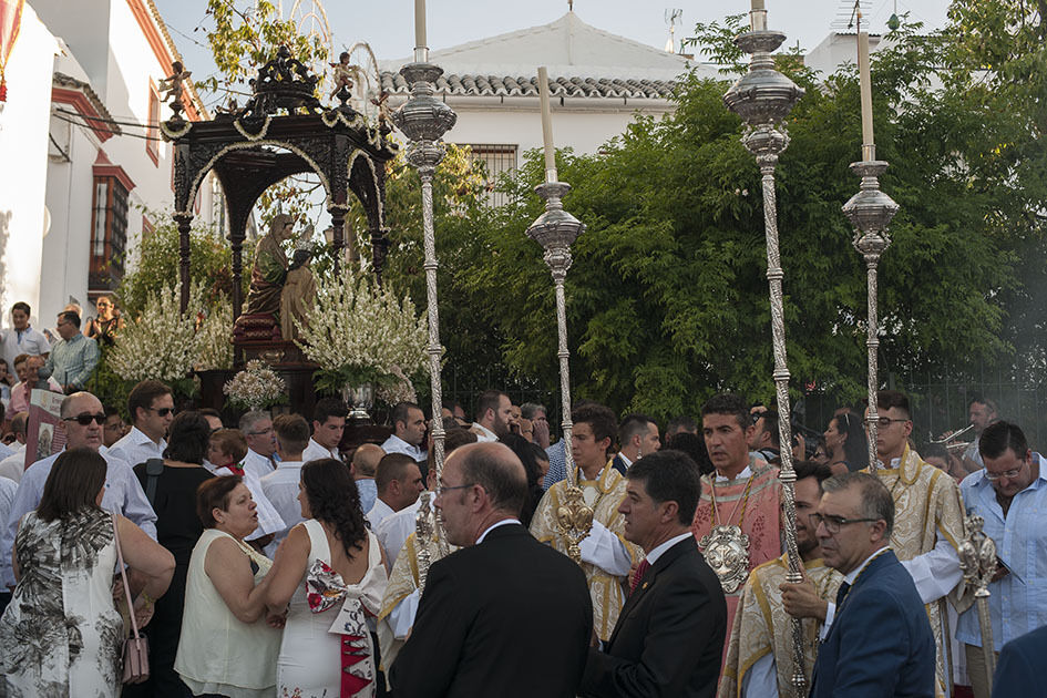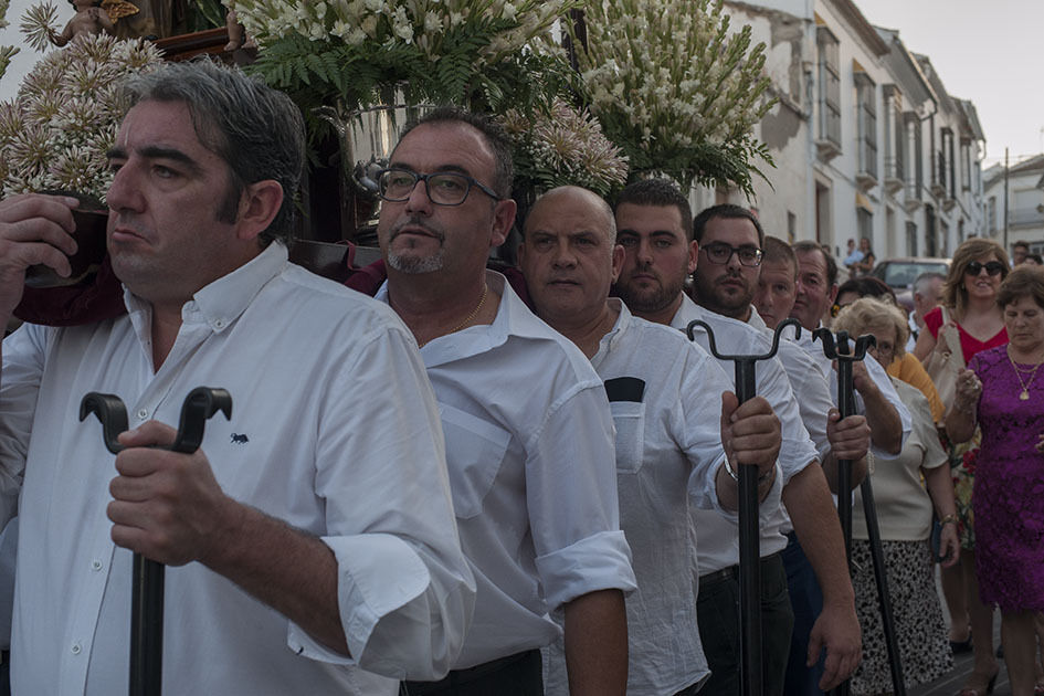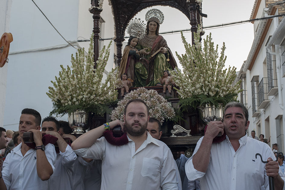 La Hermandad de Santa Ana celebra hoy su día grande y a estas horas pasea por las calles de Estepa la imagen de la madre de la Virgen. La Señora Santa Ana inunda de olor a jazmín las calles por donde pasa. Tras su recorrido por el barrio Santanero se encamina ahora hacia los otros barrios de Estepa que la esperan con flores y con el calor, ya habitual de estas tardes de verano. El alcalde de la ciudad ha acompañado a la directiva de la Hermandad en su recorrido procesional.