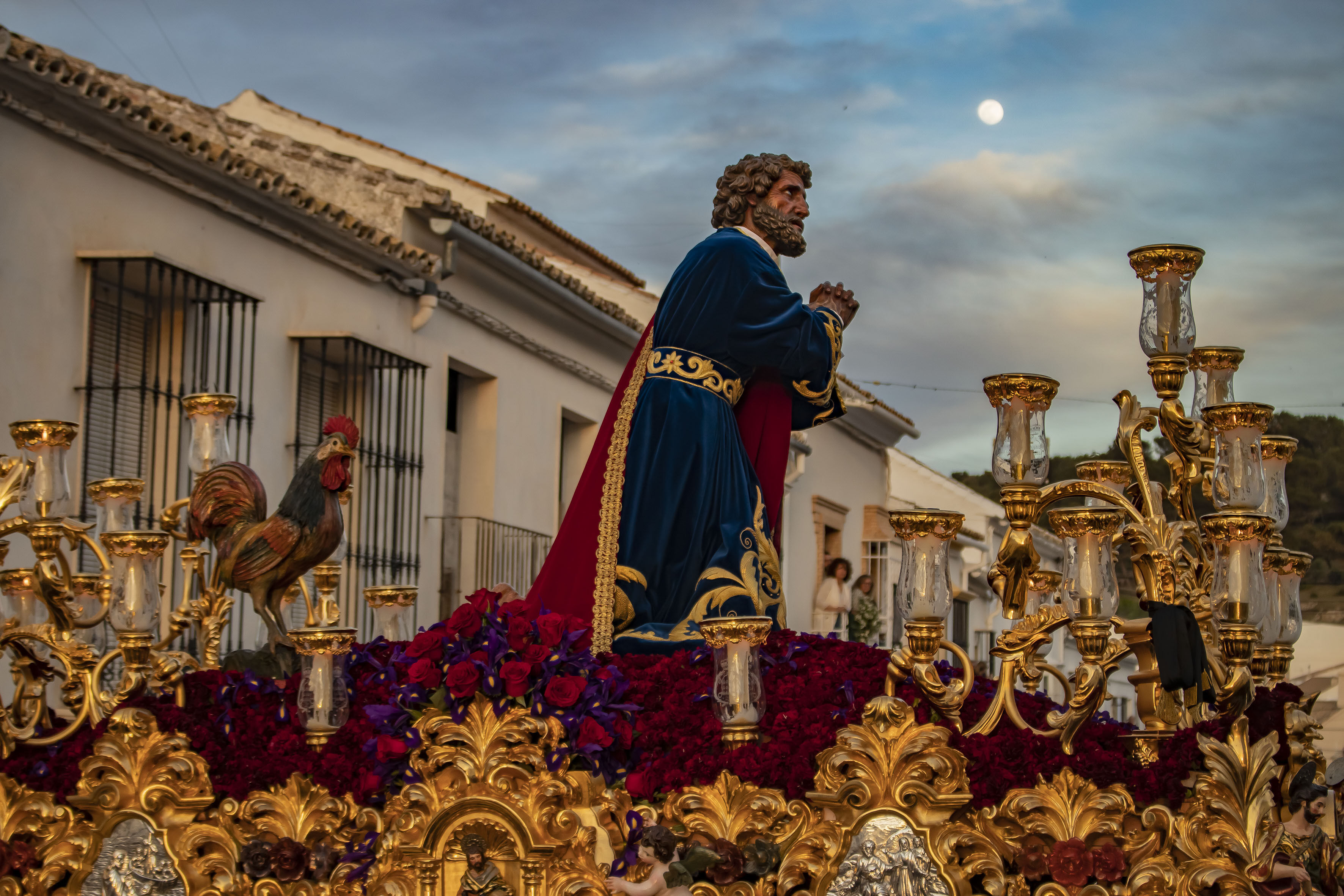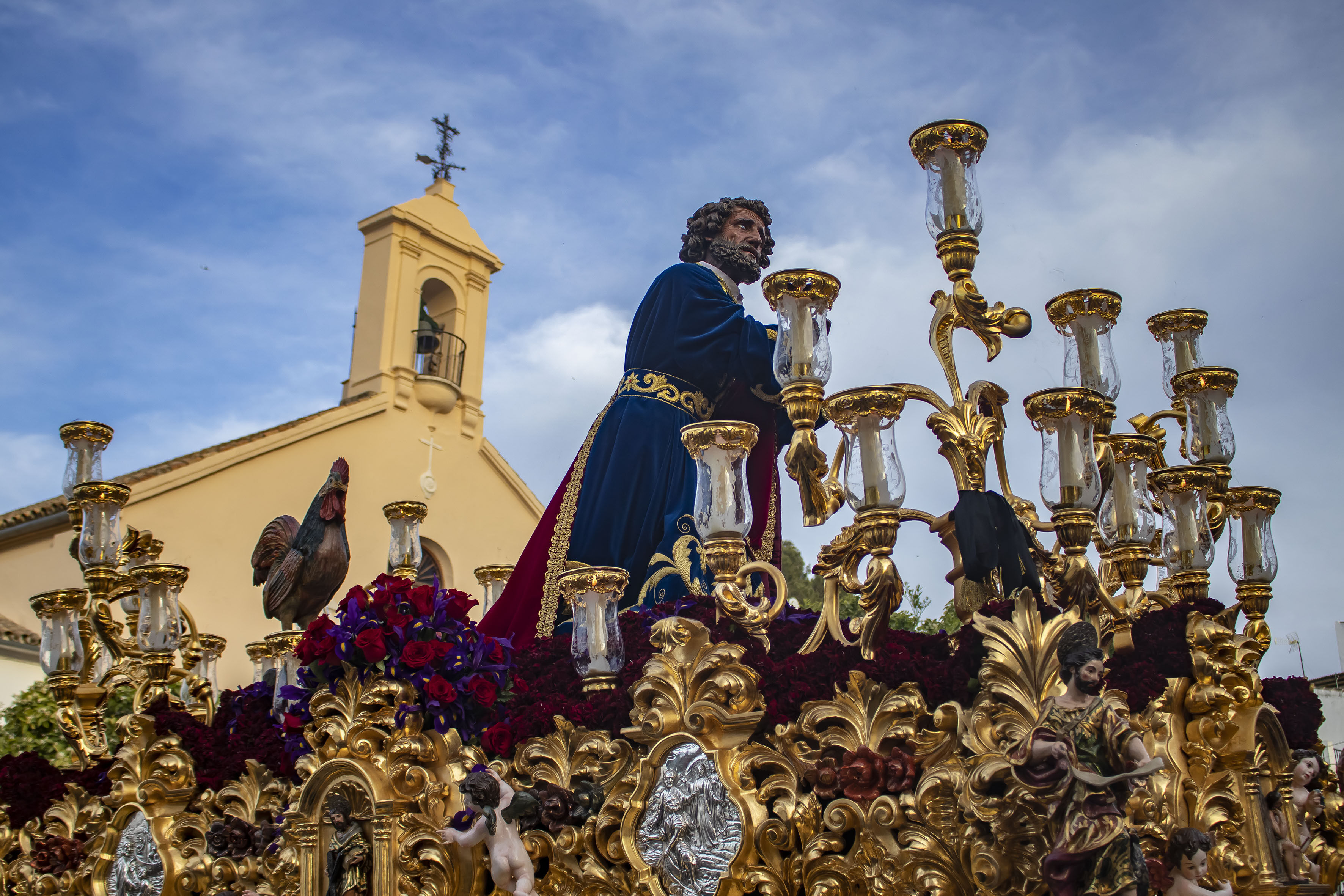 Talla portentosa que representa el Príncipe de los Apóstoles en el momento amargo del llanto tras las negaciones y el canto del gallo, figura que le acompaña en el paso. La imagen se atribuye a Pedro de Mena de finales del s. XVII.