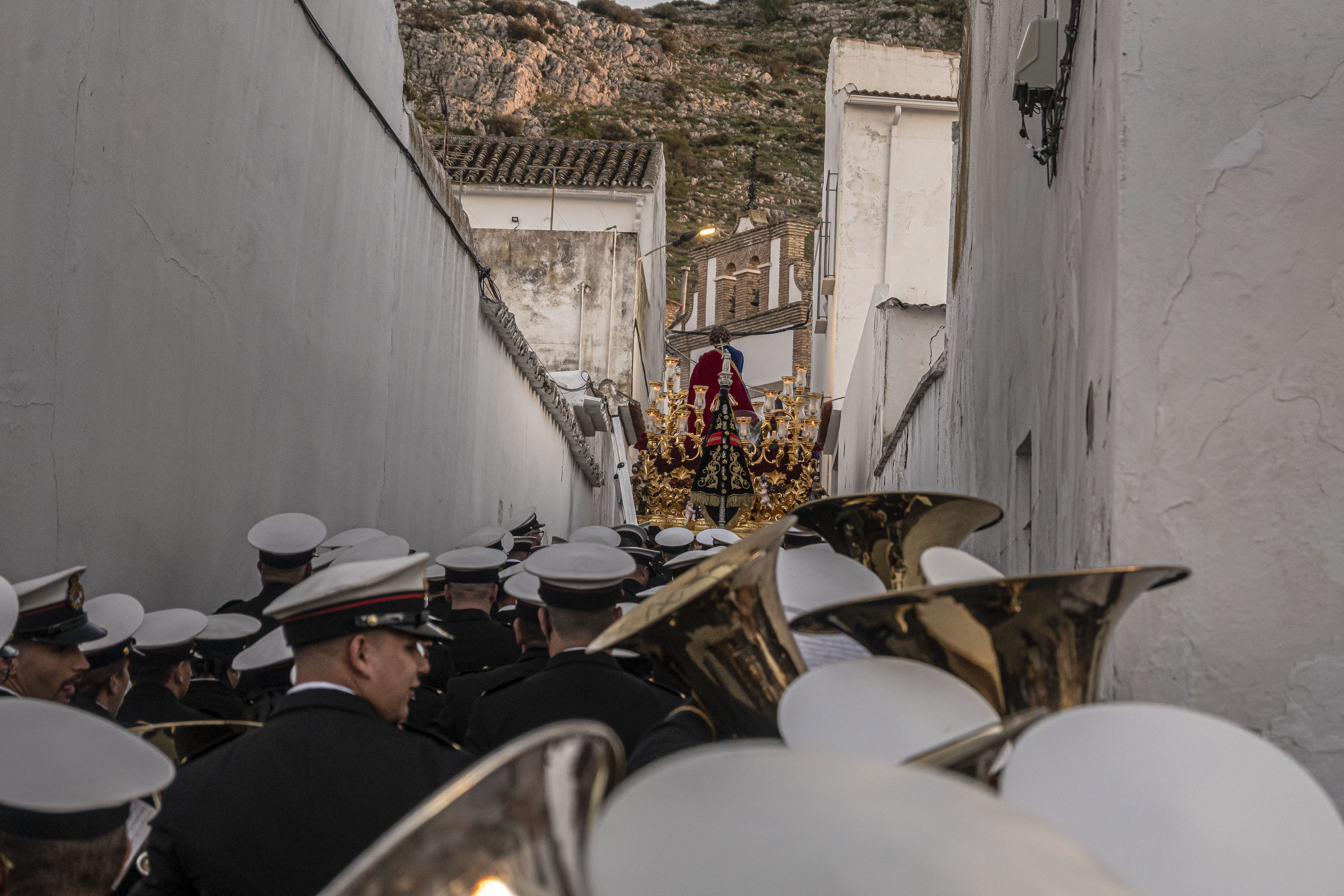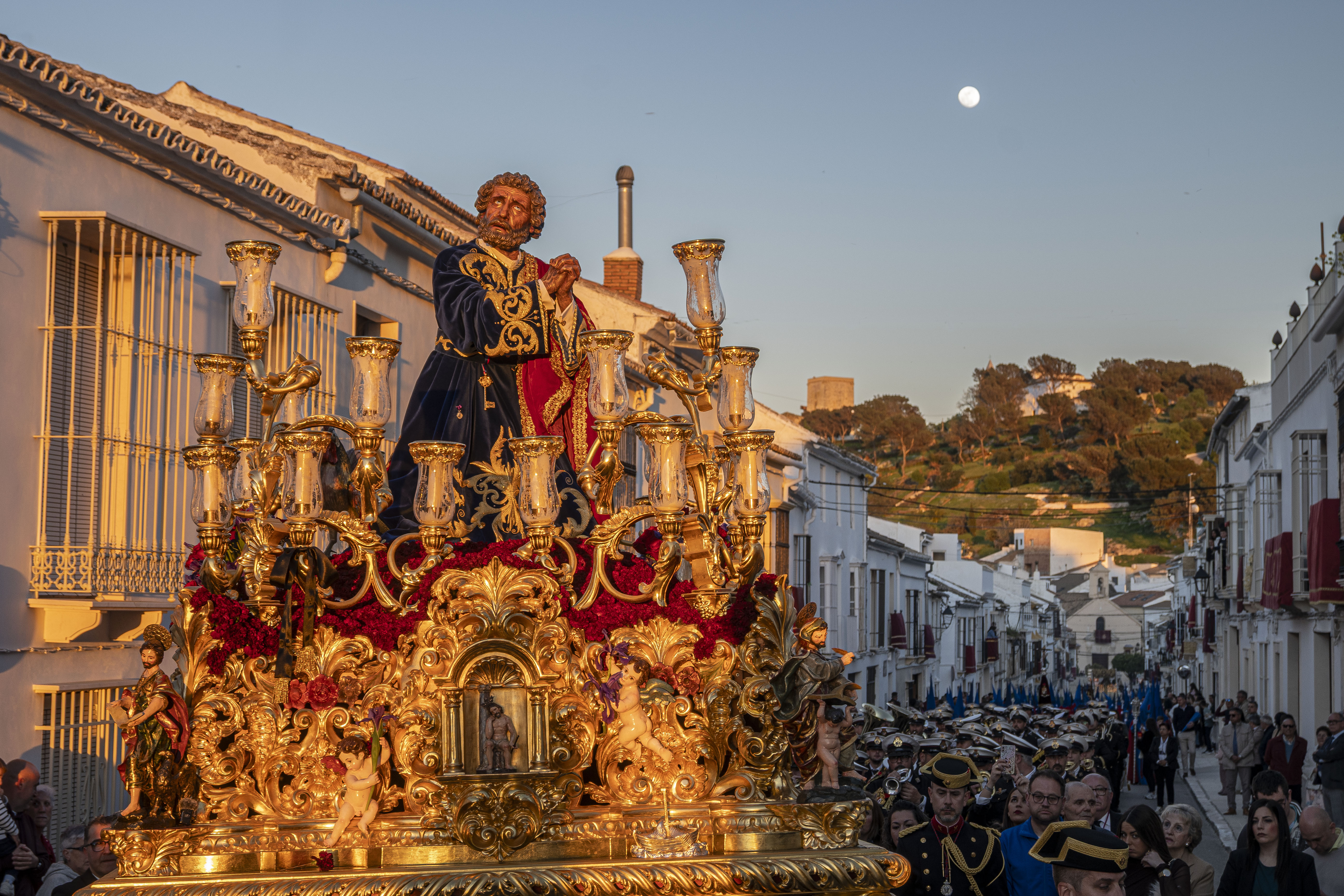 Música: Banda de cornetas y tambores Vera Cruz de Utrera tras el paso de San Pedro y la Banda de Música de Estepa (BAME) detrás del palio.