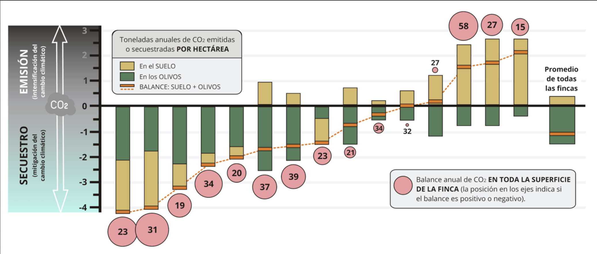 No obstante, en 9 de las fincas se detectó una pérdida de carbono en el suelo, atribuida principalmente a la escasa presencia de cubiertas vegetales y a la falta de aplicación de enmiendas orgánicas. A pesar de ello, el carbono acumulado en los árboles compensa en la mayoría de los casos esta pérdida. Solo en 4 fincas se ha registrado una emisión neta de CO2,