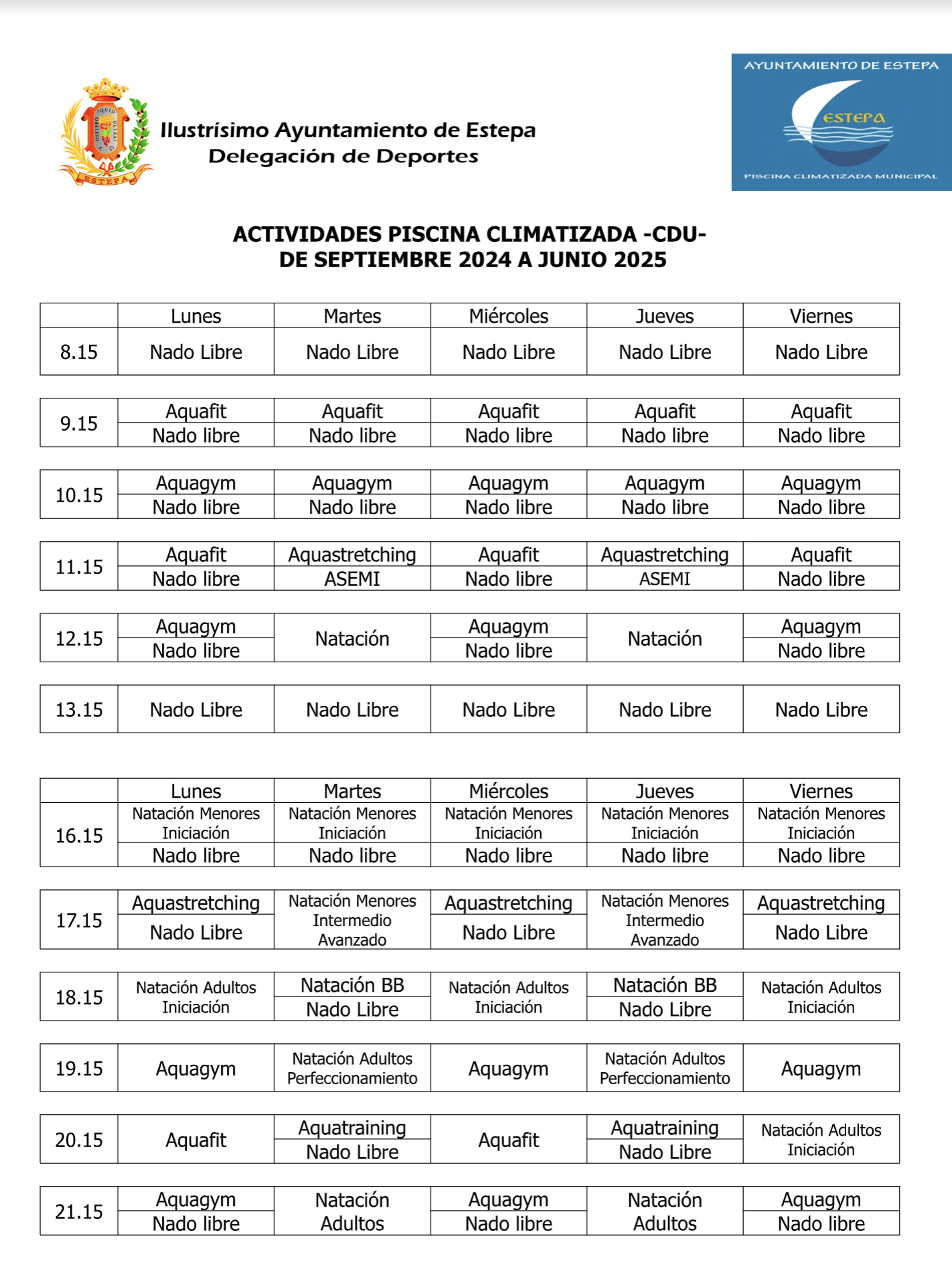 5.- A partir del LUNES 16 DE SEPTIEMBRE se harán INSCRIPCIONES SIN CITA PREVIA, en horario de apertura de la Piscina Climatizada (8 a 14 h /16 a 22 h).