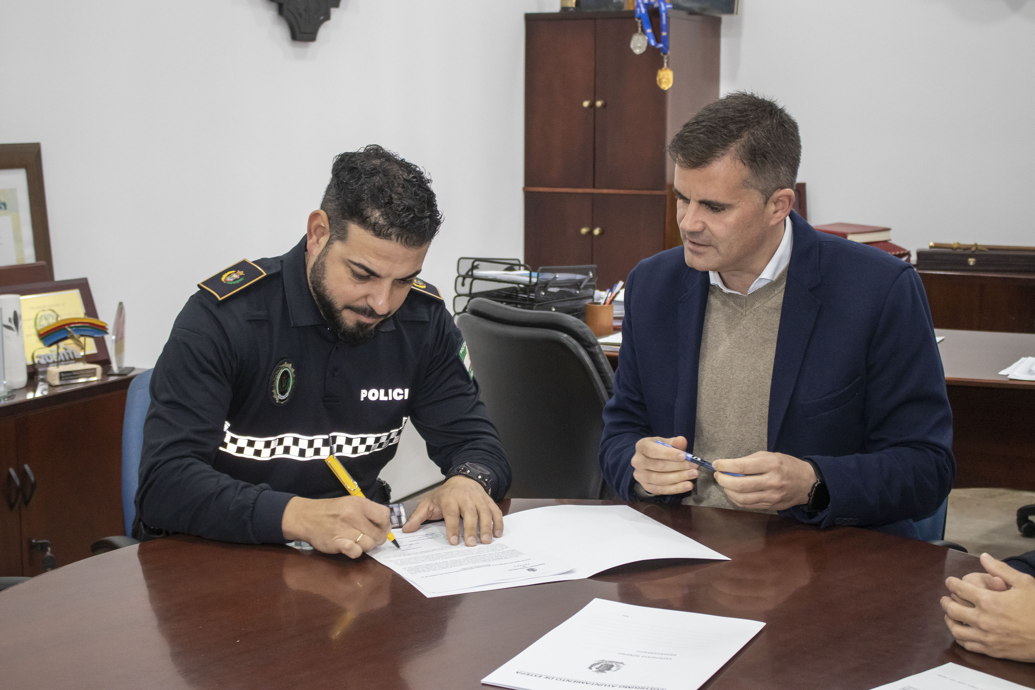 Un nuevo agente de la Policía Local de Estepa ha tomado posesión hoy de su puesto en la plantilla del Ayuntamiento de Estepa. Félix Llamas Martínez, ha tomado posesión del puesto en comisión de servicios ante el alcalde, Antonio Jesús Muñoz y el Jefe de la Policía Local, Francisco Vargas.