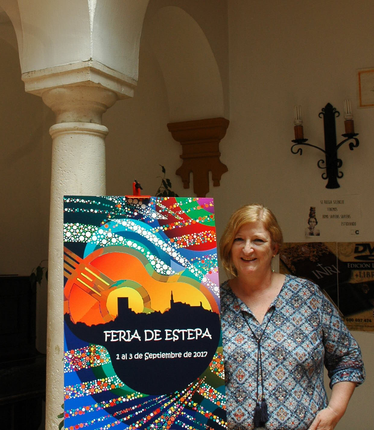 Para hacer mi cartel me he inspirado en la alegría de la feria a través del color. La silueta del cerro incrustada en una guitarra, representa a Estepa, el primer signo de identidad que se ve al acceder a nuestro pueblo, las luces de los alumbrados y el atardecer como punto confluyente entre la noche y el día periodo en el que transcurre la feria.