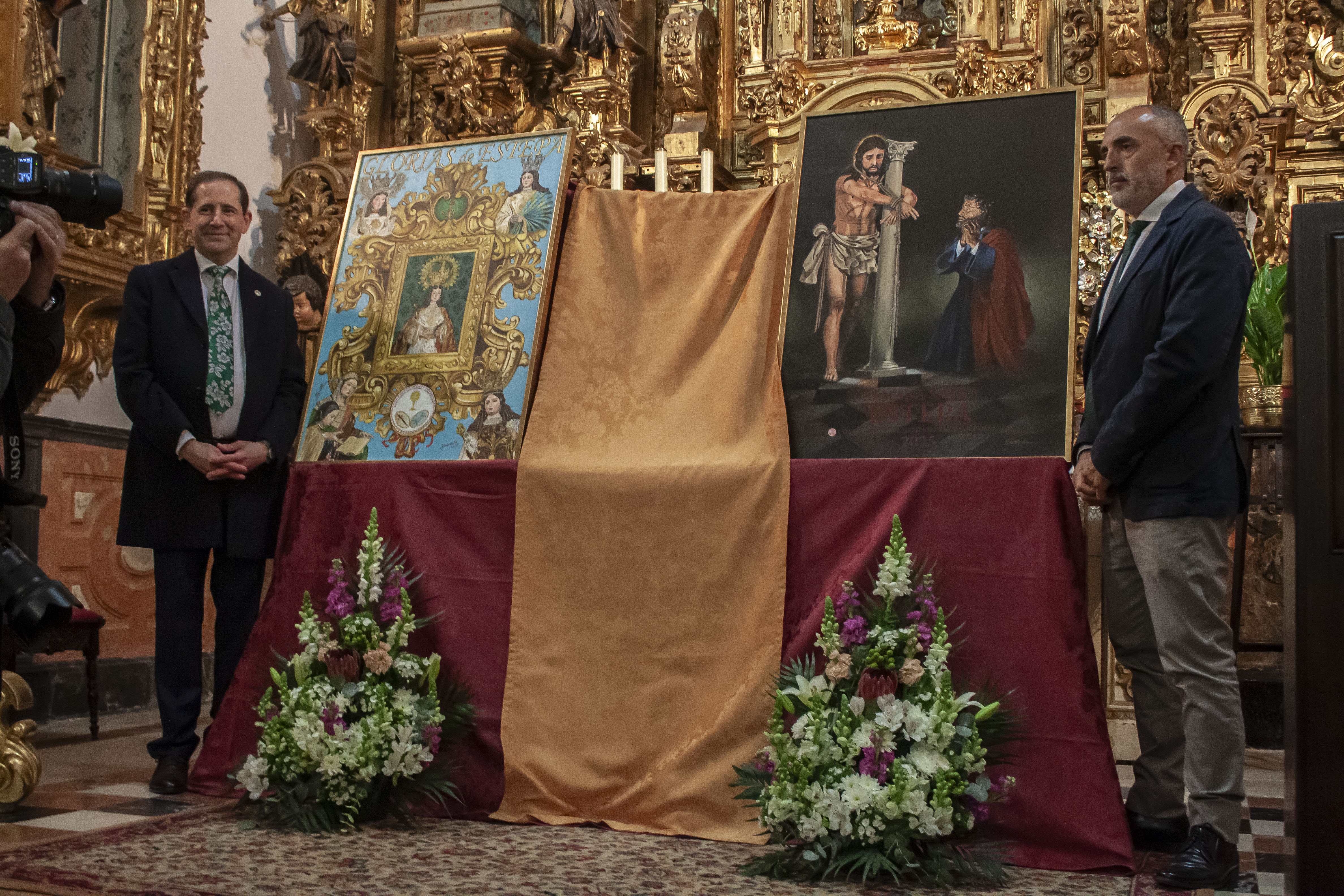 El presidente del Consejo General de Hermandades, Antonio Vicente Bustos Cabello, ha presentado al autor, tanto del cartel de la Semana Santa como al de Las Glorias, Miguel Ángel Borrego Llamas que ha pintado la imagen de la Virgen de la Asunción enmarcada por una cornucopia con las cuatro imágenes de las otras hermandades de Gloria de Estepa, El Carmen, Los Remedios, Santa Ana y La Inmaculada.