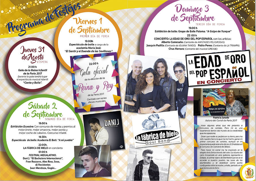 La delegada de Festejos del Ayuntamiento de Estepa ha presentado hoy ante los medios de comunicación el programa de actos y espectáculos de la próxima Feria de Estepa. La feria que tendrá lugar el primer fin de semana de septiembre, contará con la actuación del espectáculo FESTIVAL MEGALATINO para el sábado de feria y del espectáculo LA EDAD DE ORO DEL POP ESPAÑOL para el domingo de Feria. Se contará igualmente con las galas de elección de la Reina y Rey de la Feria 2017, así como su versión infantil. Se recupera la tradición de los espectáculos de Sevillanas con la actuación de las diferentes academias de Estepa, El Boti, Paloma Borrego y María José.