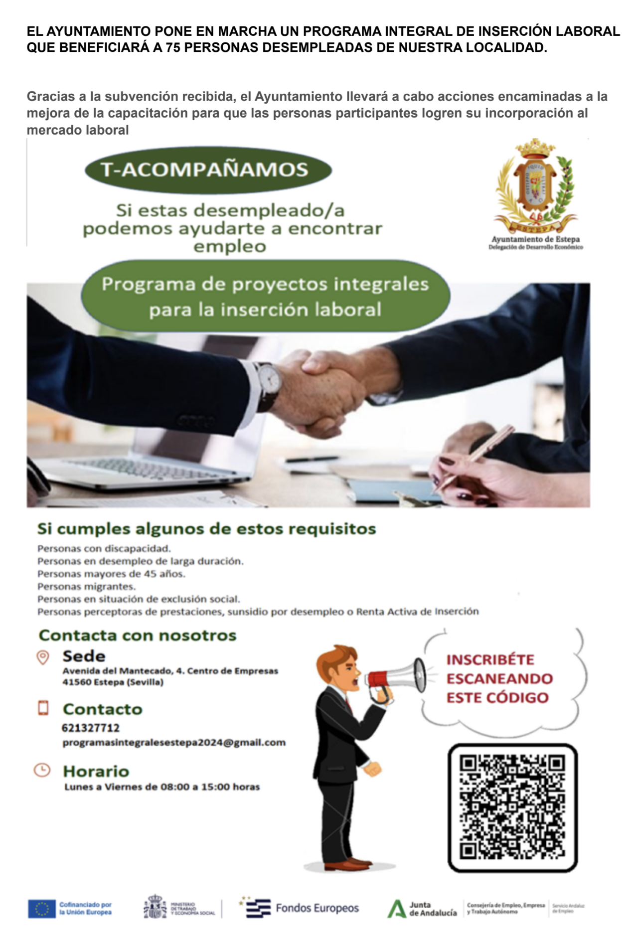 EL AYUNTAMIENTO PONE EN MARCHA UN PROGRAMA INTEGRAL DE INSERCIÓN LABORAL QUE BENEFICIARÁ A 75 PERSONAS DESEMPLEADAS DE NUESTRA LOCALIDAD.