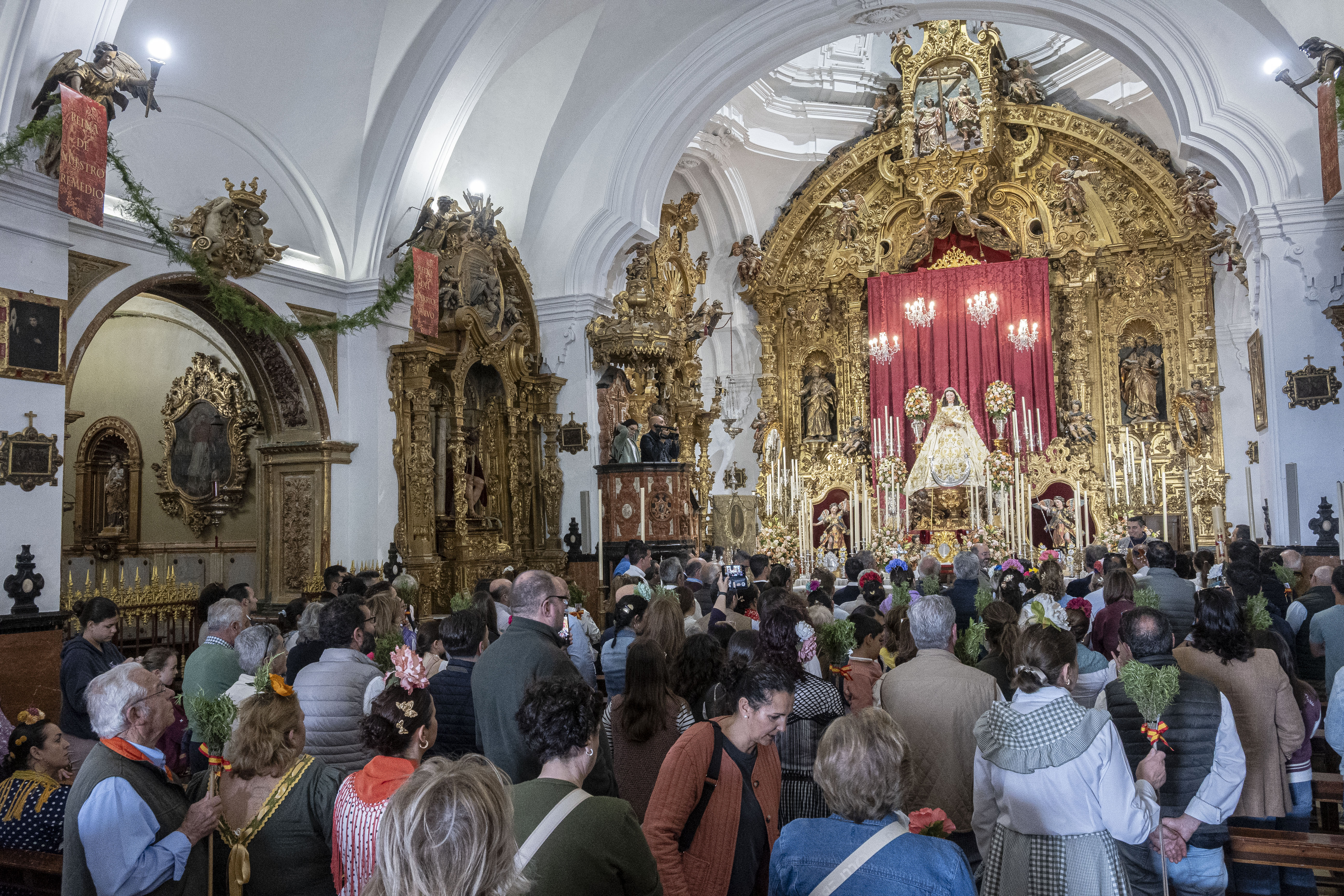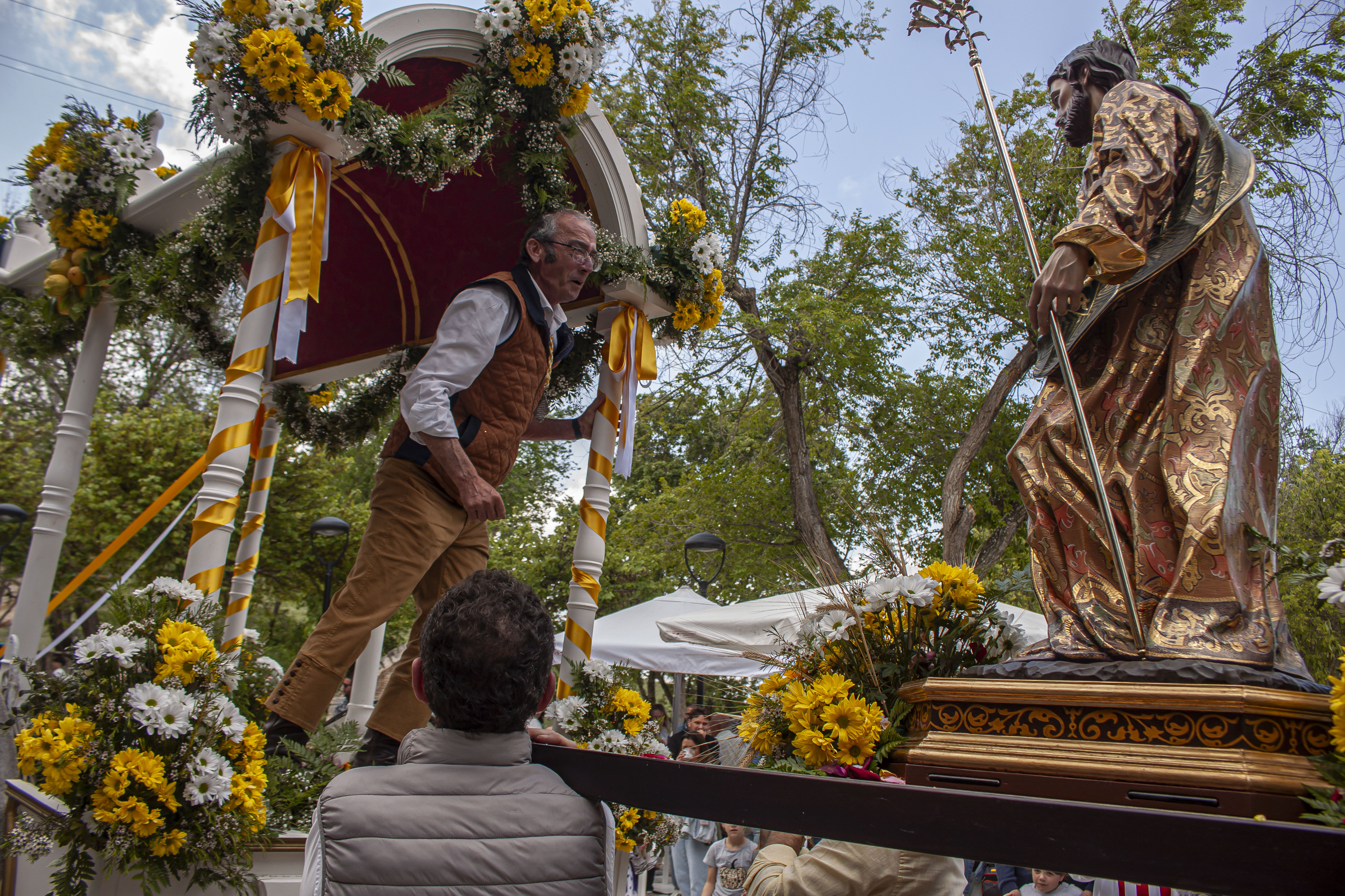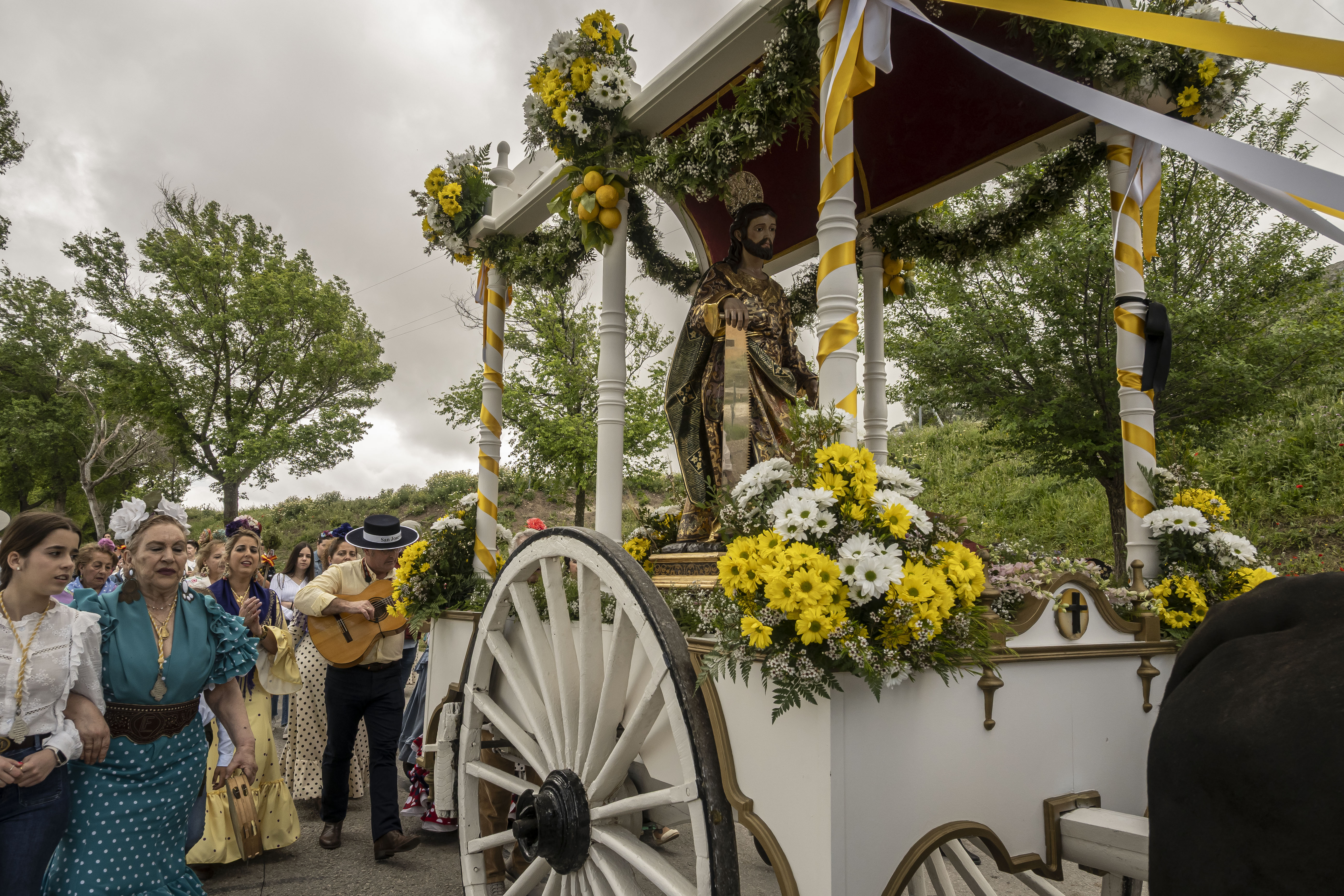 El cortejo de la carroza de San José, con toda la presidencia de la hermandad de Ntra. Sra. de las Angustias, han entrado en el tempo de Los Remedios, donde han sido recibidos por la hermandad de Ntra. Sra. de los Remedios y su hermano mayor, Antonio Martín, que este año están de celebración por la coronación de la Virgen el próximo sábado 3 de mayo.