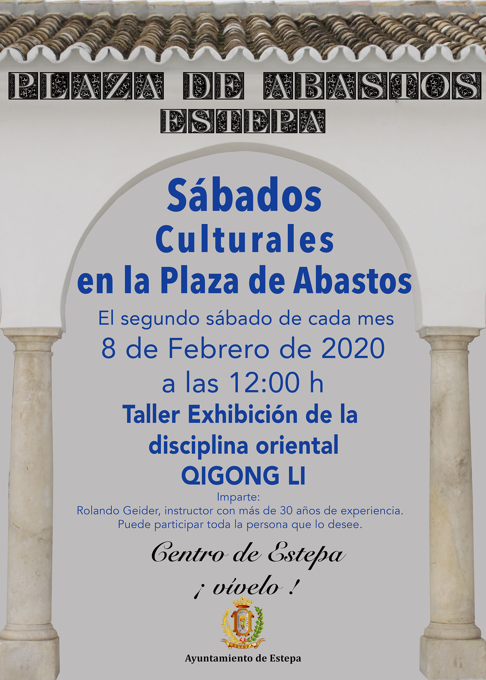 Estepa, 31 de Enero de 2020 El ayuntamiento de Estepa se ha marcado como objetivo prioritario devolver la vida al casco histórico de la localidad. Hace años, el centro histórico era el centro comercial de Estepa y se quiere volver a dotar de actividad, devolviendo a la Plaza de Abastos el protagonismo que tenía. La reapertura de la plaza de abastos tras su rehabilitación, después de varios años cerrada, fue el comienzo de este proyecto por recuperar el centro histórico de la localidad. Ya se han licitado varios puestos y se han adjudicados algunos de ellos, mientras están pendientes de resolución otros. Además, se ha organizado una programación de actividades con el fin de que vecinos y vecinas acudan también al centro durante el fin de semana. El ayuntamiento está coordinando y apoyando todas las iniciativas que llegan para dinamizar este espacio. Este sábado 1 de febrero y todos los primeros sábados de mes, se desarrollará el Mercado de Artesanía y Antigüedades, donde podremos encontrar joyería, bisutería, flores en porcelana, pintura, cerámica, dibujos, escultura, alta perfumería, complementos y ropa caballero, niño y señora, amigurumis, detalles de Estepa, jabones ecológicos y veganos, miel, quesos, arcilla polimérica y animación infantil, pero sobre todo, arte... mucho arte. Los segundos sábados de mes se utilizará la plaza como punto de encuentro cultural, por ello, se han previsto diferentes actividades que comenzarán el 8 de febrero, con una exhibición de la disciplina oriental QIGONG LI. Rolando Geider será el responsable de la exhibición de esta disciplina oriental, vinculada a la medicina tradicional china y cuyo objetivo es la prevención de enfermedades.