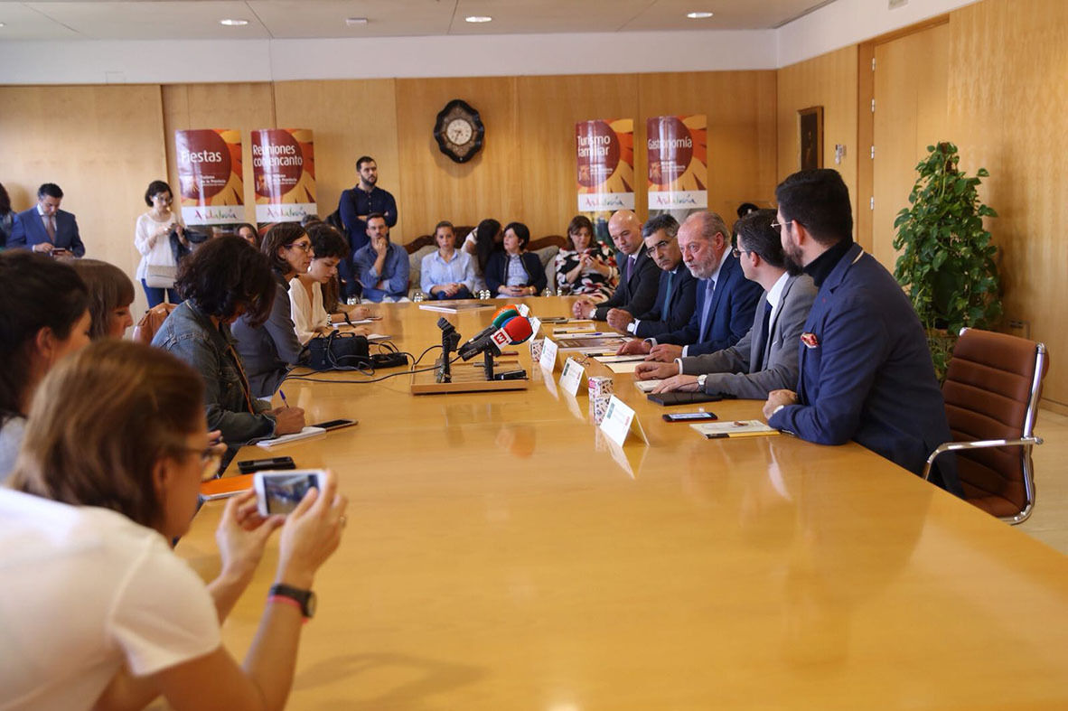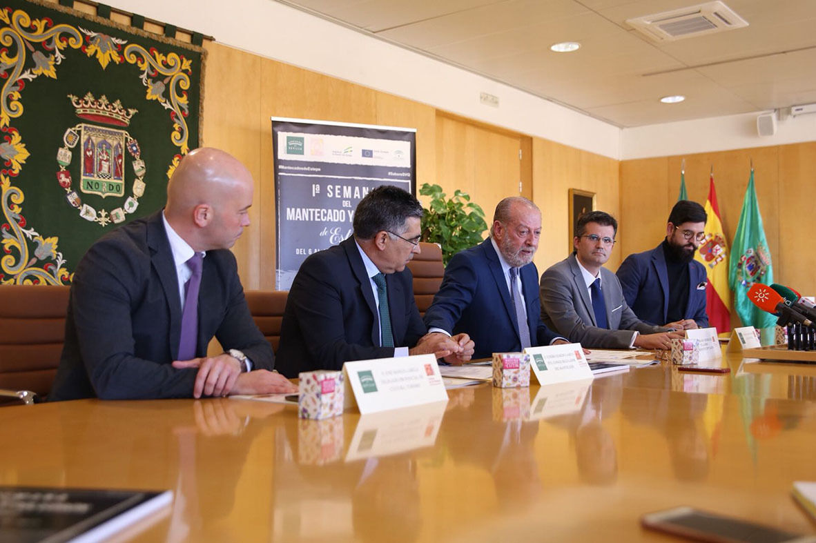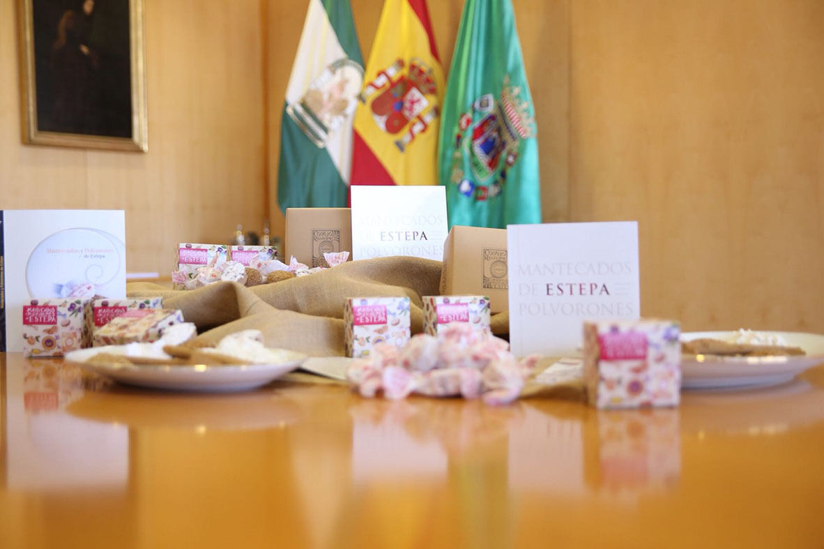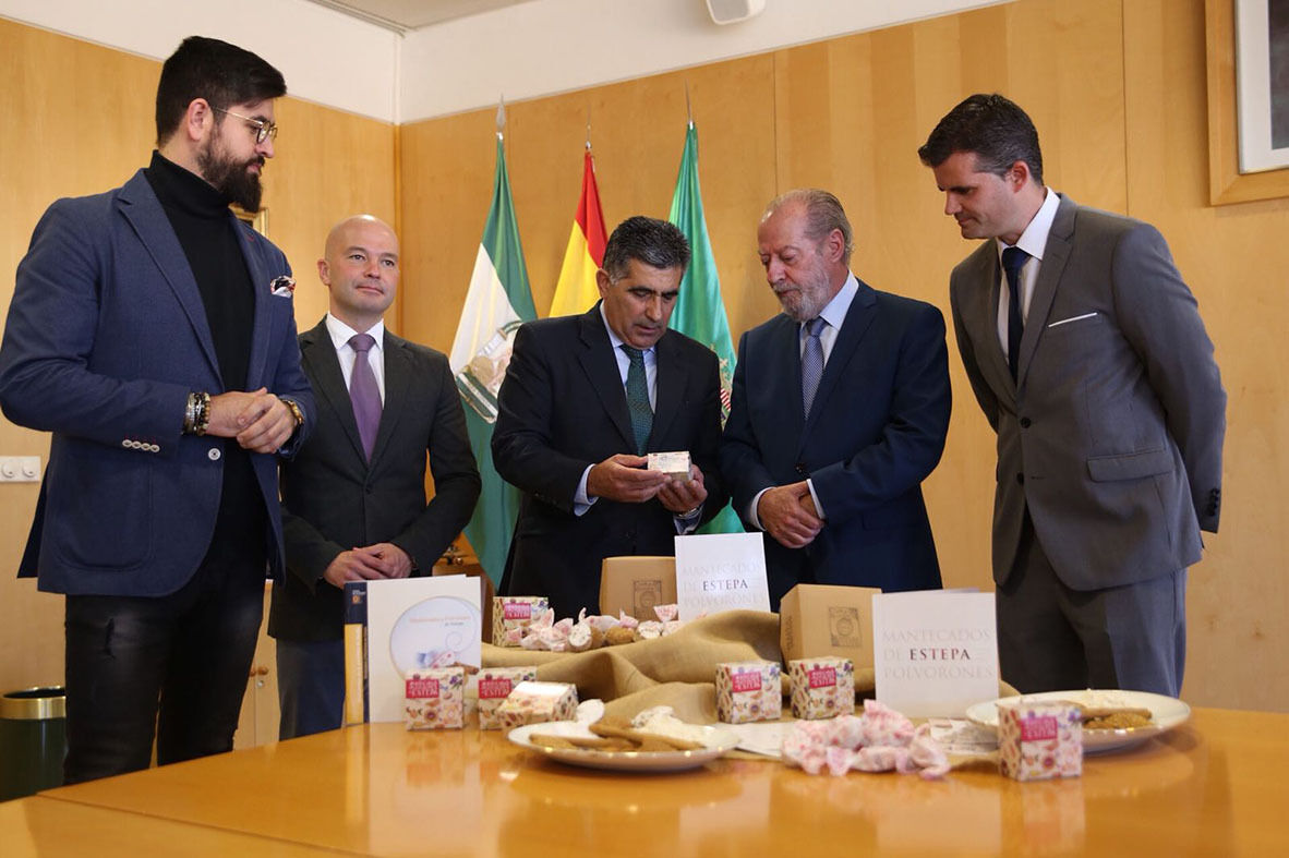 El alcalde de Estepa Antonio Jesús Muñoz y el Presidente del Consejo Regulador de la IGP Mantecados y Polvorones de Estepa, Eusebio Olmedo han estado en la mesa que ha presidido Fernando Rodríguez Villalobos, presidente de la Excma. Diputación Provincial de Sevilla.