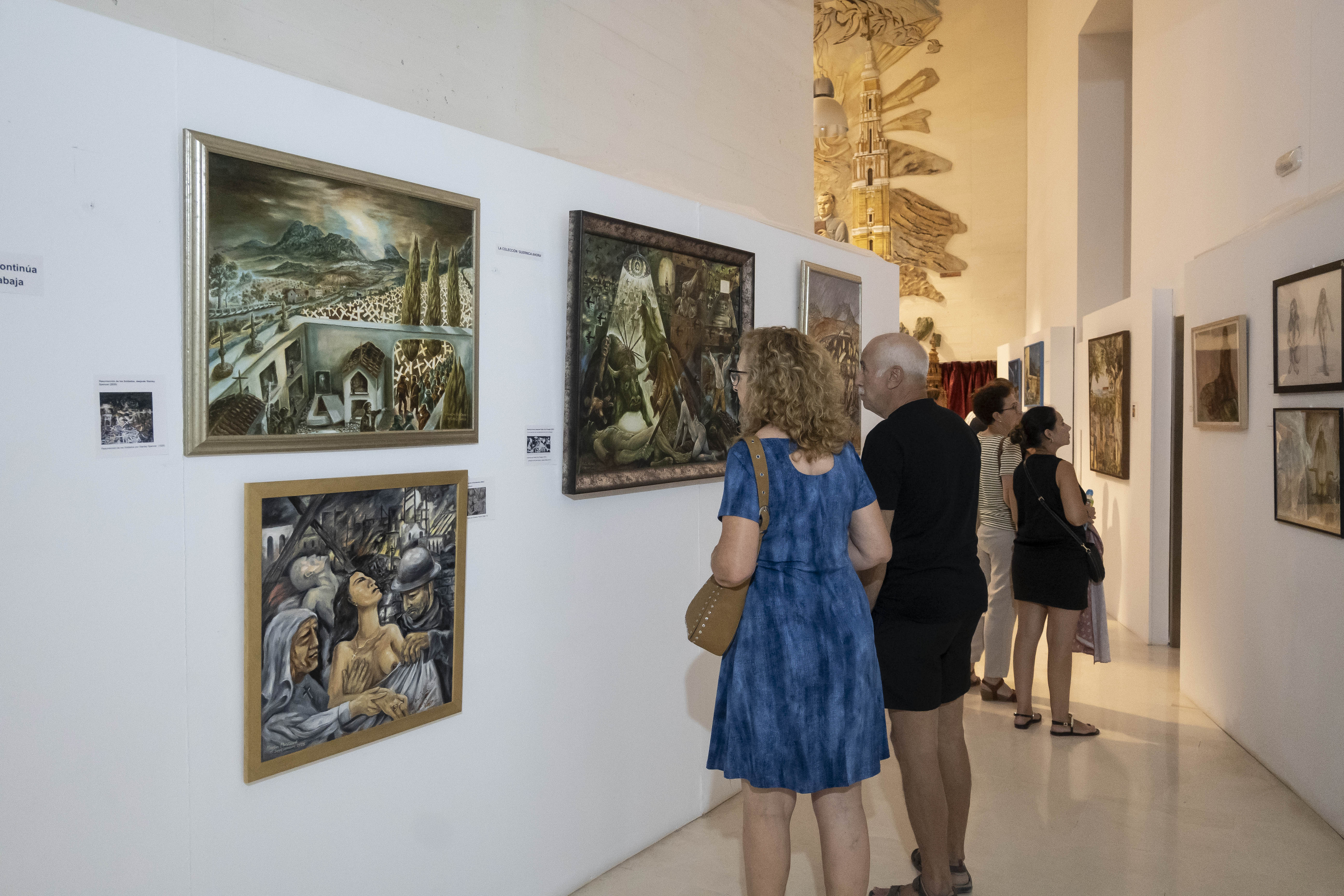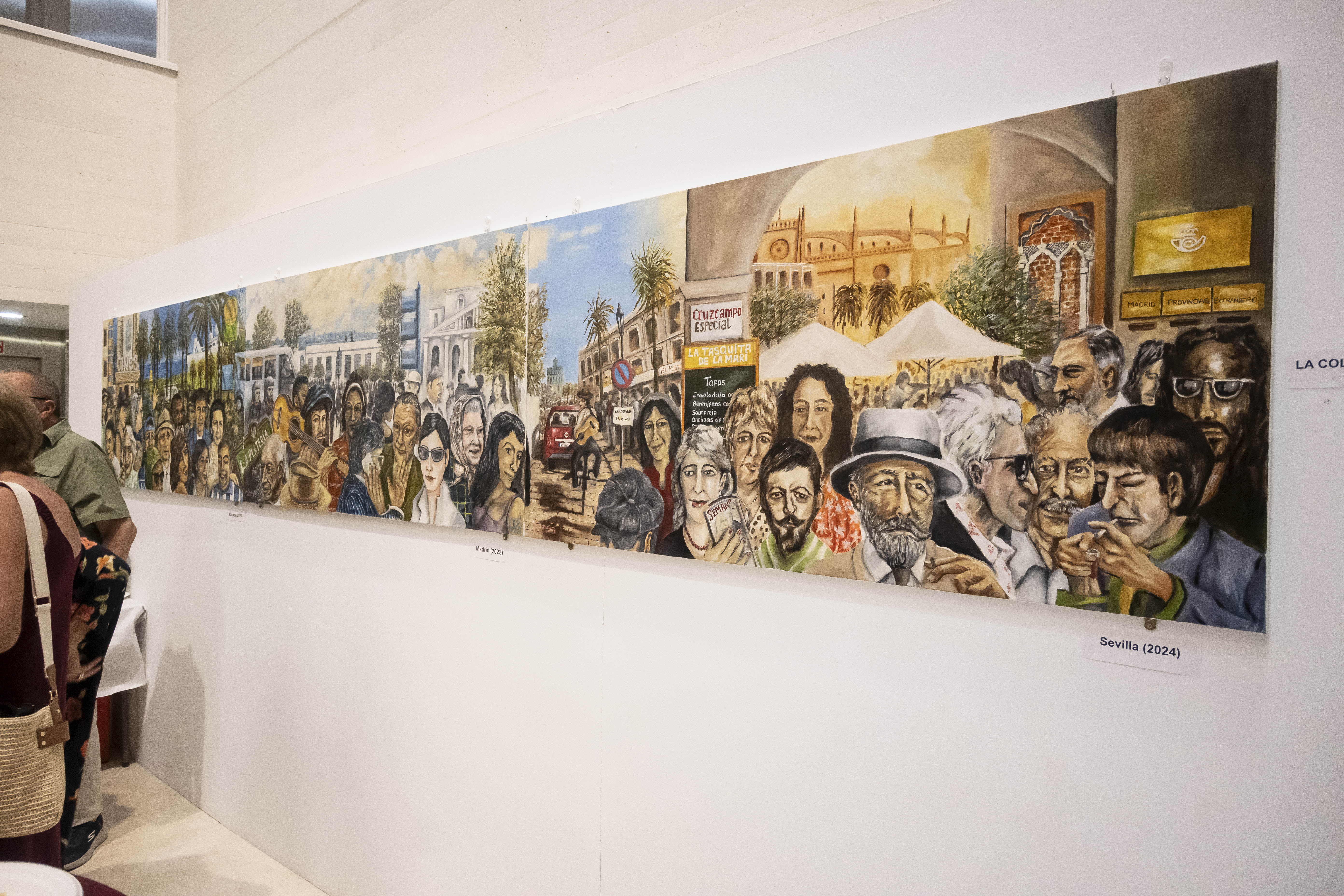 La exposición reúne seis colecciones con temáticas diversas: desde un tríptico dedicado a Sevilla, Madrid y Málaga, hasta escenas de aceituneros en el campo, el mar y la luna, o la crueldad de la guerra.