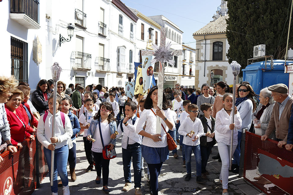 Lo que comenzó hace años como una actividad escolar se ha convertido en una muy noble y digna procesión de Semana Santa o también conocida como la Procesión Infantil del Viernes de Dolores. Todo un previo a la Semana Mayor de Estepa, este acto lúdico, festivo y religioso que mantiene desde hace años ya el colegio de Santa Teresa de Estepa. Con banda de tambores y flautas, interpretando marchas cofrades por las calles de Estepa. Televisión Española ha querido estar presente también en esta procesión, que además ha contado con la grabación de una escena para la película INRI que MELIÉS Producciones está ultimando ya sobre la fiesta de la Semana Santa en Estepa. El paso de la procesión ha sido presidida, a su paso por el Ayuntamiento, por la delegada de Festejos Mª José Amador, la delegada de Educación Belén Martín y el director del colegio Manuel Caro.