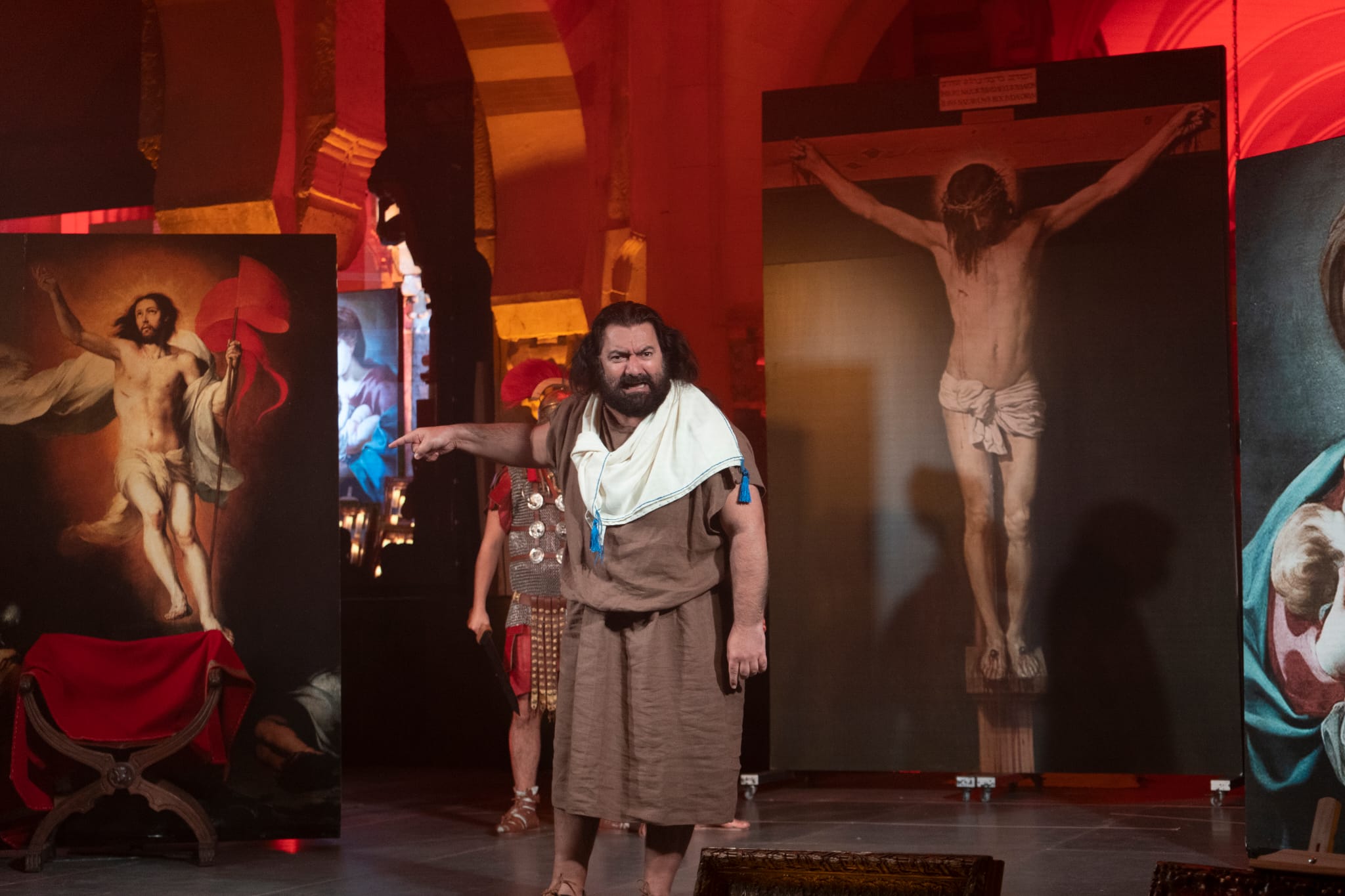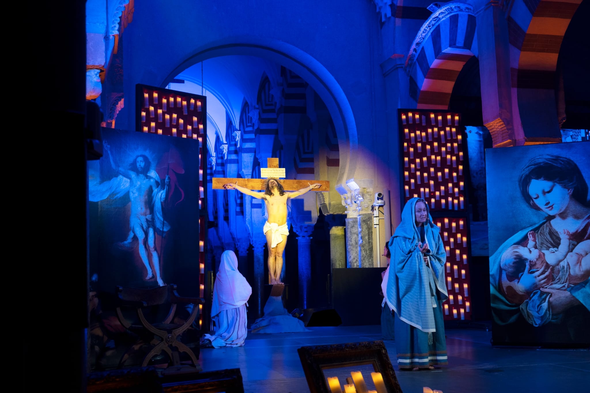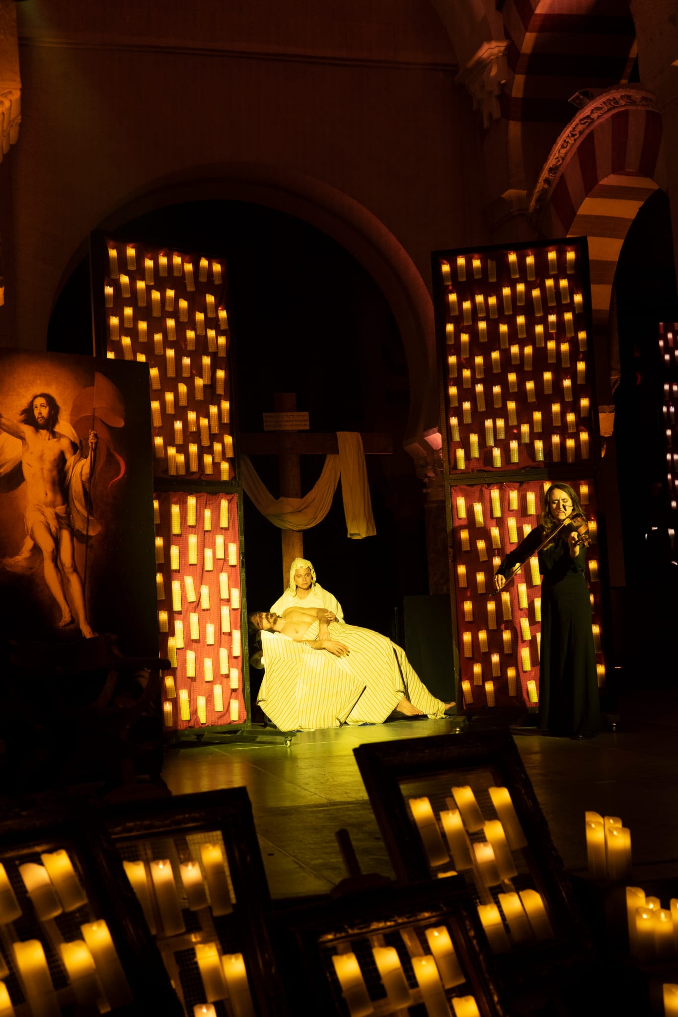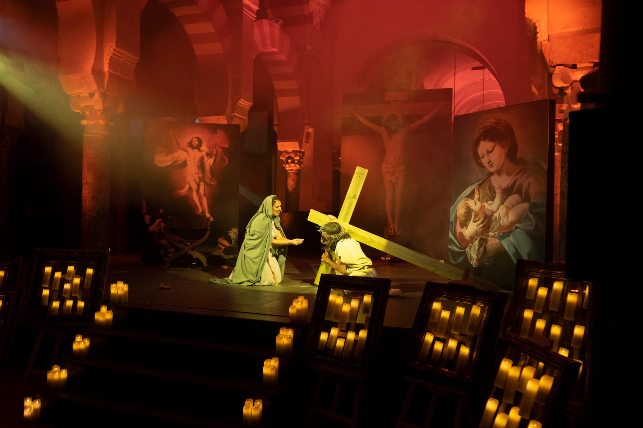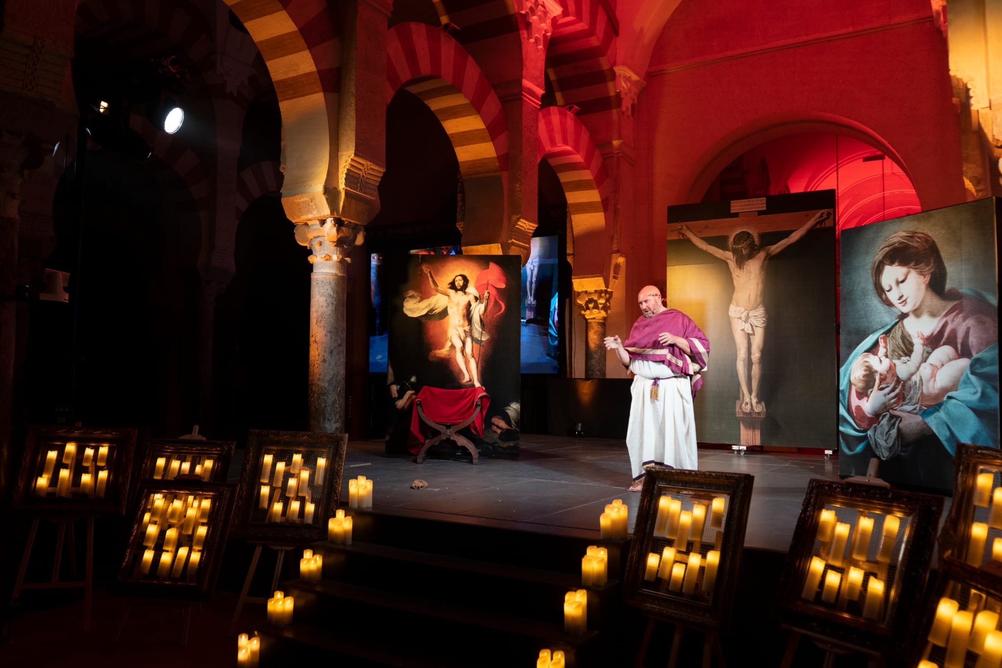 Una historia que sucede en una escenografía realizada con una selección de obras de Arte de autores como Goya, Velázquez, Murillo o El Greco. Todo alumbrado bajo la luz atenta de las velas y con una selección de marchas procesionales adaptadas e interpretadas con piano, violín, viola y trompeta.
