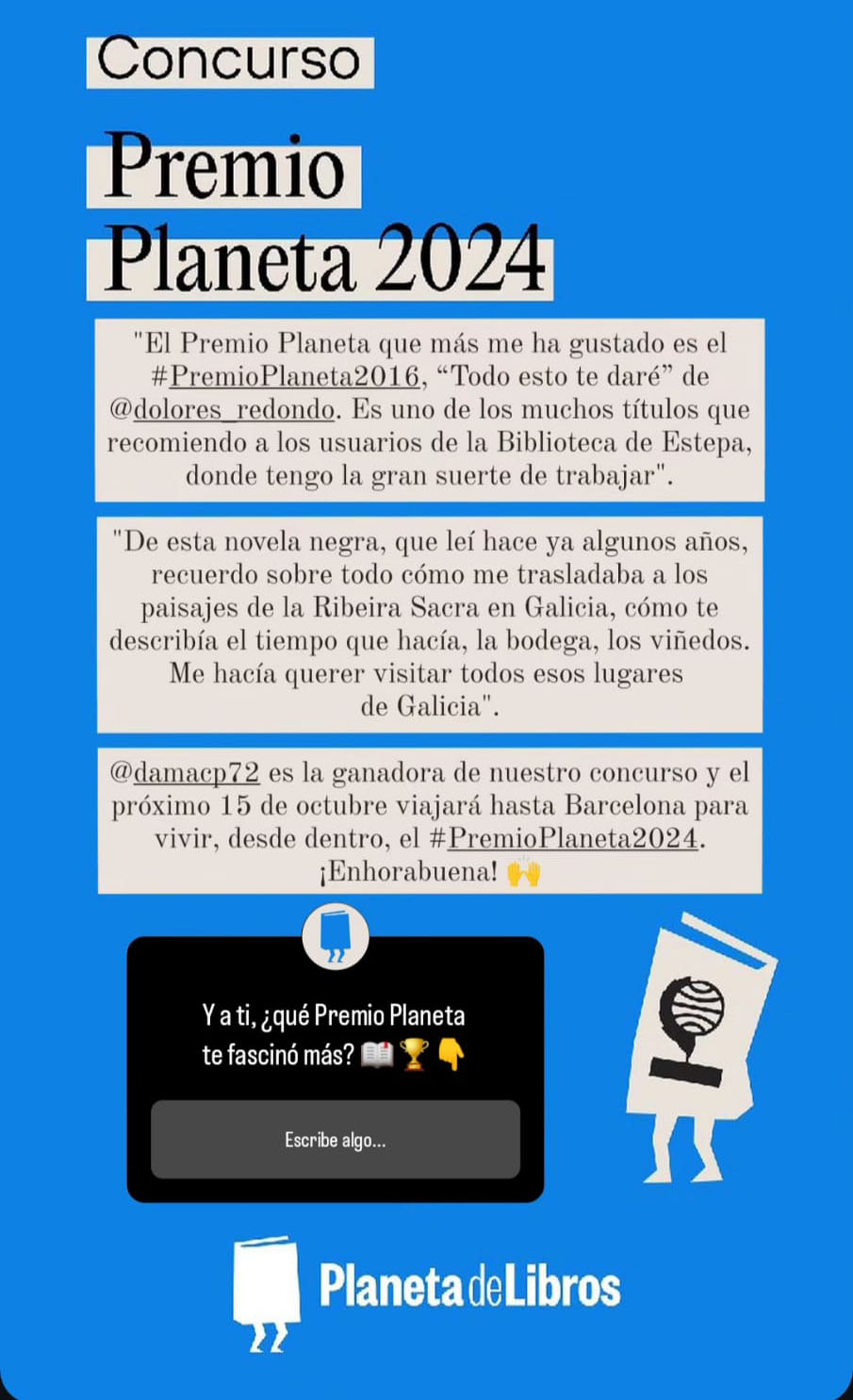 Dama fue seleccionada por la organización de los Premios Planeta para asistir a este magnífico evento en representación de trabajadores del mundo de libro y la lectura en general tras un concurso que celebra el grupo Planeta cada año para invitar a personas del mundo de la cultura a este, tan magno evento.