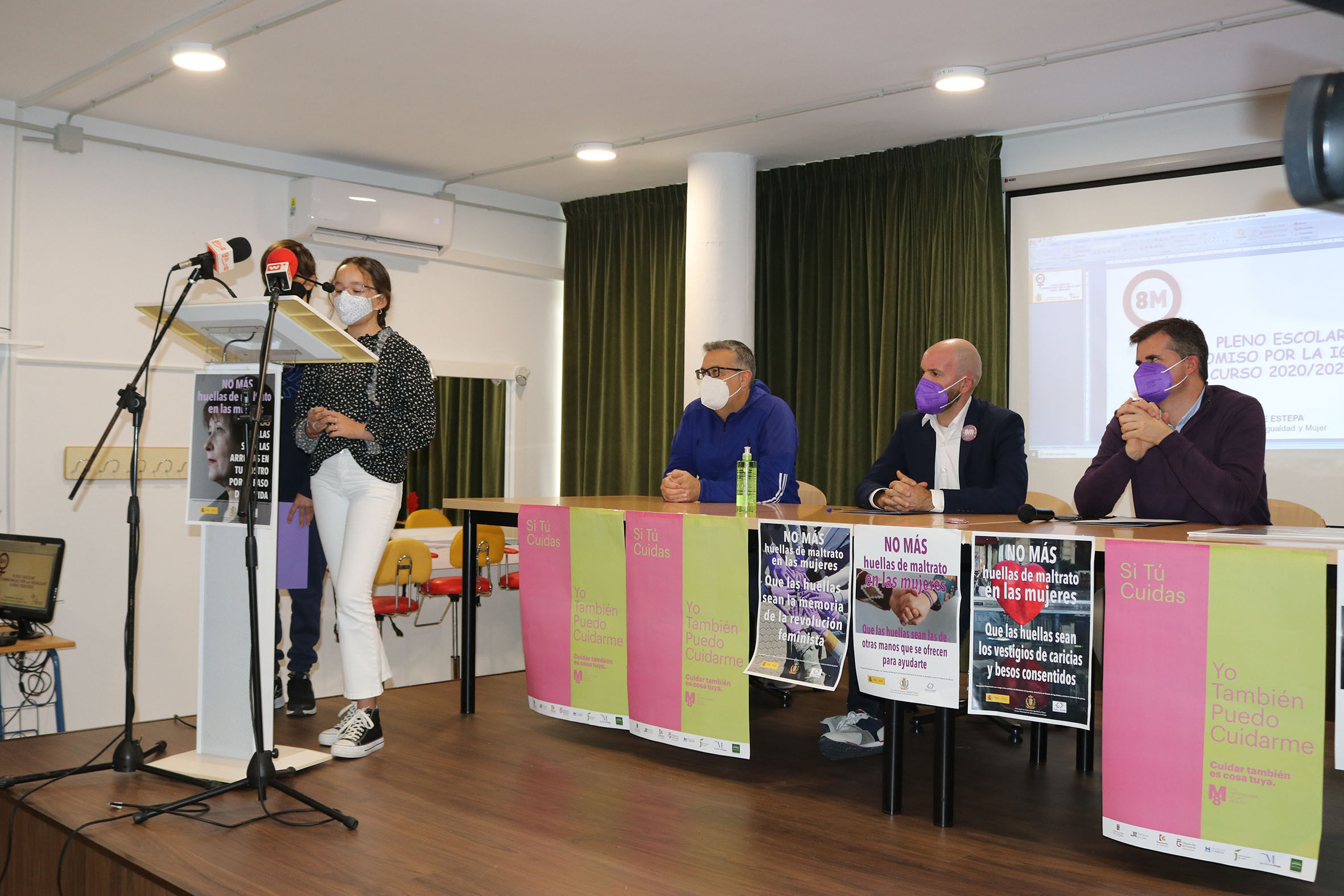Los actos de celebración del 8M en Estepa han comenzado con un Pleno escolar en el que alcalde y concejales han estado arropados por alumnas y alumnos de 6º de la ESO del colegio de Ntra.Sra. de los Remedios de Estepa.
