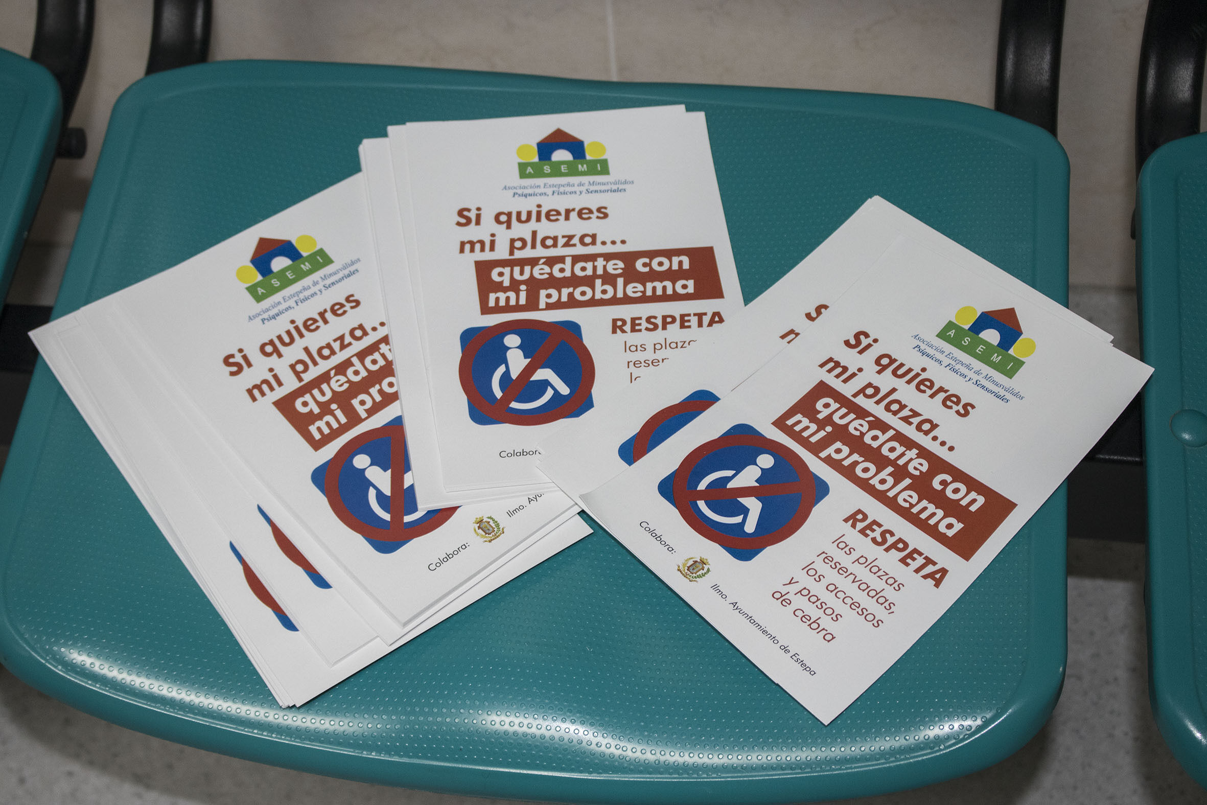 Este año desde nuestro Ayuntamiento hemos querido colaborar con una campaña organizada por ASEMI, en la que se pone de manifiesto la importancia de respetar los aparcamientos reservados para personas con discapacidad. Es una cuestión de civismo, respeto y empatía y por ello este año hemos querido poner el acento en este aspecto. Se ha hecho entrega a ASEMI de una serie de octavillas con mensaje para concienciar a la ciudadanía de la importancia de no ocupar las plazas para personas con movilidad reducida.