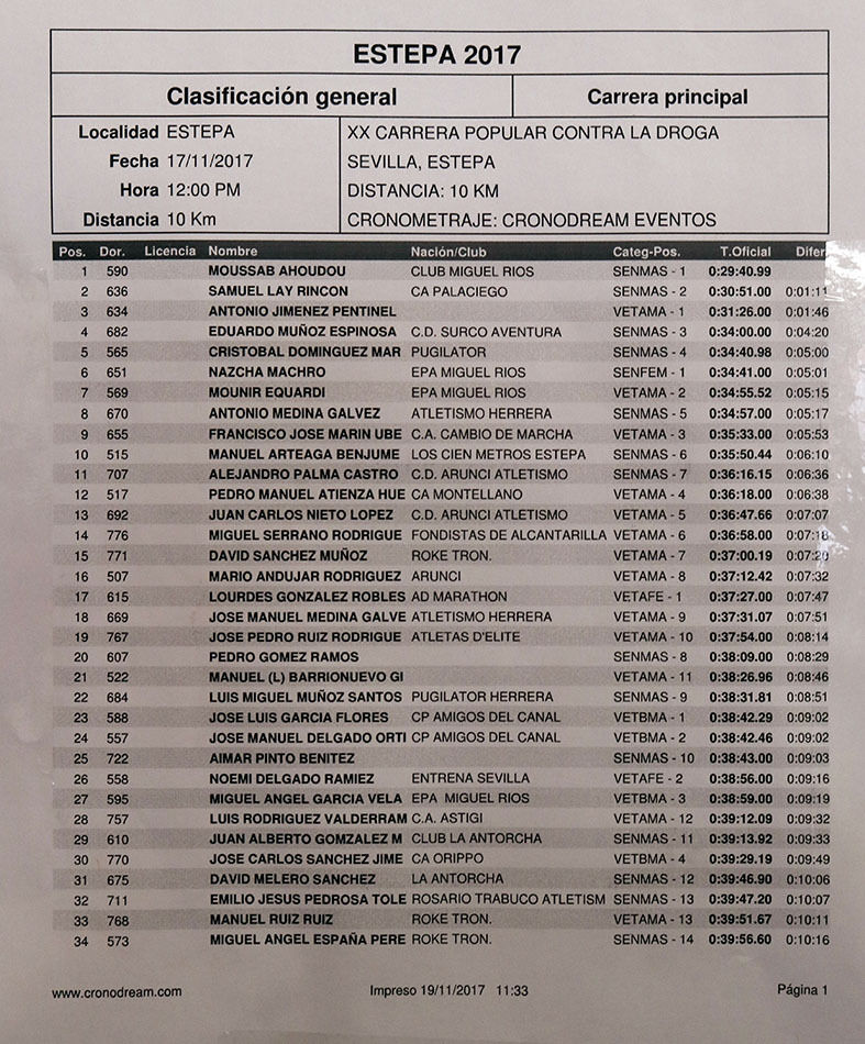 A las diez y media en punto se daba la salida a la prueba de adultos en la que competían categorías Seniors y Veteranos, masculinos y femeninos. Los resultados serán publicados de forma oficial en la web del Club de Atletismo Los 100 Metros co-organizador de la prueba junto con el Ayuntamiento de Estepa. El alcalde Antonio Jesús Muñoz y el concejal de Deportes, Manuel Rodríguez, han hecho entrega de los trofeos a los ganadores. Salvador Escamilla, presidente del Club ha mostrado también su satisfacción por la prueba.