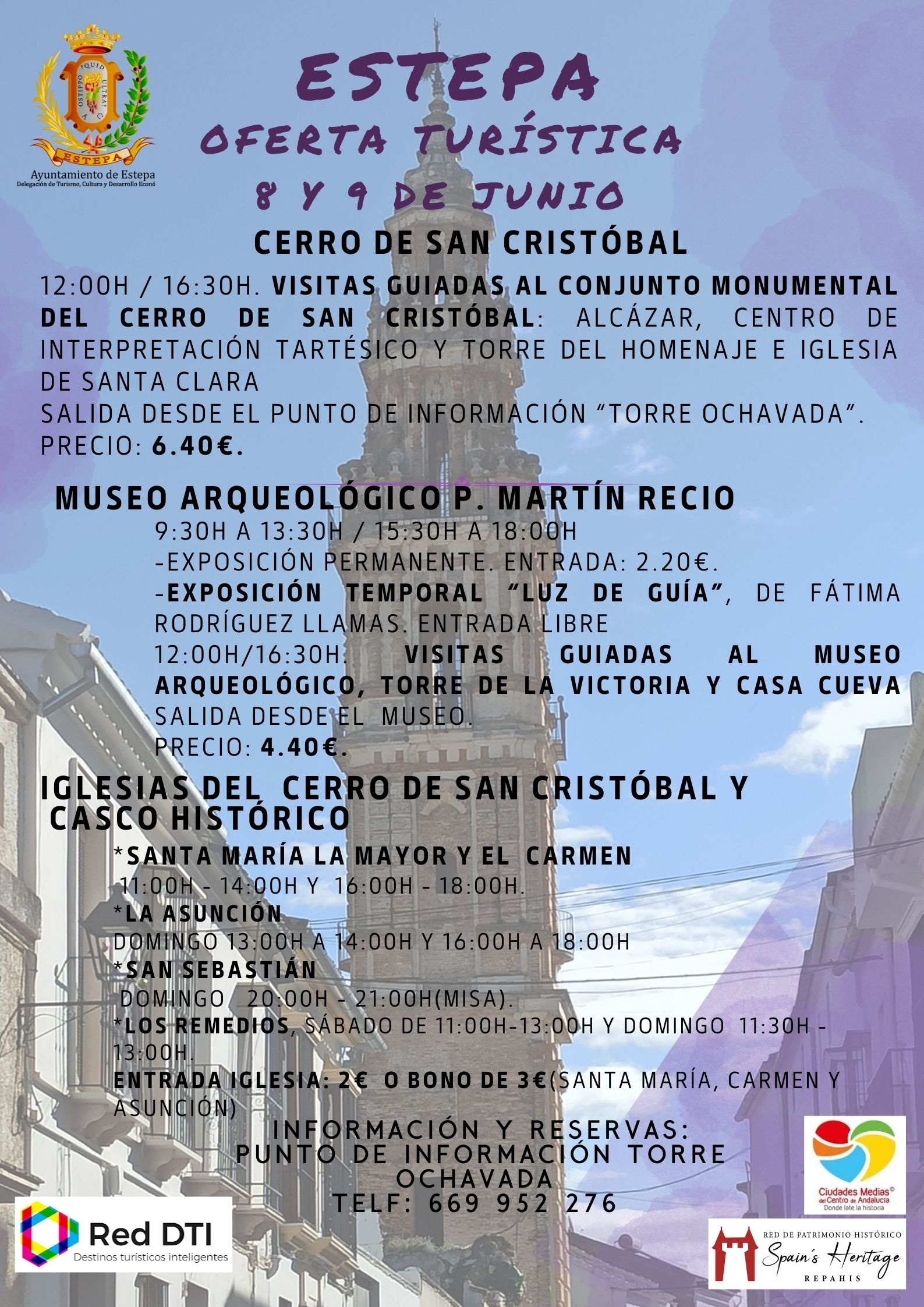 12:00h / 16:30: Visitas guiadas al Cerro de San Cristóbal (Alcázar, Centro de Interpretación Tartésico y Torre del Homenaje) e Iglesia de Santa Clara. (Salida desde el punto de información “Torre Ochavada)”. Precio 6.40€