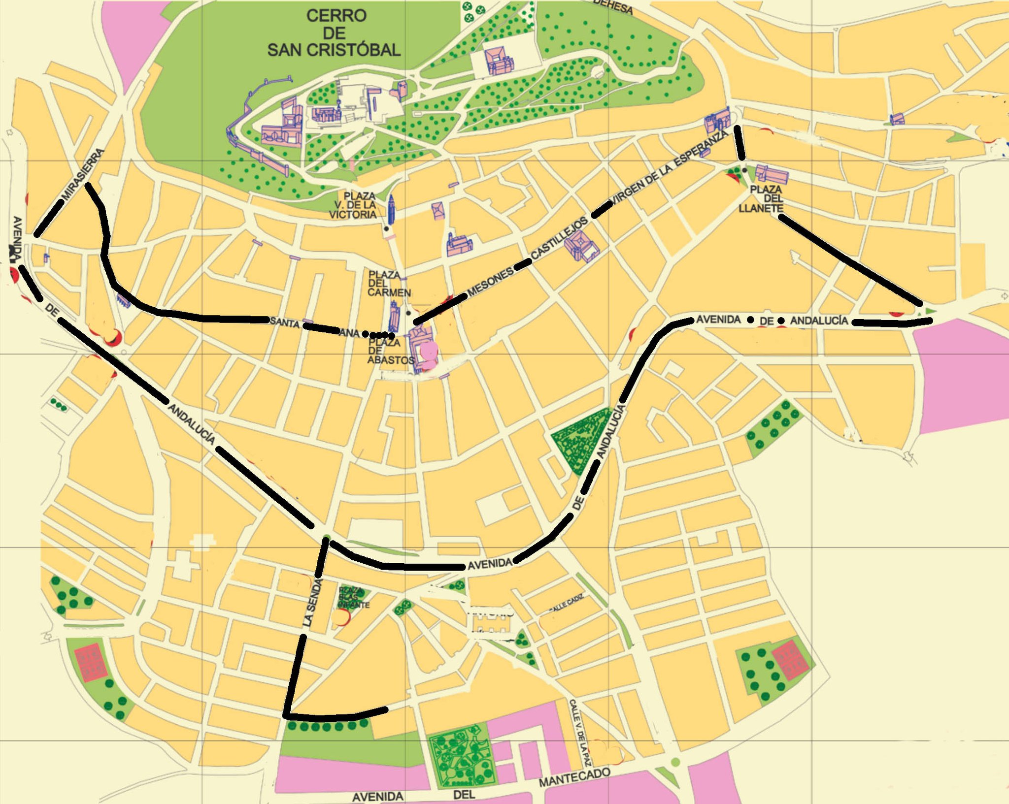 Caseta Municipal, Calle La Senda, Avenida de Andalucía, Avenida de los Centurión, Plaza del LLanete, Plaza de los Remedios, Calle Virgen de la Esperanza, Calle Castillejos, Calle Mesones, Plaza del Carmen, Calle Santa Ana, Plaza Poley, Plaza de la Coracha, Calle Mirasierra, Avenida de Andalucía (Estación Autobuses).