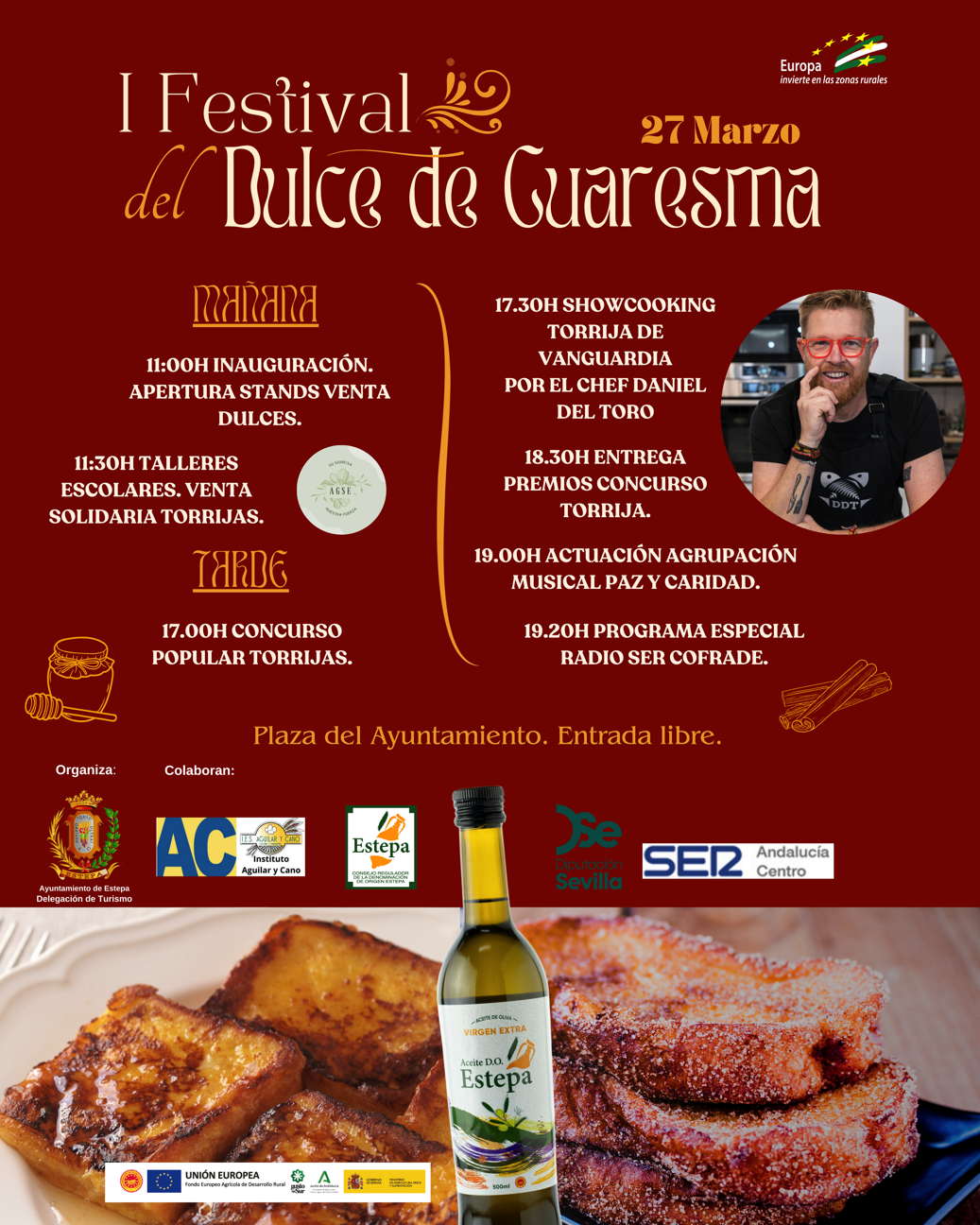 premio especial de Aceite de Oliva Virgen Extra con Denominación de Origen Estepa. A continuación, a las 17:30 horas, el prestigioso chef Daniel del Toro ofrecerá un espectacular showcooking, reinterpretando la tradicional torrija con un toque innovador y vanguardista.