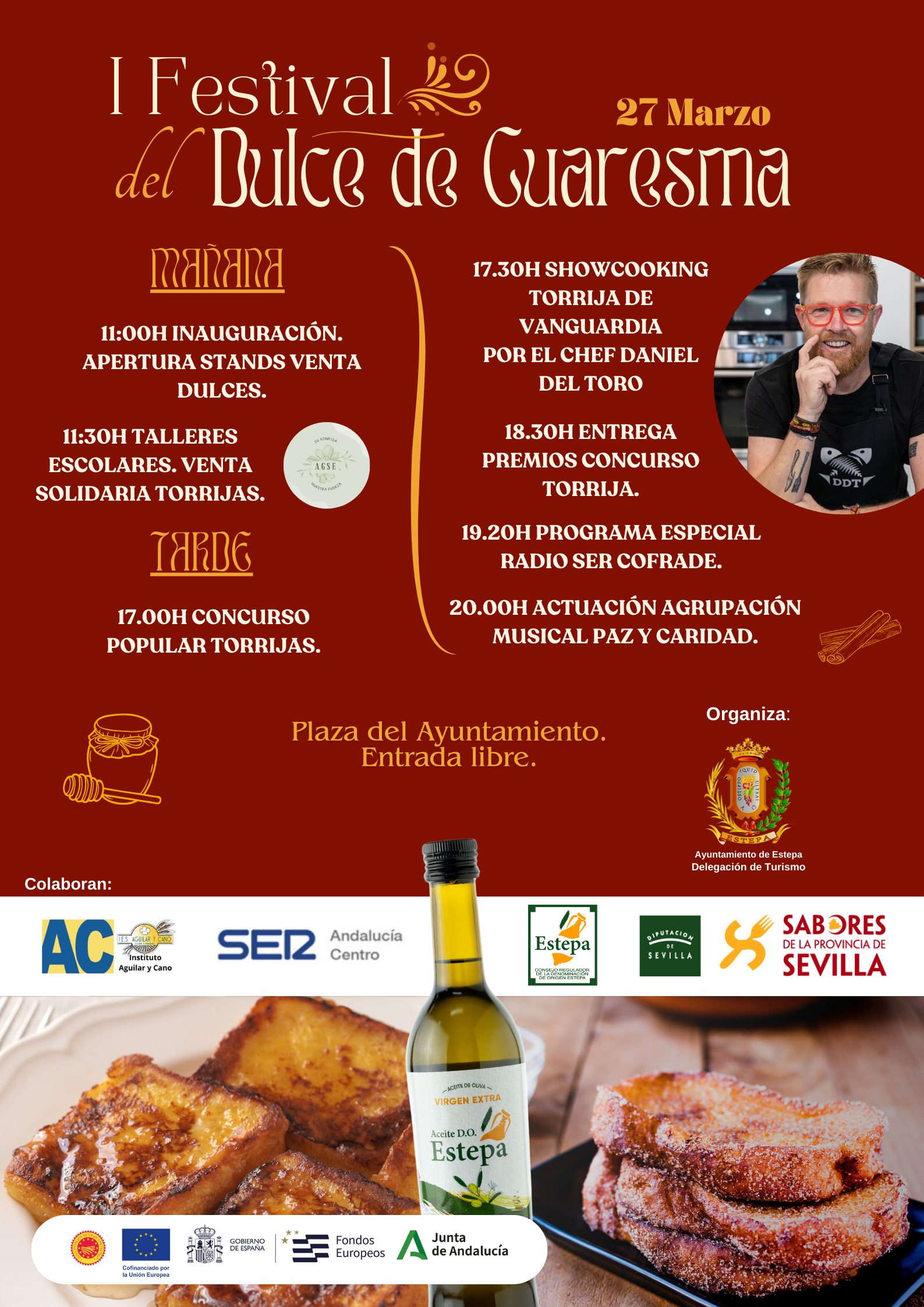 El Ayuntamiento de Estepa desde su Delegación de Turismo, organiza un Festival del Dulce de Cuaresma, un evento gastronómico que tendrá lugar el próximo jueves 27 de marzo en la Plaza del Carmen, con el objetivo de poner en valor la rica tradición repostera local en estas fechas cercanas a la Semana Santa. En esta edición, la “torrija” será la gran protagonista, elaborada por el alumnado del ciclo formativo de panadería, pastelería y confitería e industria alimentaria con nuestro Aceite de Oliva Virgen Extra de la Denominación de Origen Protegida Estepa.