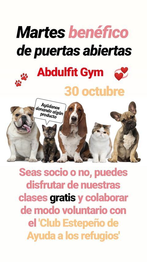 El próximo martes 30 de octubre Abdulfit Gym Estepa tendrá sus puertas abiertas para todo aquel que quiera hacer deporte, pasarlo bien y colaborar con una buena causa como son los animales