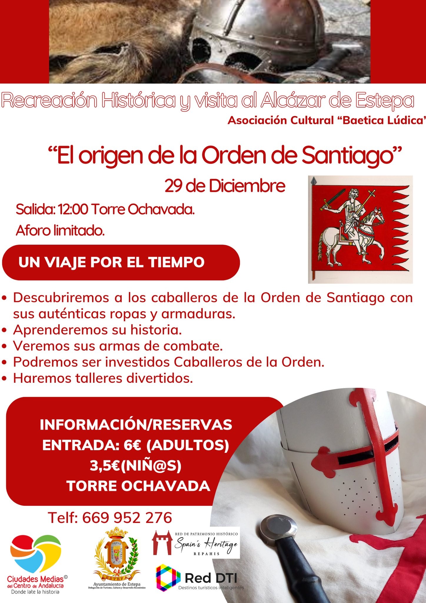 Desde la Delegación de Turismo a través de la Fundación Ciudades Medias te proponemos una actividad diferente para todos los públicos. Una recreación histórica que nos descubrirá "El Origen de la orden de Santiago" en el Alcázar de Estepa. La Asociación Cultural Baetica Lúdica nos trasladará a otra época. Podremos ver sus ropajes originales, armas de combate y podréis ser investidos Caballeros de la Orden, una forma divertida de conocer nuestra historia. También haremos talleres divertidos. Una visita recomendada para todos los públicos.