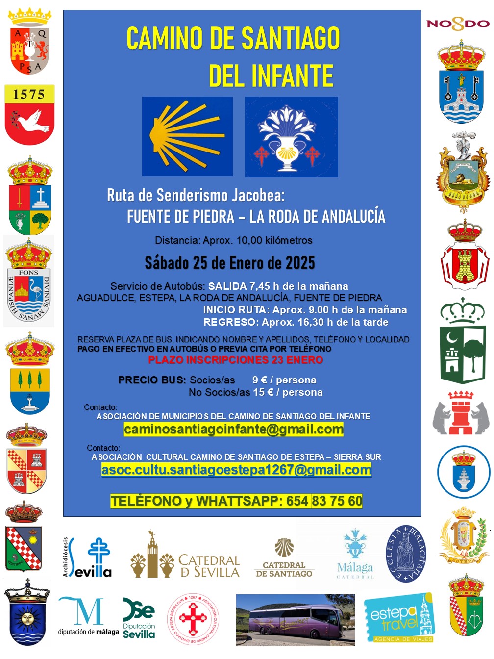 El próximo sábado 25 de enero de 2025, tendrá lugar la ruta de senderismo que conecta la localidad de Fuente de Piedra (Málaga) con el Camino de Santiago del Infante. Ruta de Senderismo de aproximadamente 10 kilómetros de distancia que separa los términos municipales de Fuente de Piedra y La Roda de Andalucía, con un nivel de dificultad fácil.