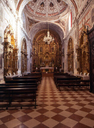 Durante el período islámico se construyó aquí una Mezquita en el s. X. Una vez reconquistada la villa en 1241, se edificó en el siglo XIV una iglesia mudéjar de la que se conservan varios arcos y pilastras. La fisonomía actual del templo en estilo gótico tardío se debe a finales del XV y XVI. Destacan como obras artísticas de interés el retablo mayor de Andrés de Ocampo, un San Juan Evangelista atribuido a Juan de Mesa, y una pila bautismal del siglo XV.