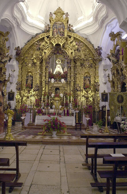 El origen de este templo fue la ermita del Cristo de la Sangre (h. 1636) cuyo benefactor fue Juan Martín Formariz. Muestra una de las portadas más emblemáticas del Barroco dieciochesco andaluz, obra de Andrés de Zabala. Su interesante camarín (h. 1714) custodia la devota Virgen del Carmen, donada por la Marquesa Leonor Mª Centurión en la segunda mitad del s. XVII.